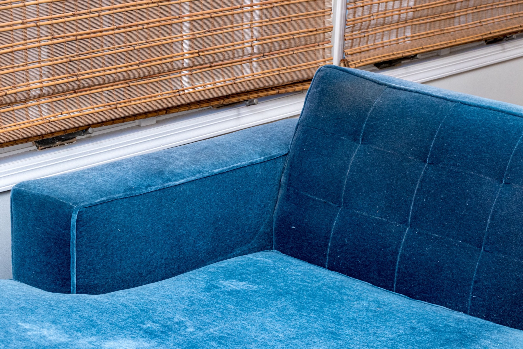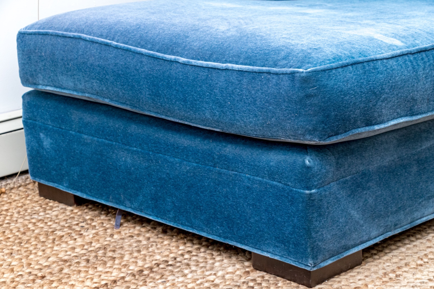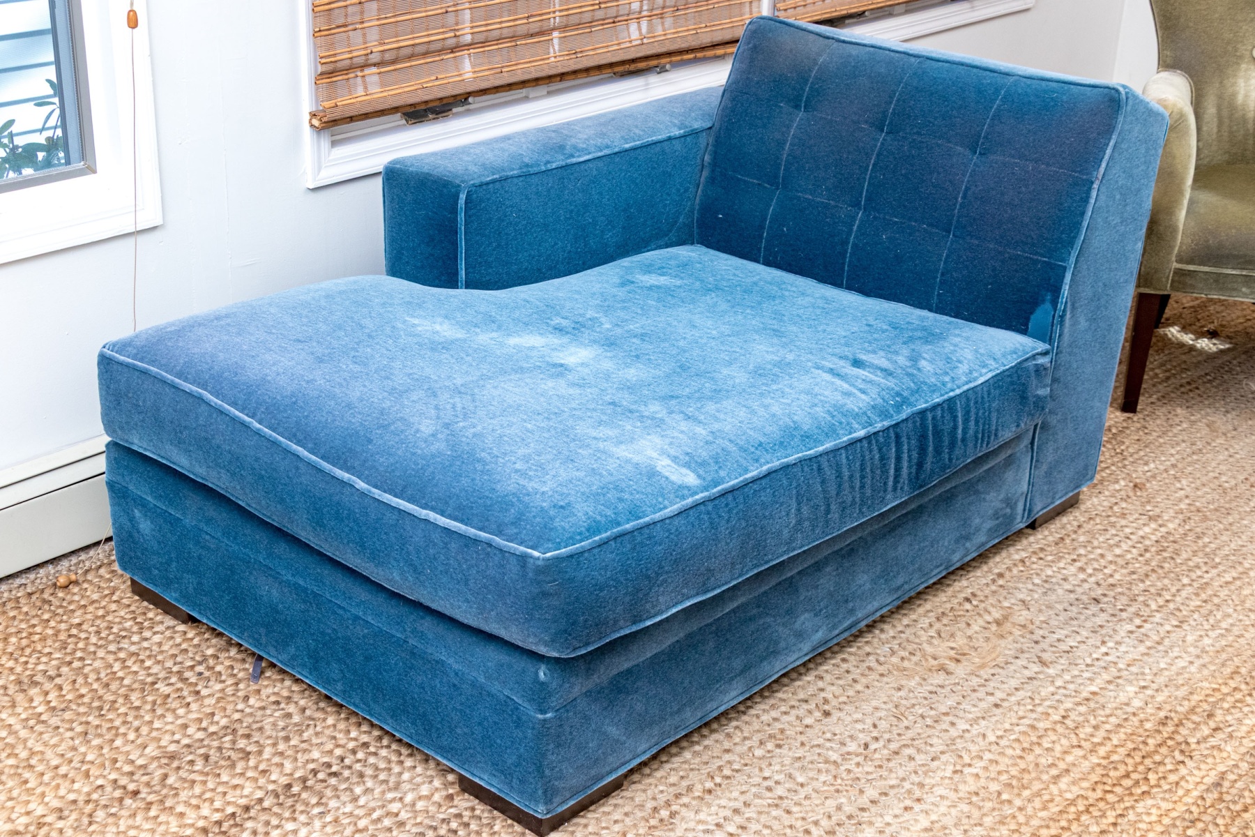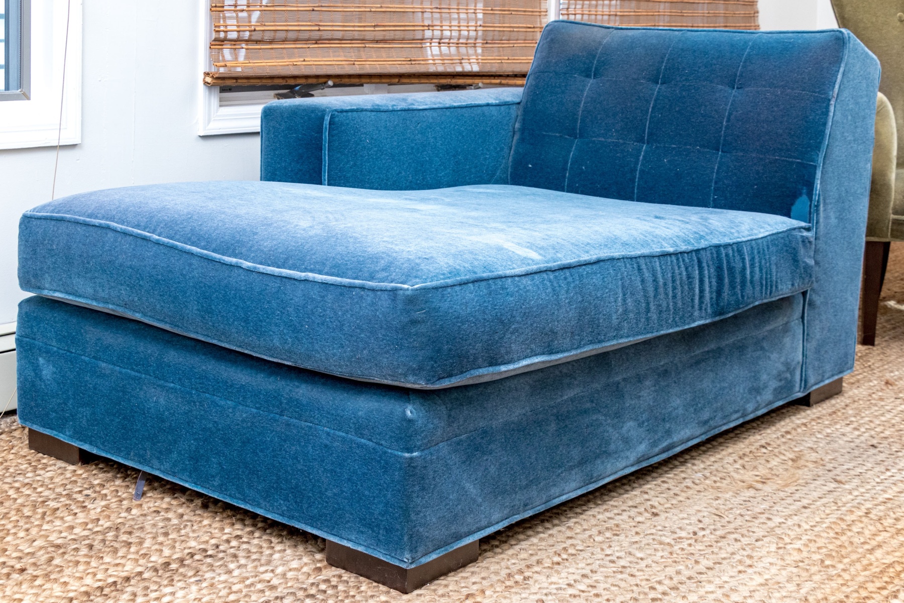 A stylish Mitchell Gold + Bob Williams "Gabriel II" chaise lounge upholstered in striking cerulean blue mohair textured fabric. The chaise features a rectangular biscuit tufted back, rail arm, and loose seat cushion with piped trims for a clean profile. Finished with a tall, sleek apron and short, dark brown feet.