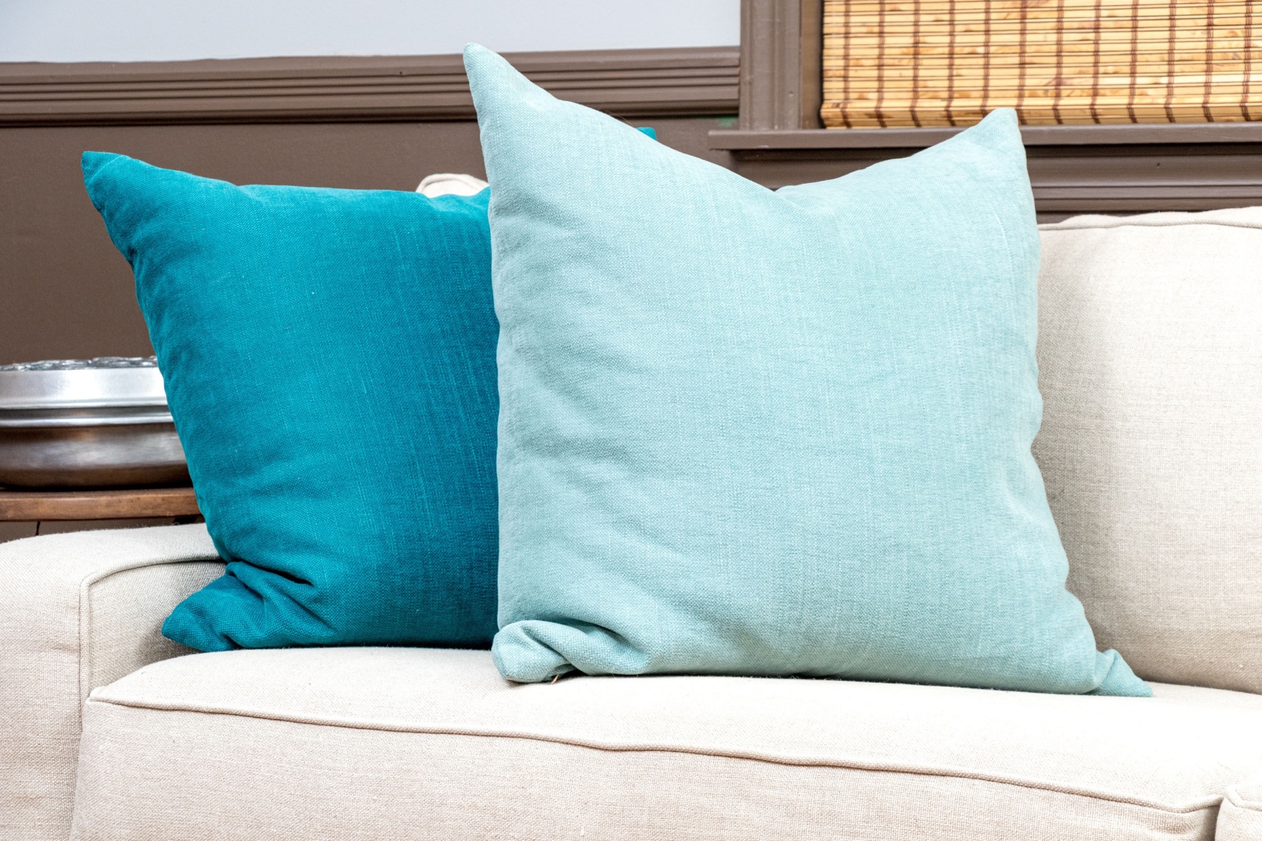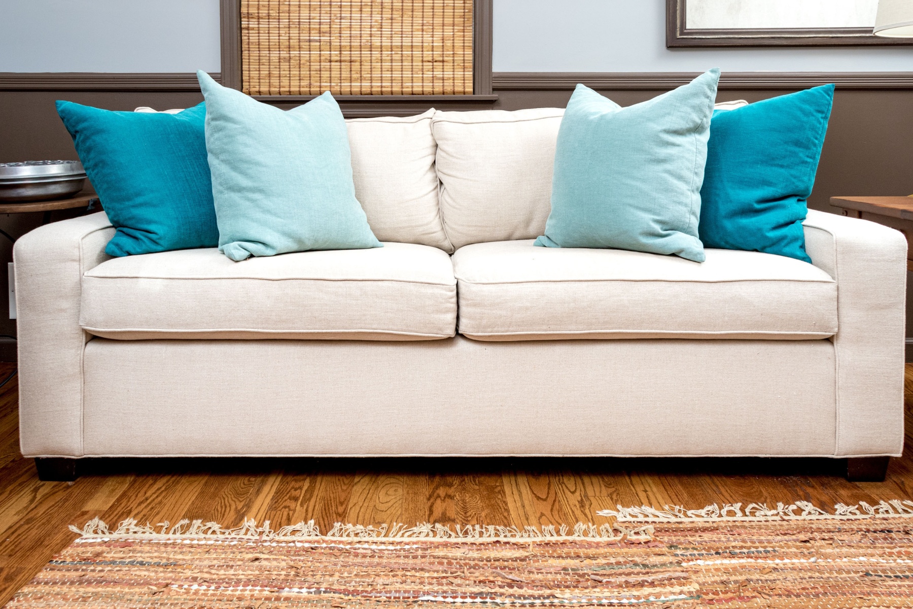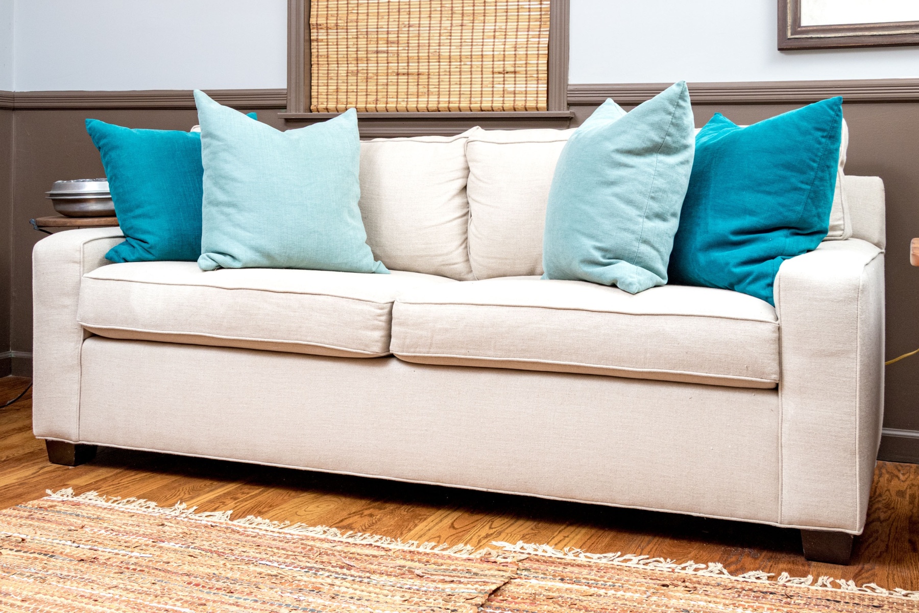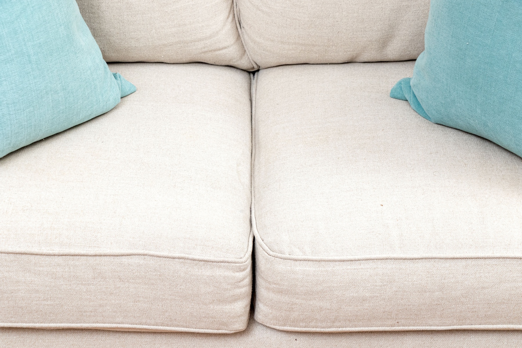 A sleek and stylish Mitchell Gold + Bob Williams loveseat sofa, perhaps the "Alex," upholstered in versatile cream white with a low wedge back, low rail arms, and tall apron supporting two loose back and seat cushions with piped trims. Topped with pairs of light aqua and cerulean blue accent pillows and raised over stout, dark brown feet.