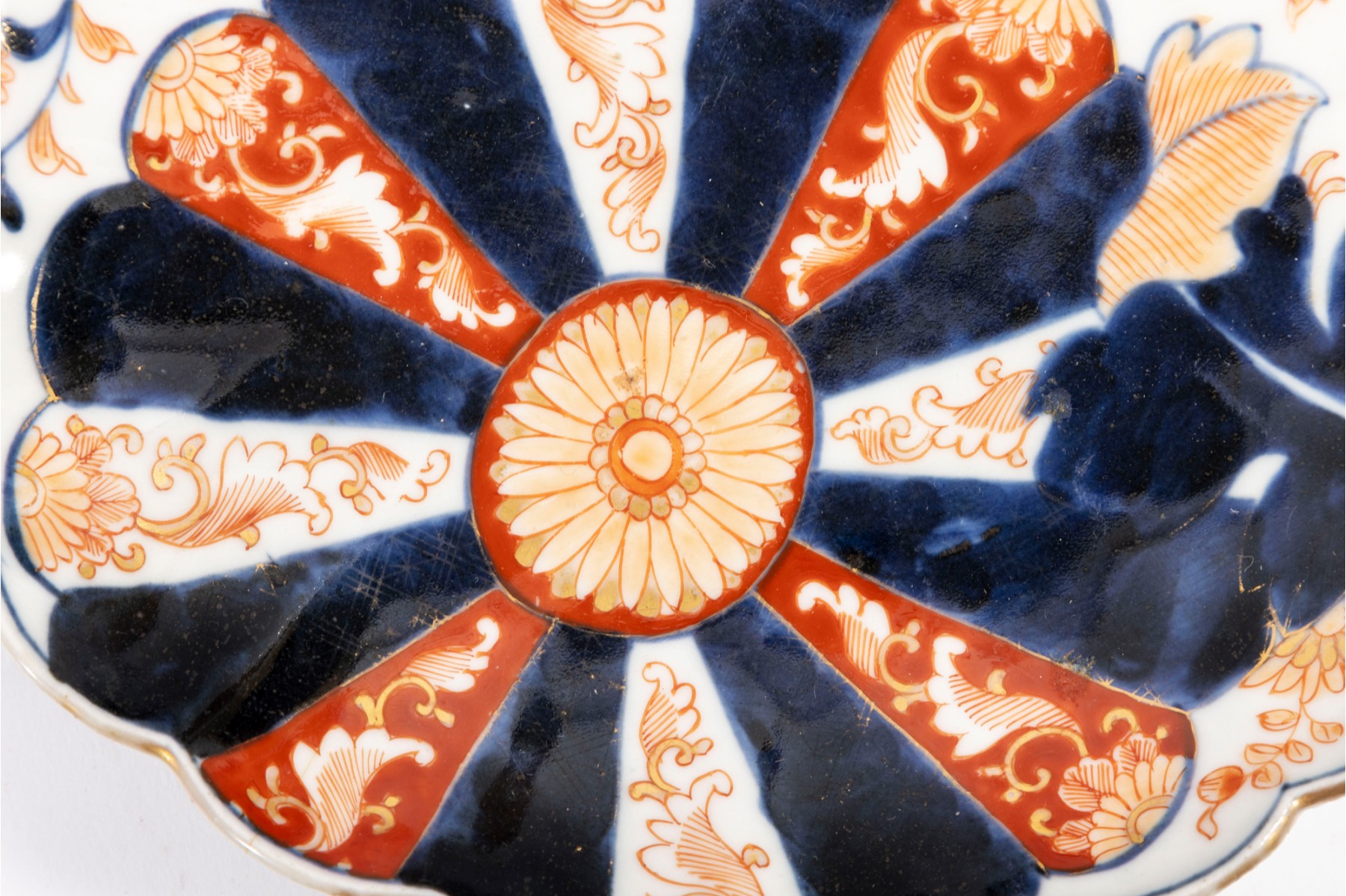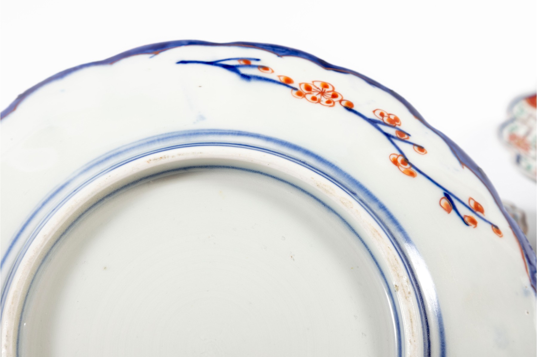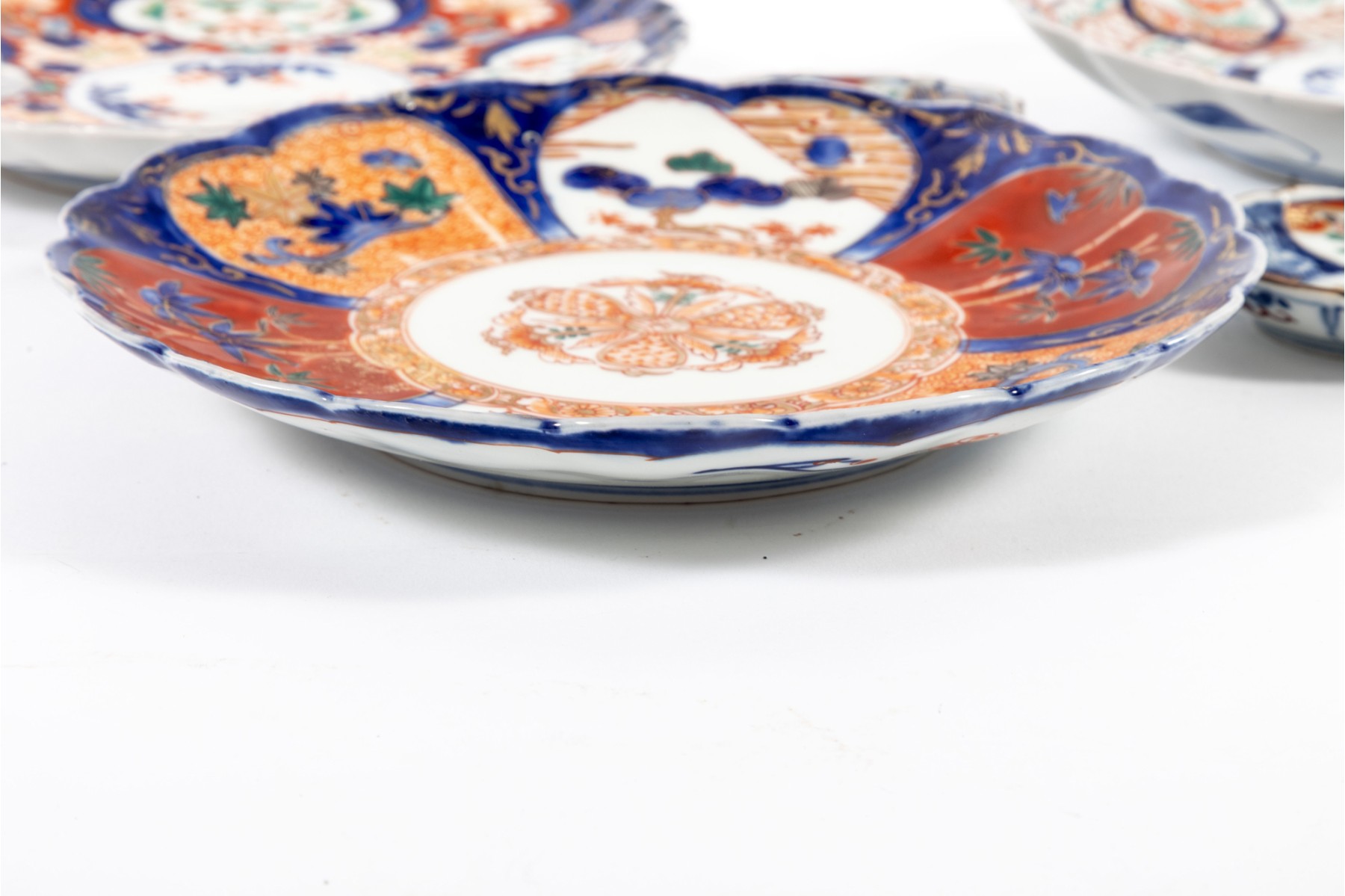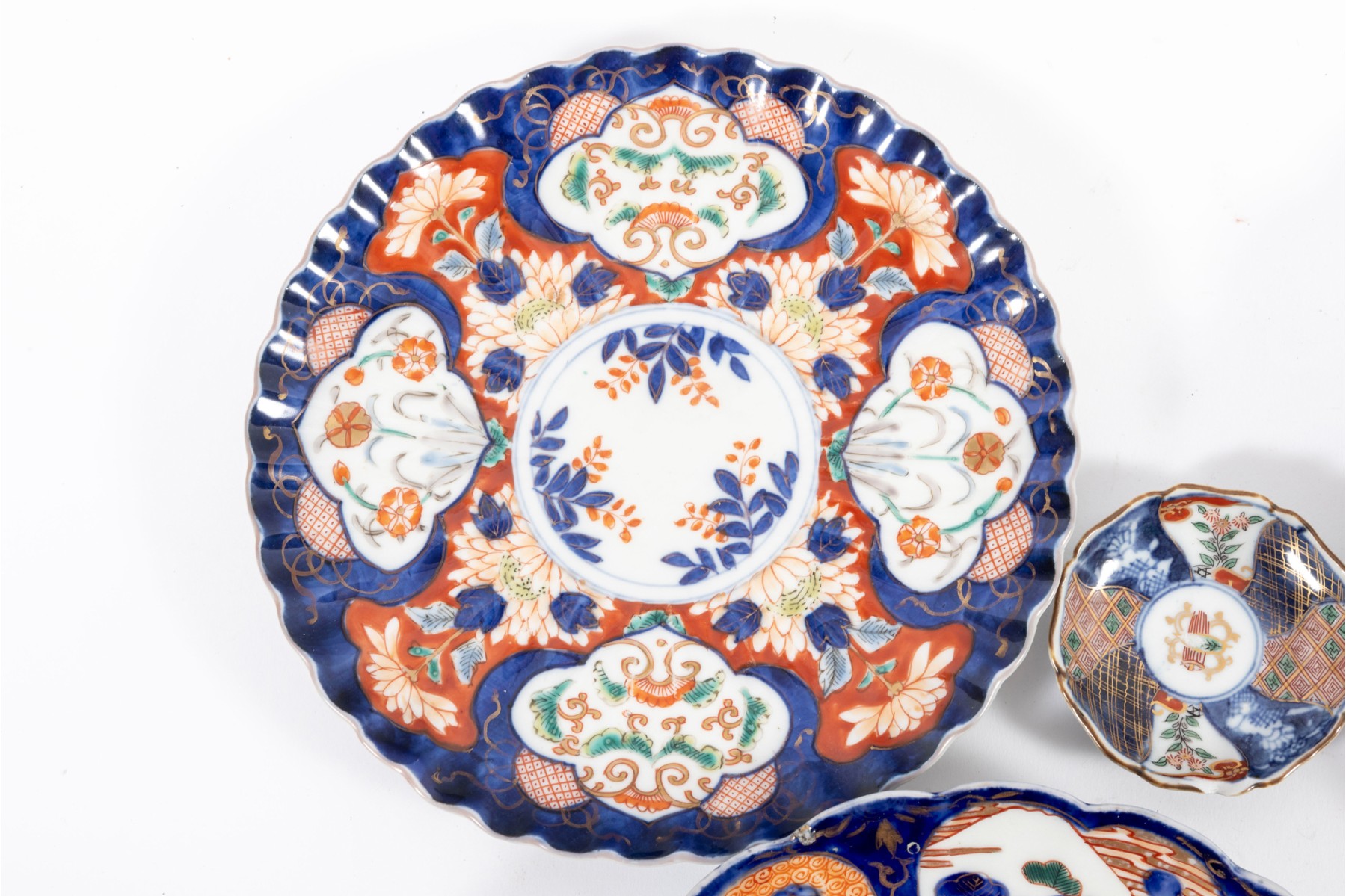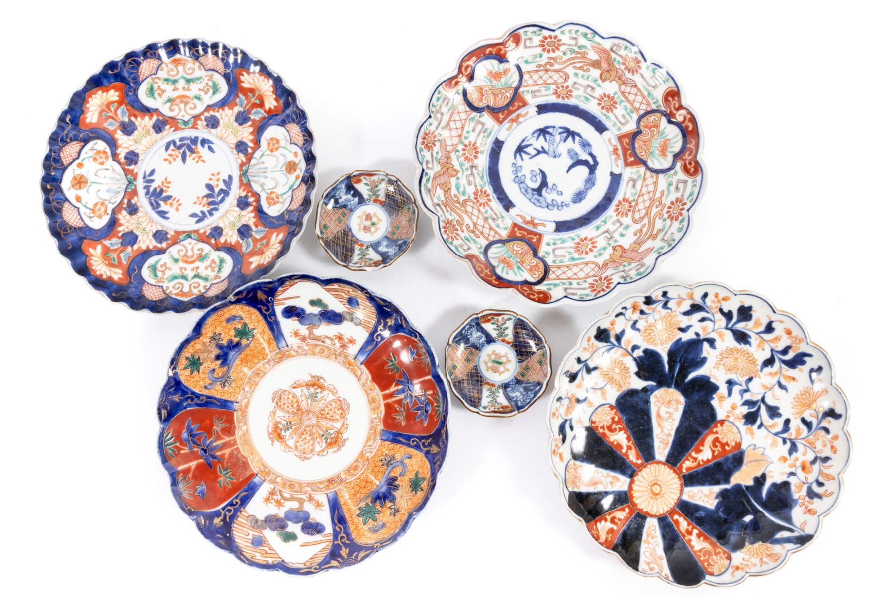 A collection of four 8.5" fluted Japanese porcelain Imari-ware chargers and two butter pats, meiji period (1868 - 1912). All examples are unique and hand-painted — some of which feature markings. See photos for details