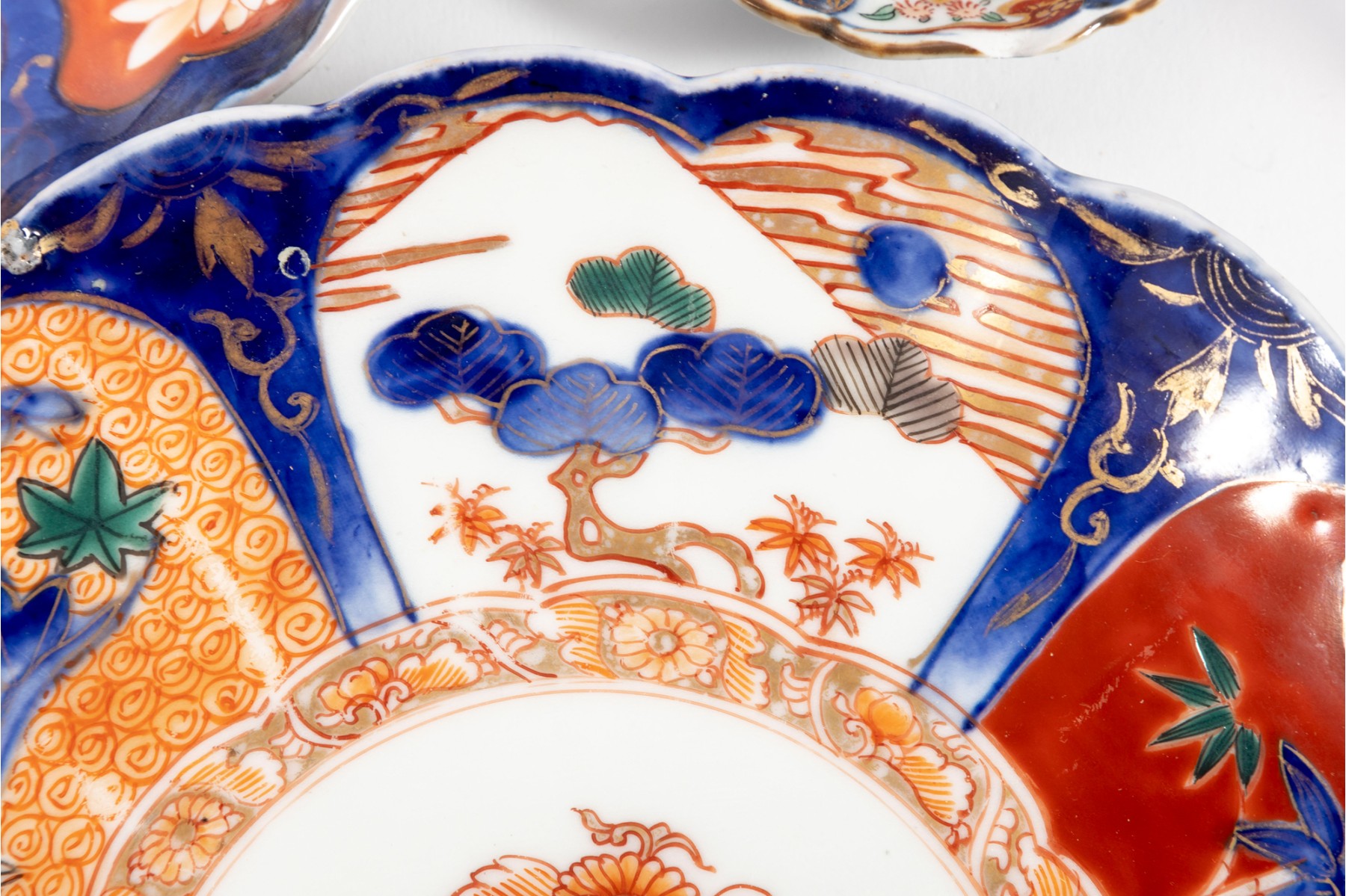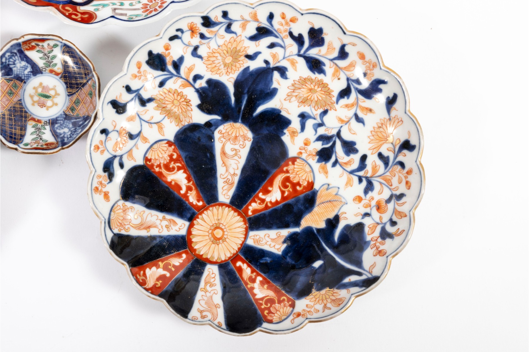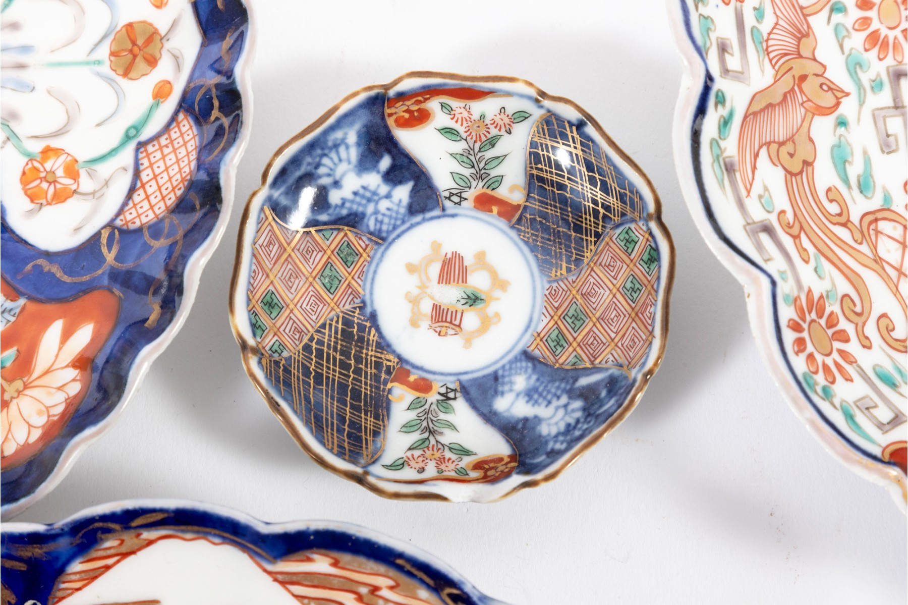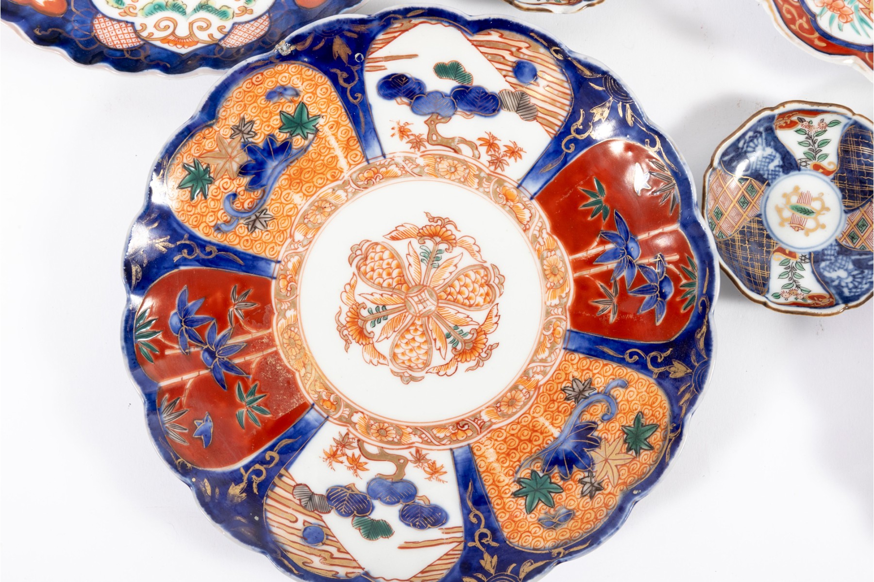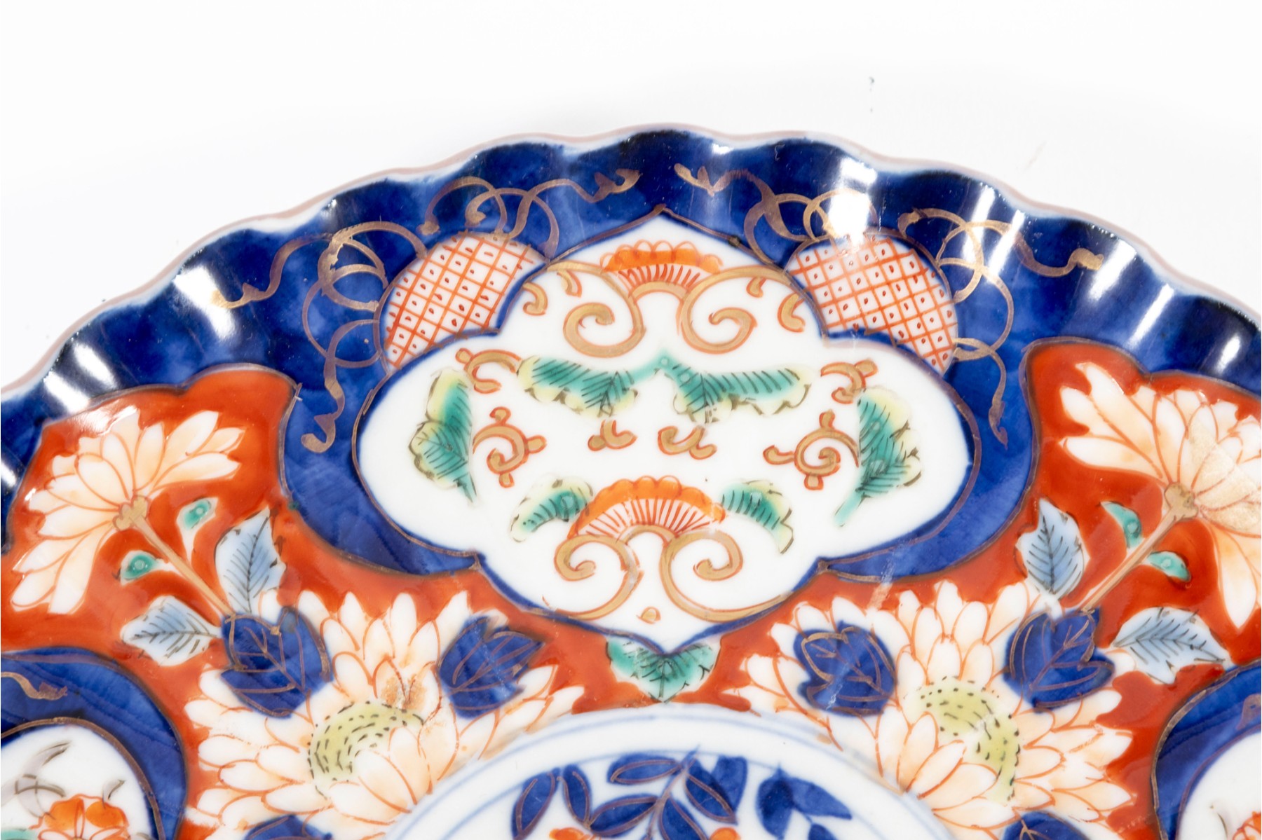 A collection of four 8.5" fluted Japanese porcelain Imari-ware chargers and two butter pats, meiji period (1868 - 1912). All examples are unique and hand-painted — some of which feature markings. See photos for details