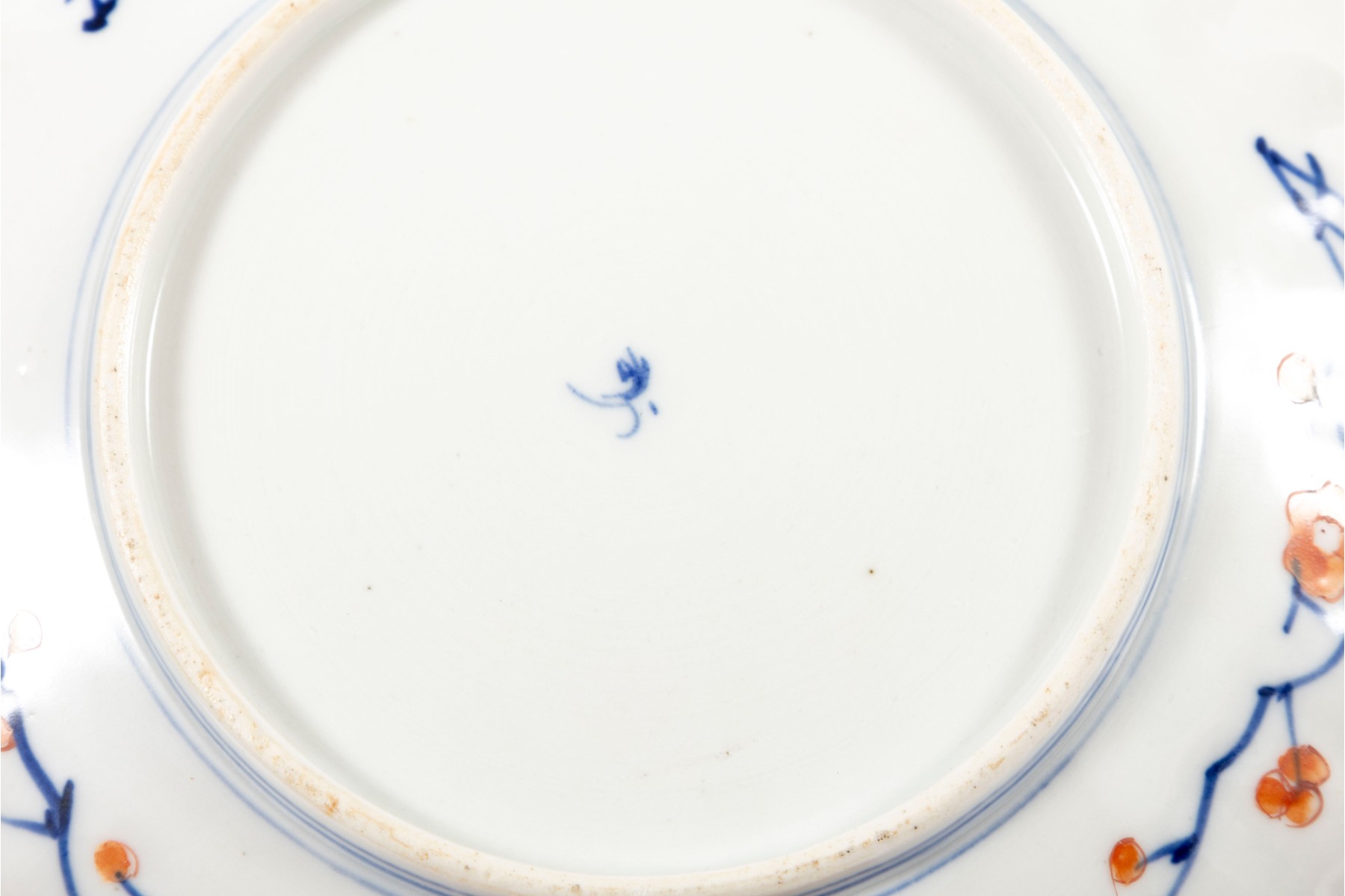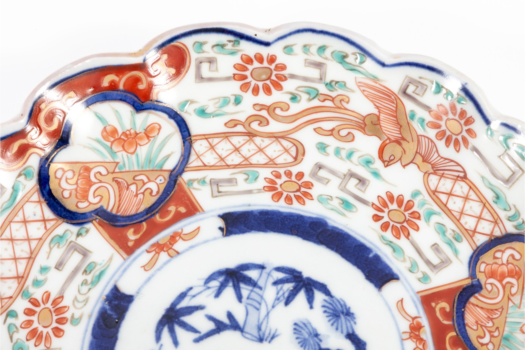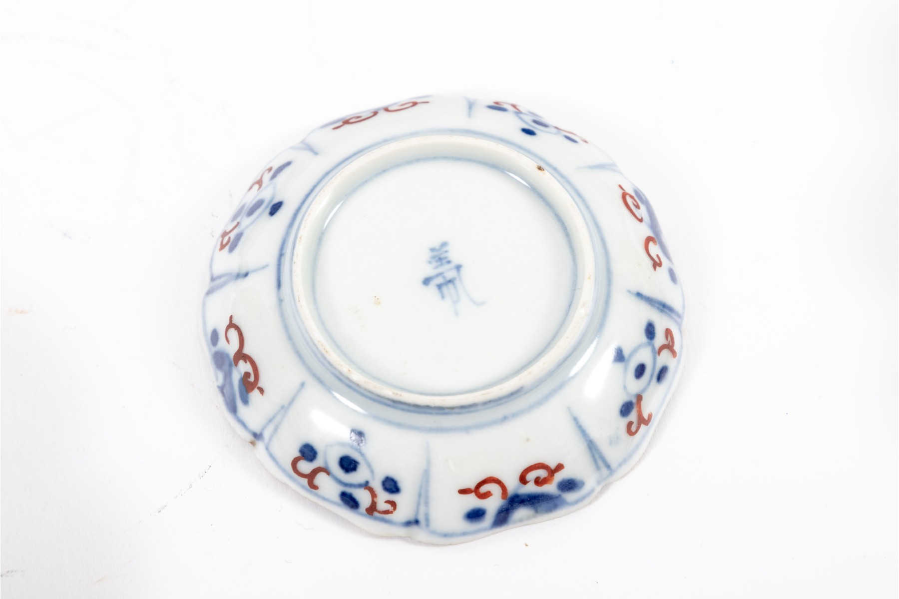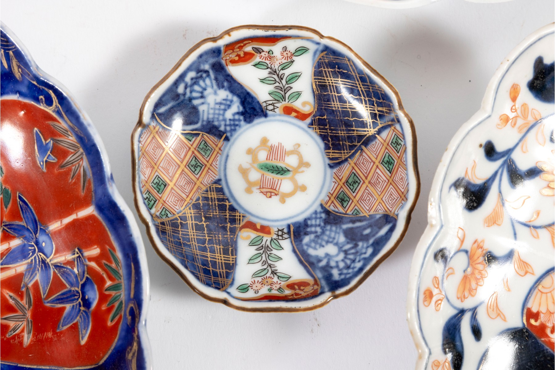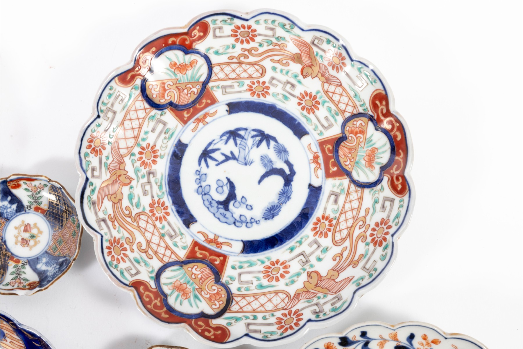 A collection of four 8.5" fluted Japanese porcelain Imari-ware chargers and two butter pats, meiji period (1868 - 1912). All examples are unique and hand-painted — some of which feature markings. See photos for details
