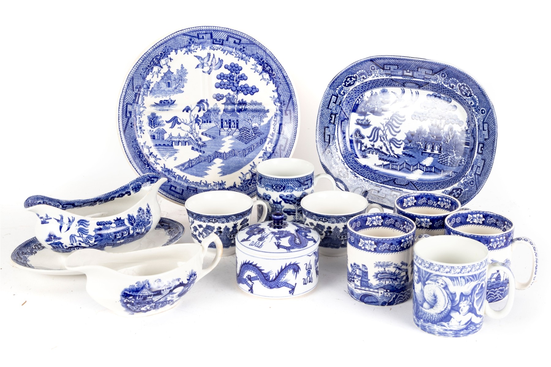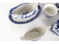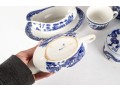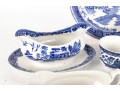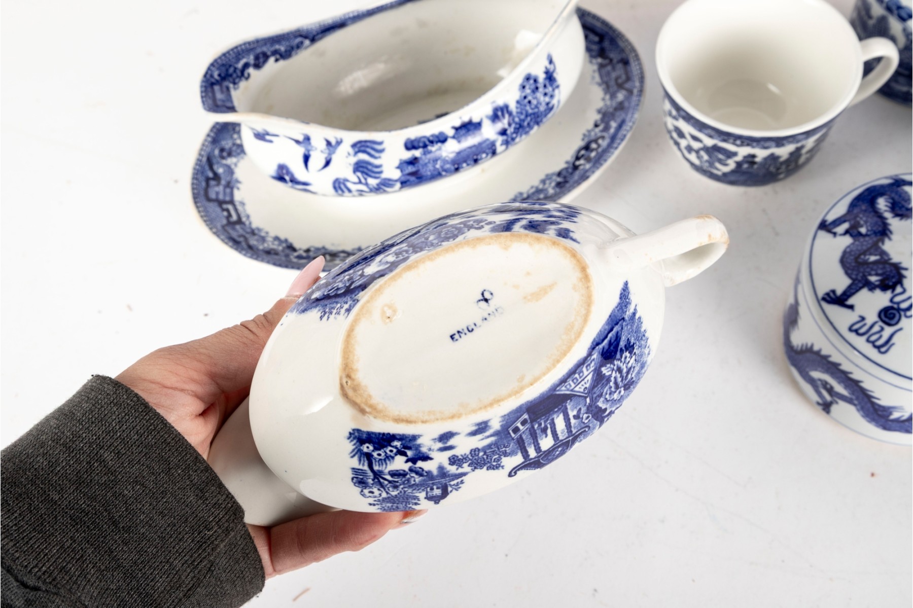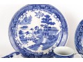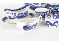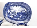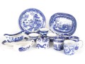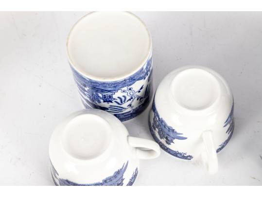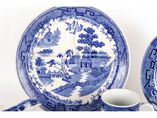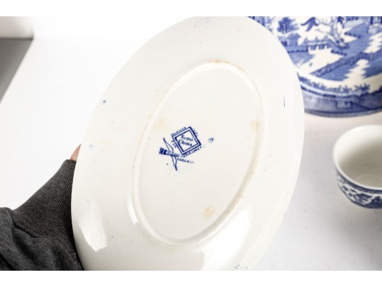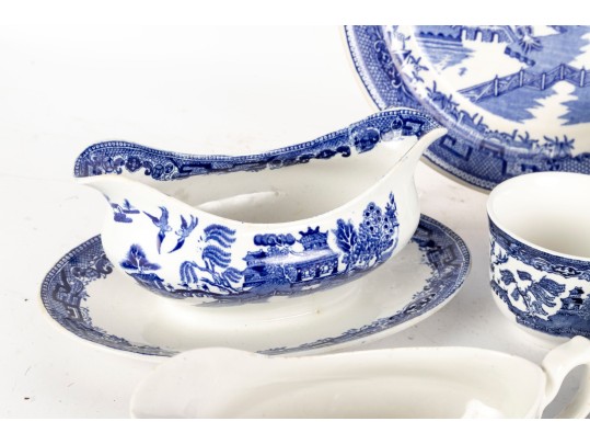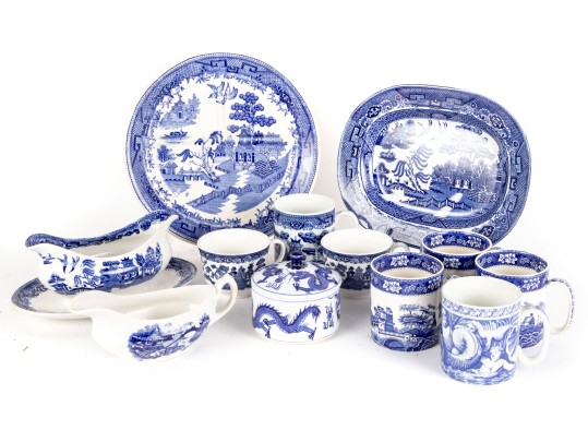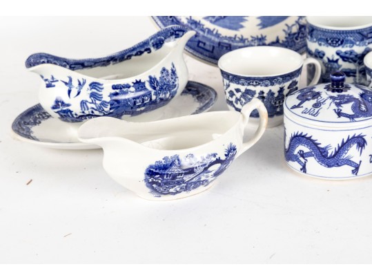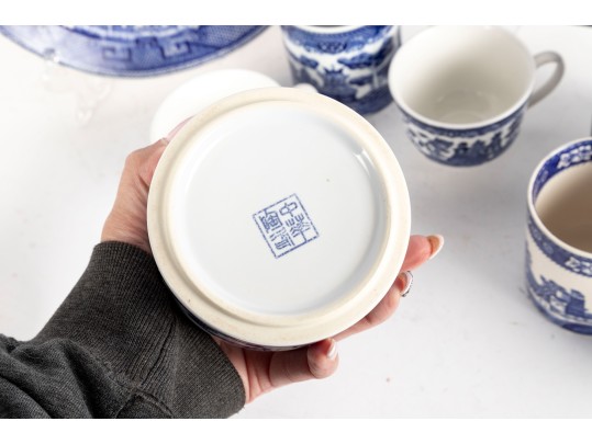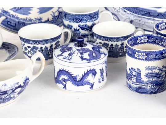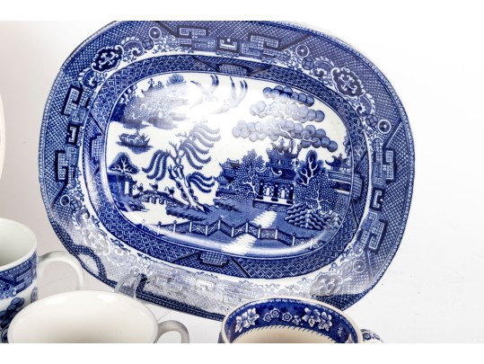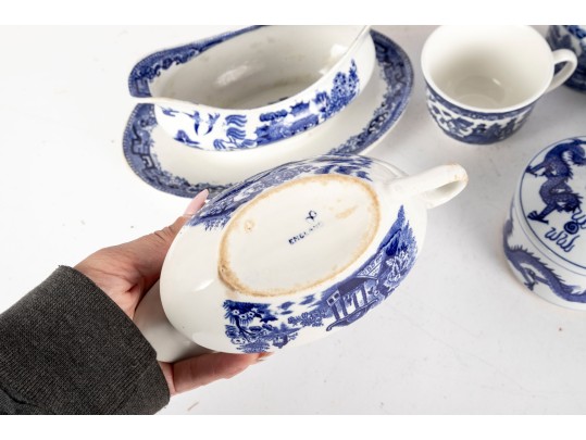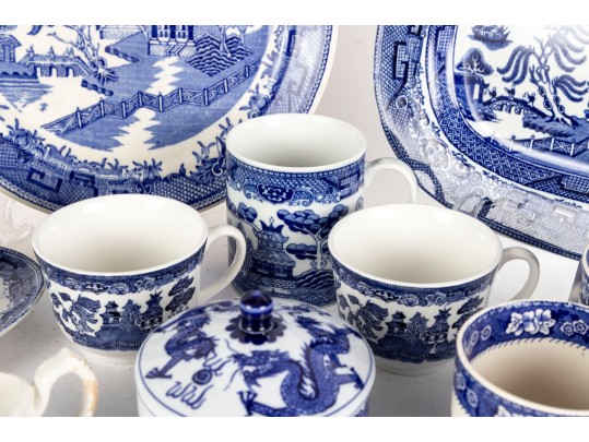 A charming assortment of antique Blue Willowware from various renowned makers including Adams & Sons, Sterling, and more. This mixed collection includes plates, bowls, and serving pieces—each featuring the classic Oriental-inspired blue-and-white willow pattern. Contents as shown.