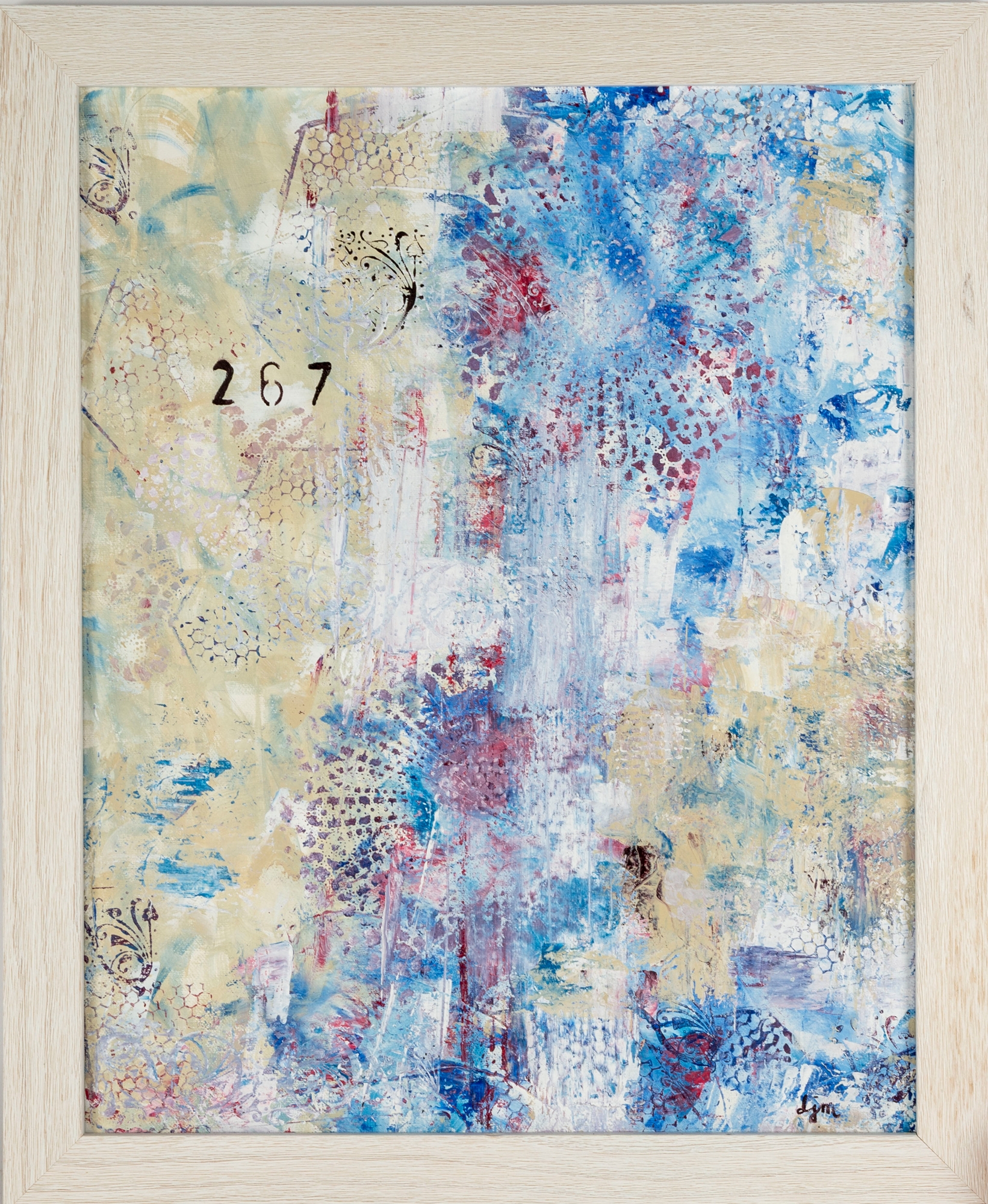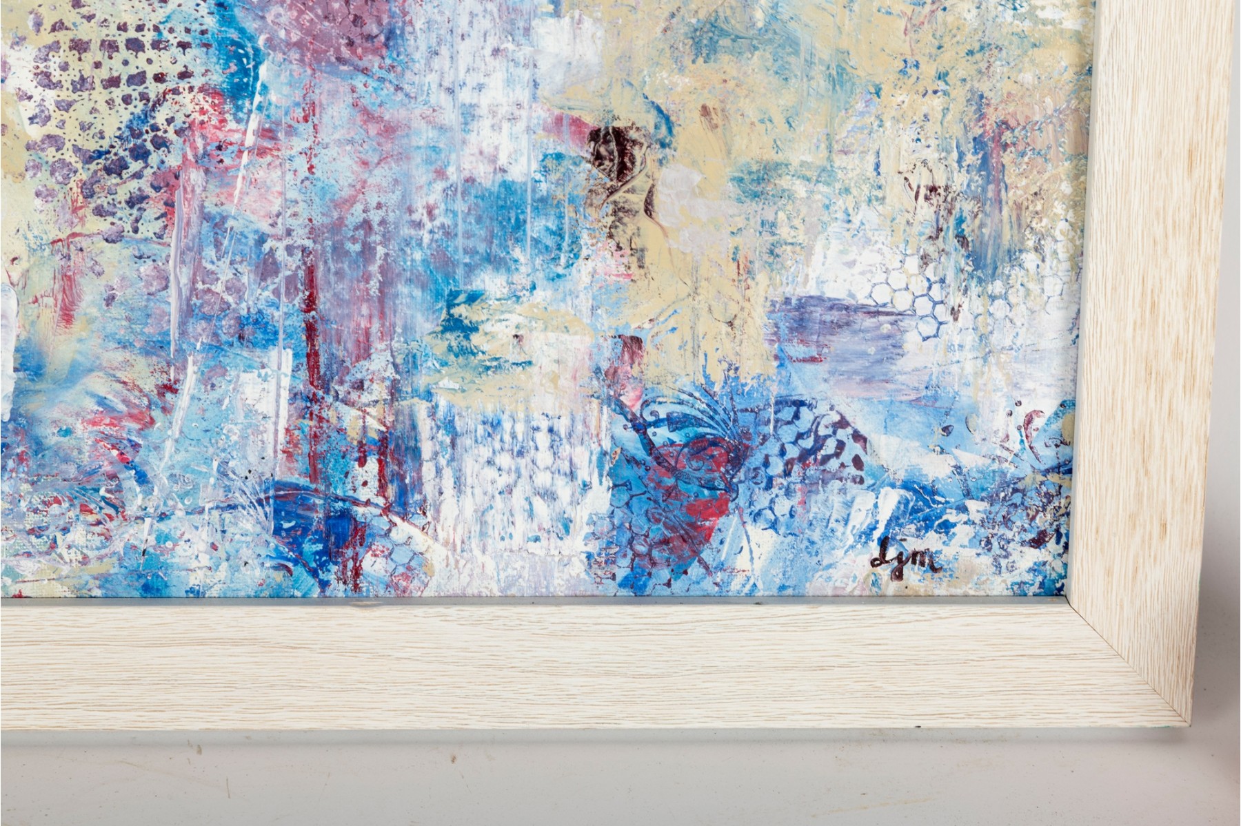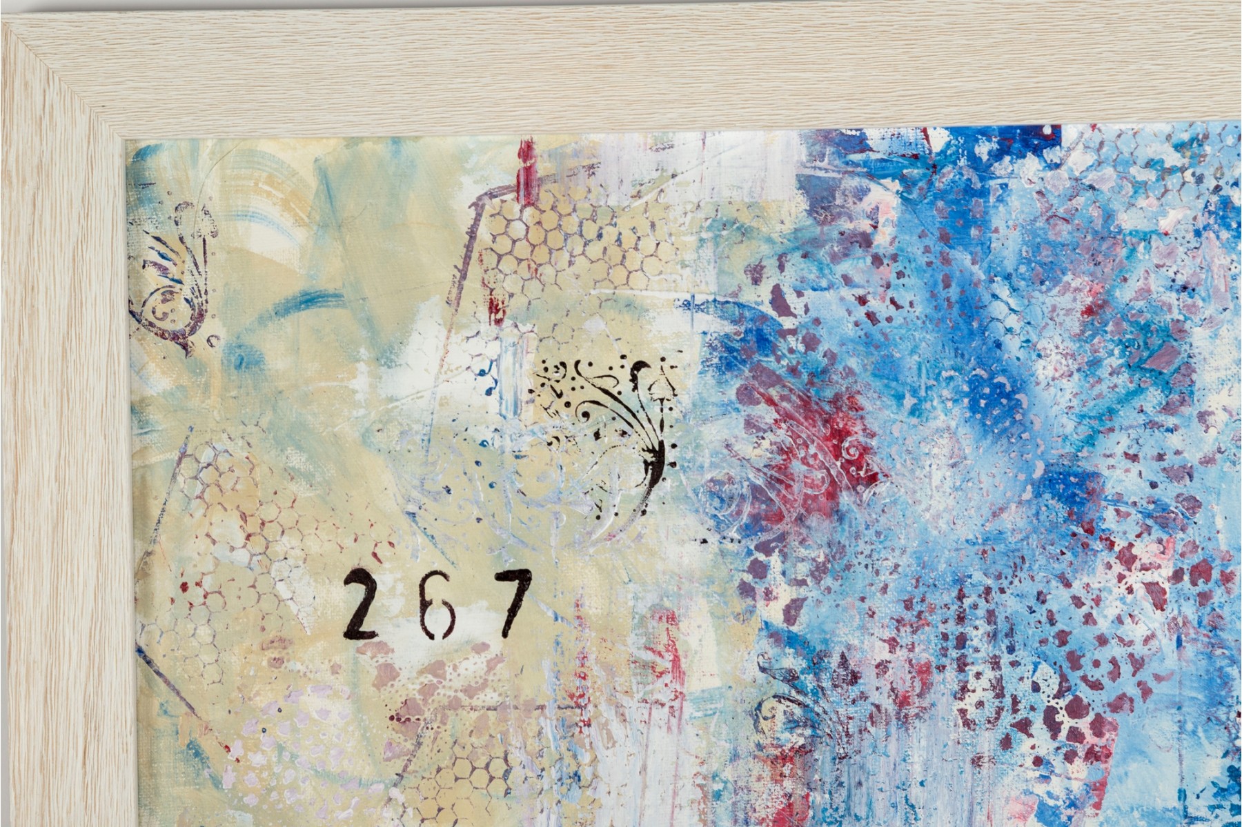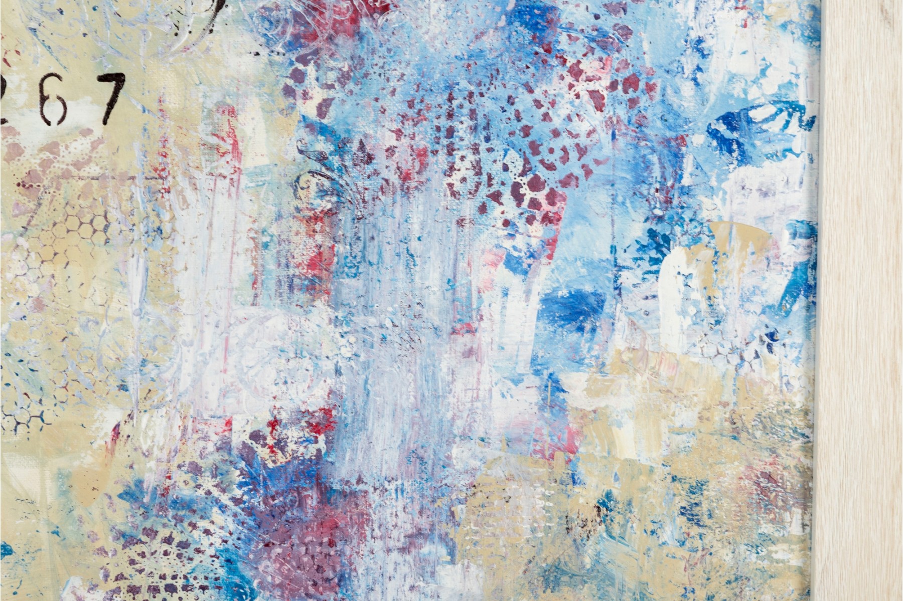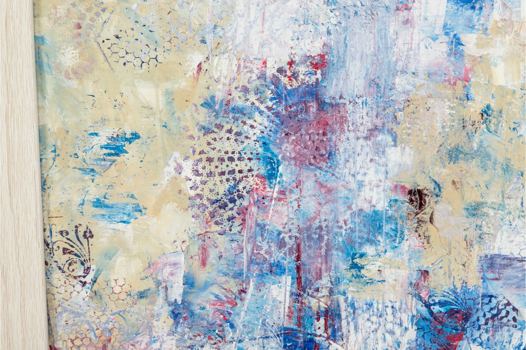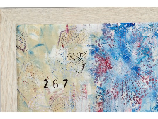 An unusual oil painting composed of mixed media -- varied texturing and patterns from complex techniques clad in hues of red, blue and khaki. The artwork is signed in the bottom right corner, and is presented openly within a a wooden frame.