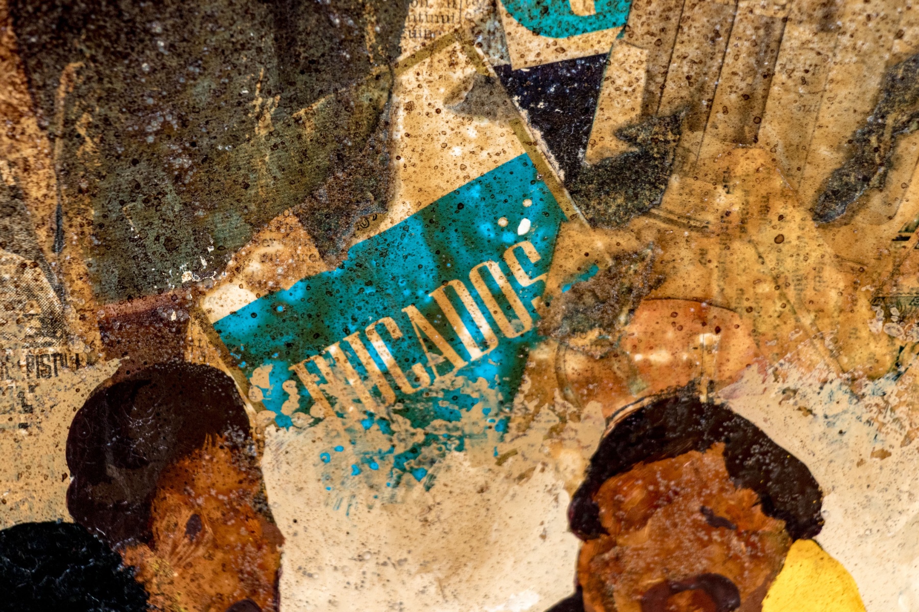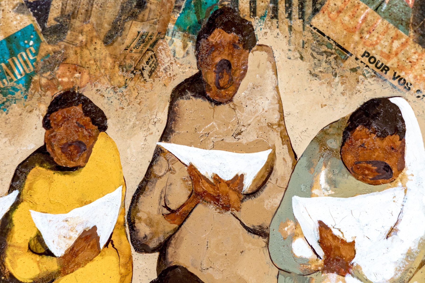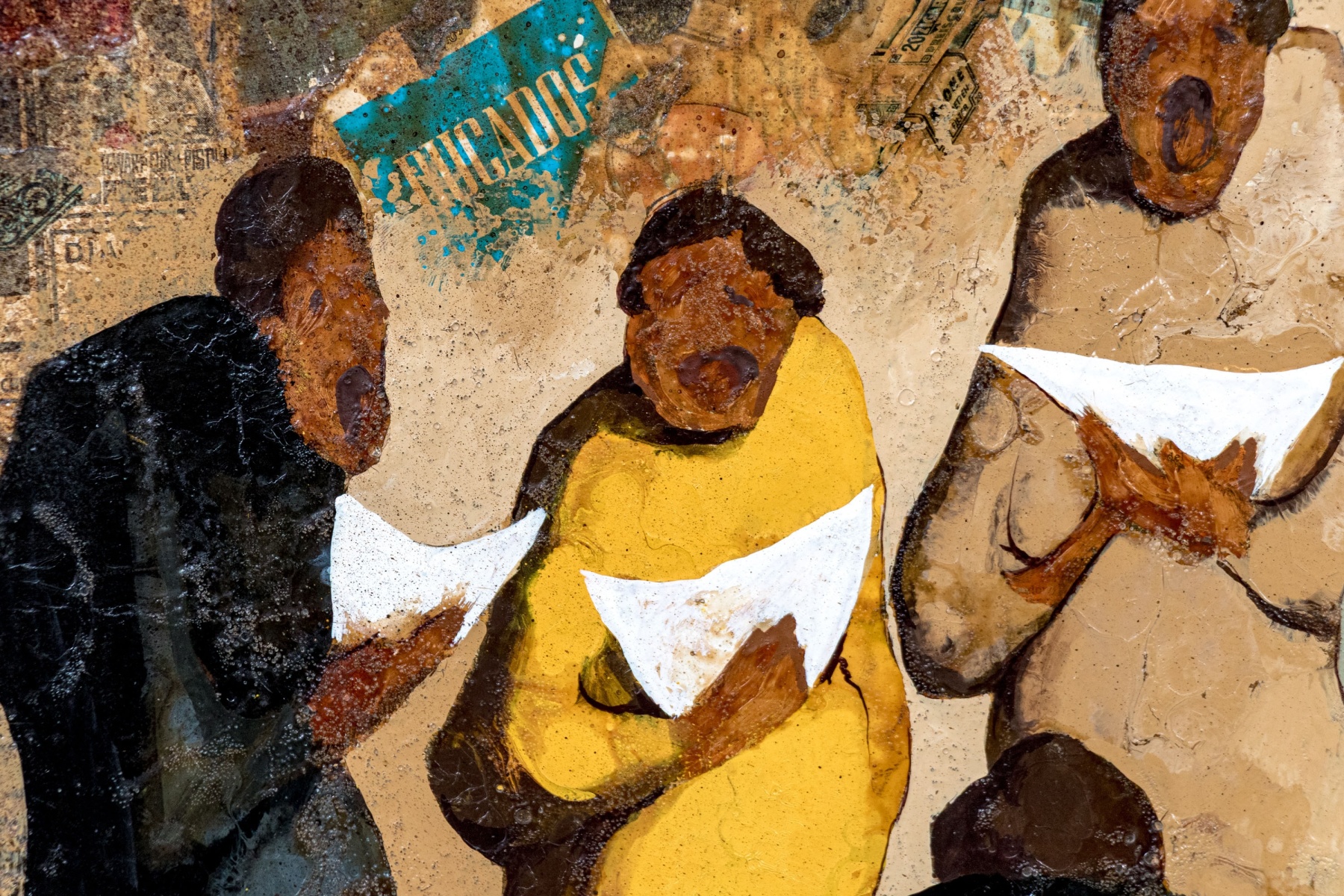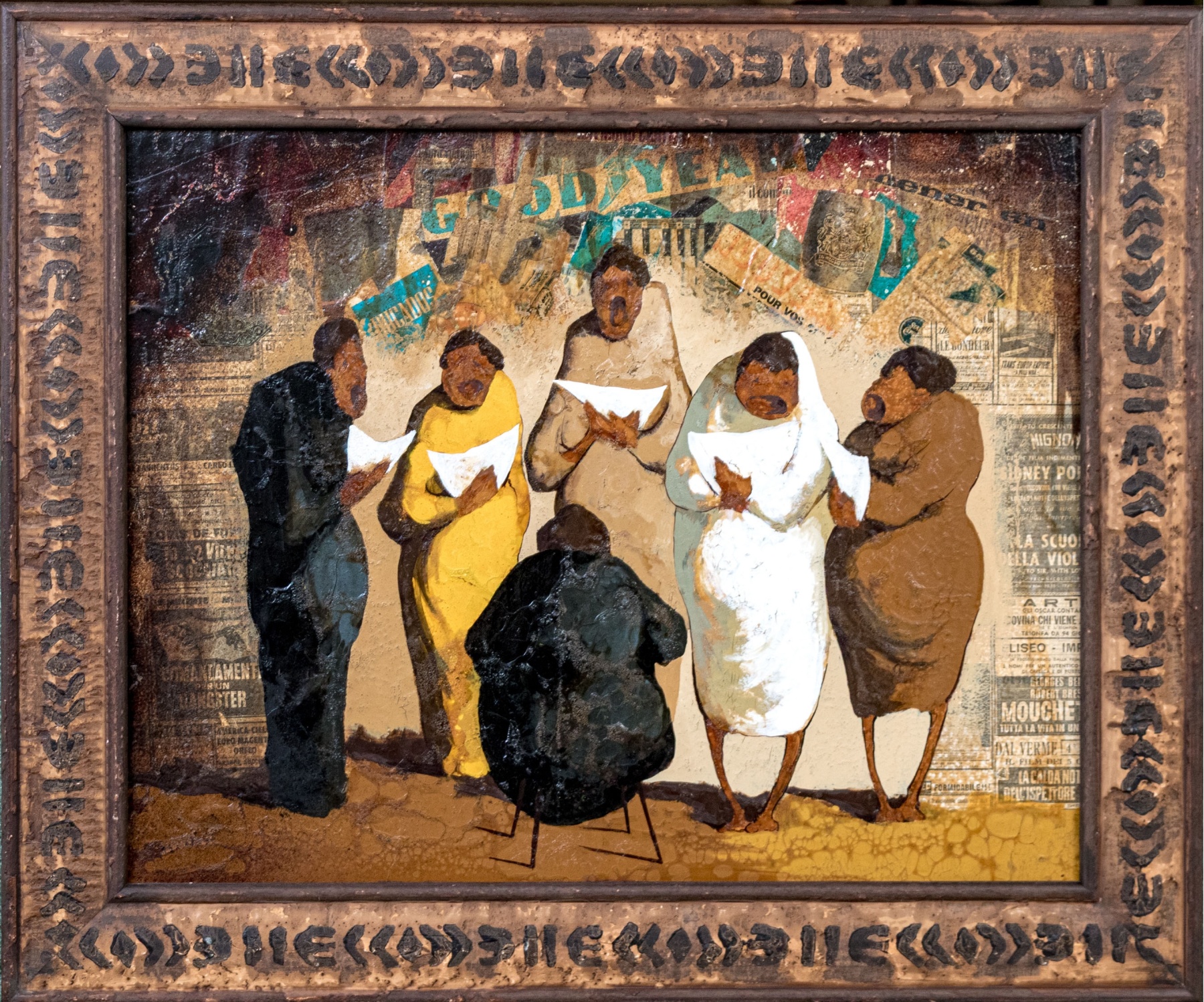 An eye-catching mixed media on board in the manner of Andres Escartin (Spanish, b. 1938) depicting a choir of abstract figures in black, yellow, brown, and white holding bright white papers with mouths opened wide to sing in front of a seated figure facing away from the viewer. The choir stands surrounded by a collage of newspaper clippings adding great texture and pops of red and blue color. Appears to be unsigned.
