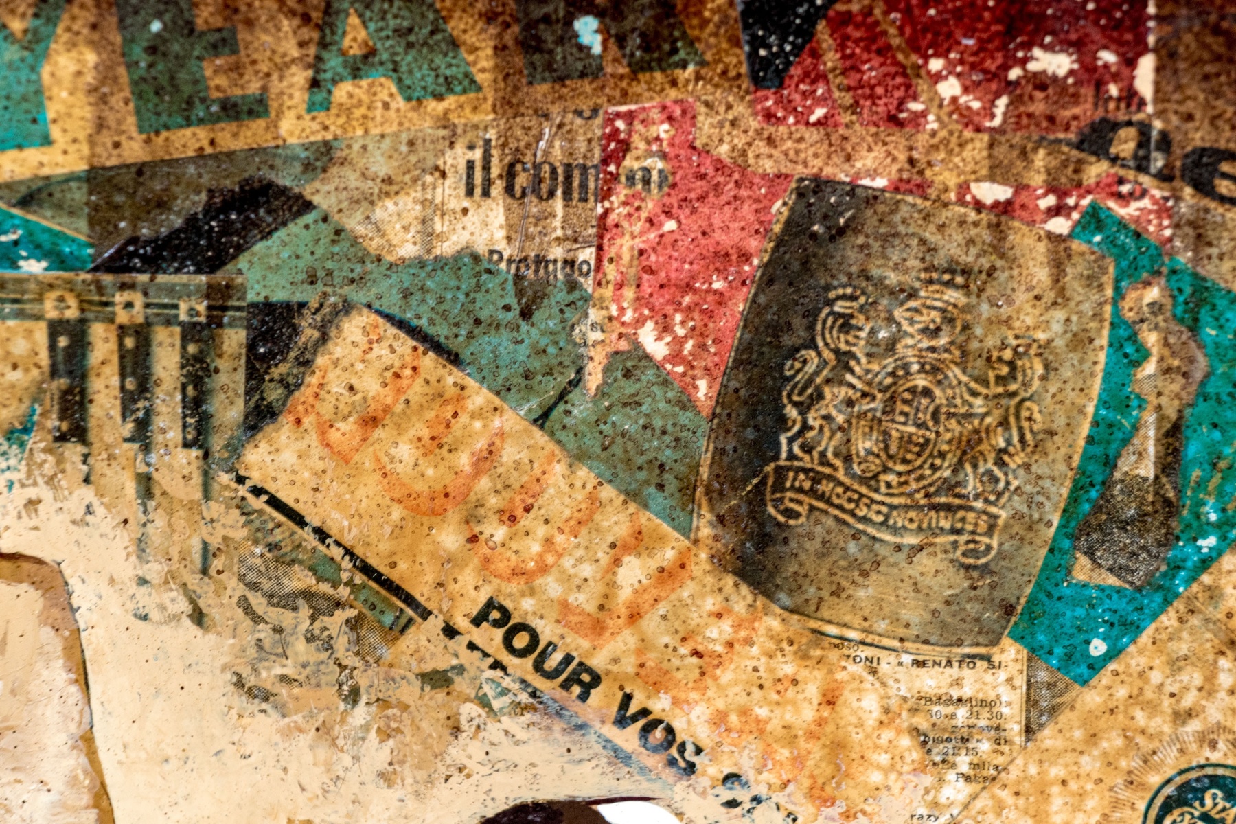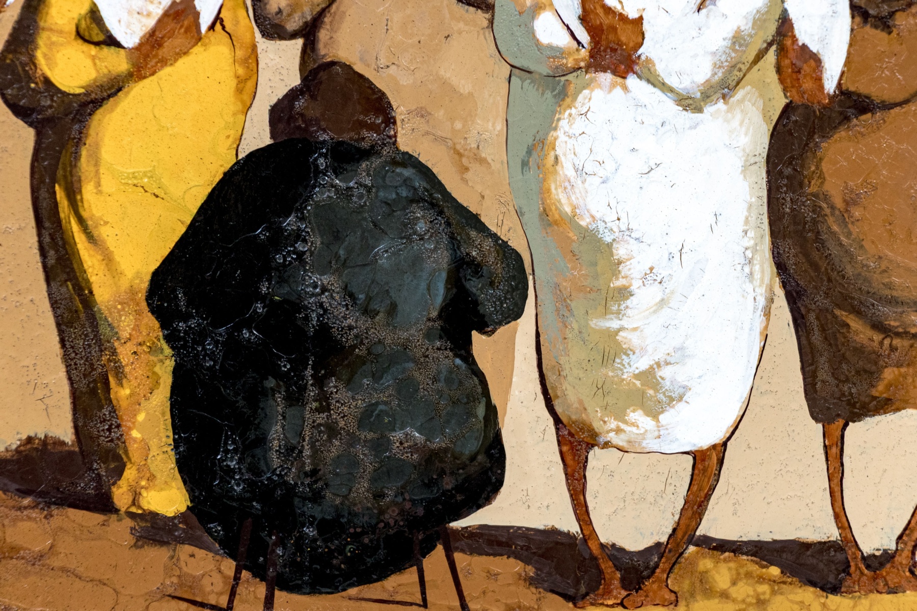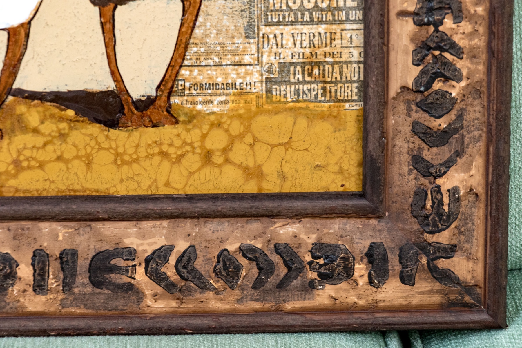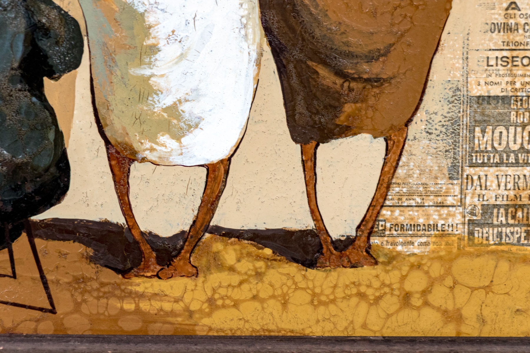 An eye-catching mixed media on board in the manner of Andres Escartin (Spanish, b. 1938) depicting a choir of abstract figures in black, yellow, brown, and white holding bright white papers with mouths opened wide to sing in front of a seated figure facing away from the viewer. The choir stands surrounded by a collage of newspaper clippings adding great texture and pops of red and blue color. Appears to be unsigned.