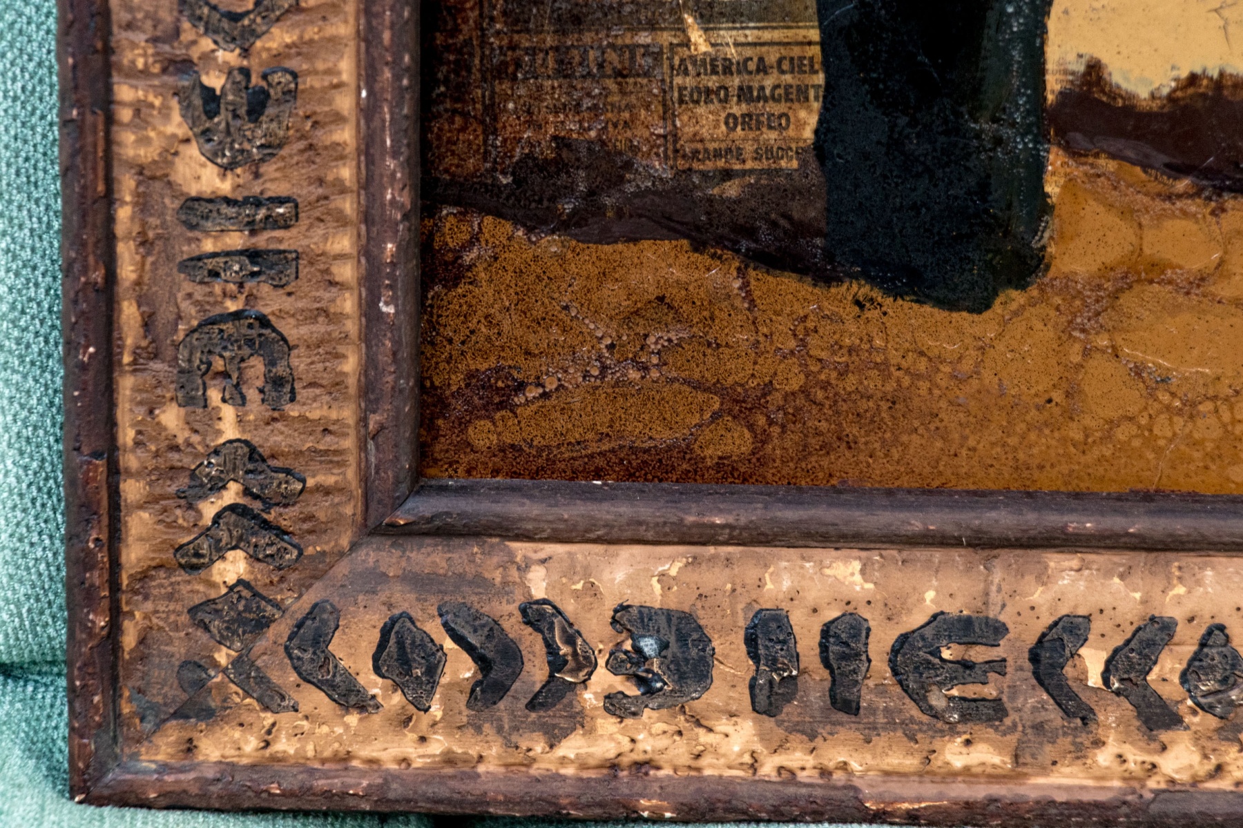 Overall good. Some wear to the impasto areas and blackening to corners with wear to the painted frame.