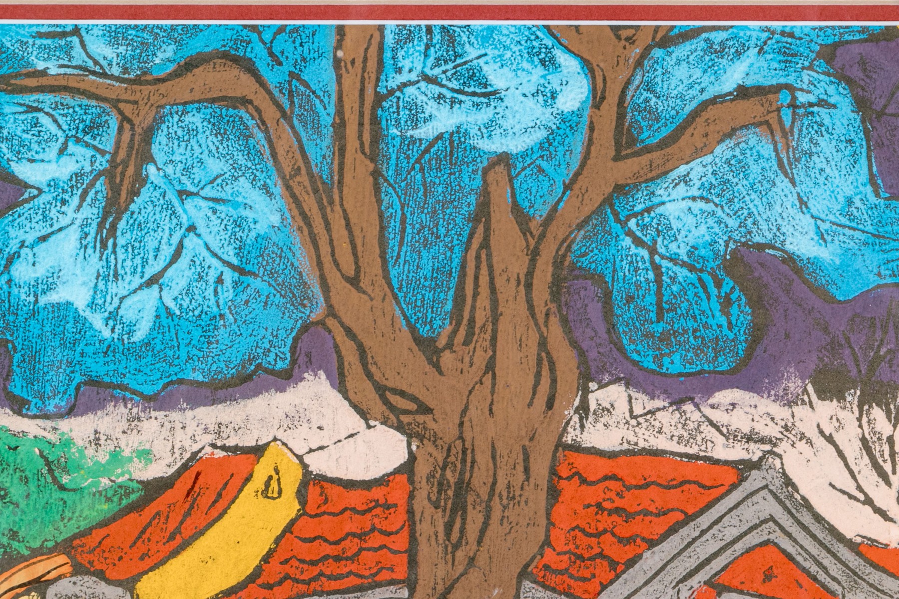 A well executed mixed media on paper painting depicting an expressionist style landscape with vivid hues imbued throughout the scene.