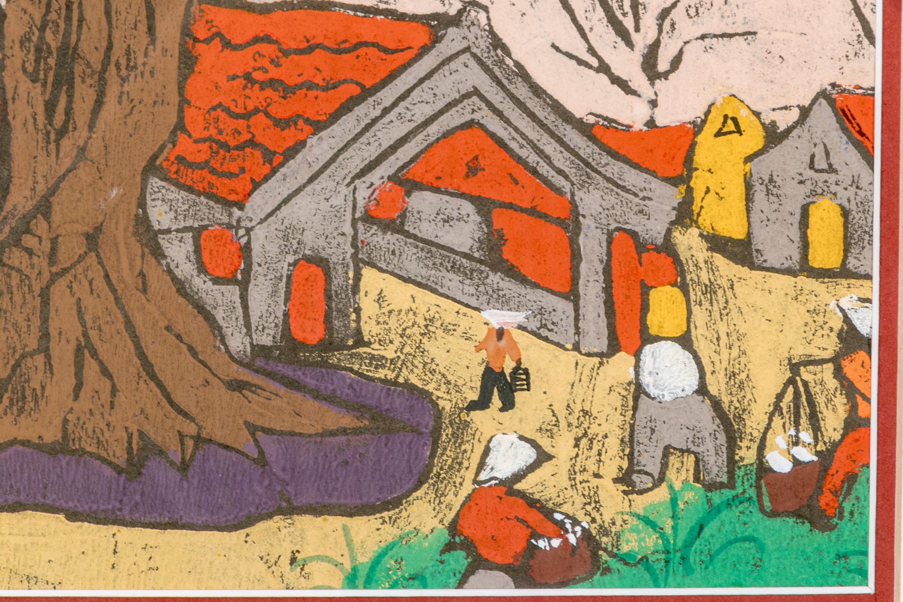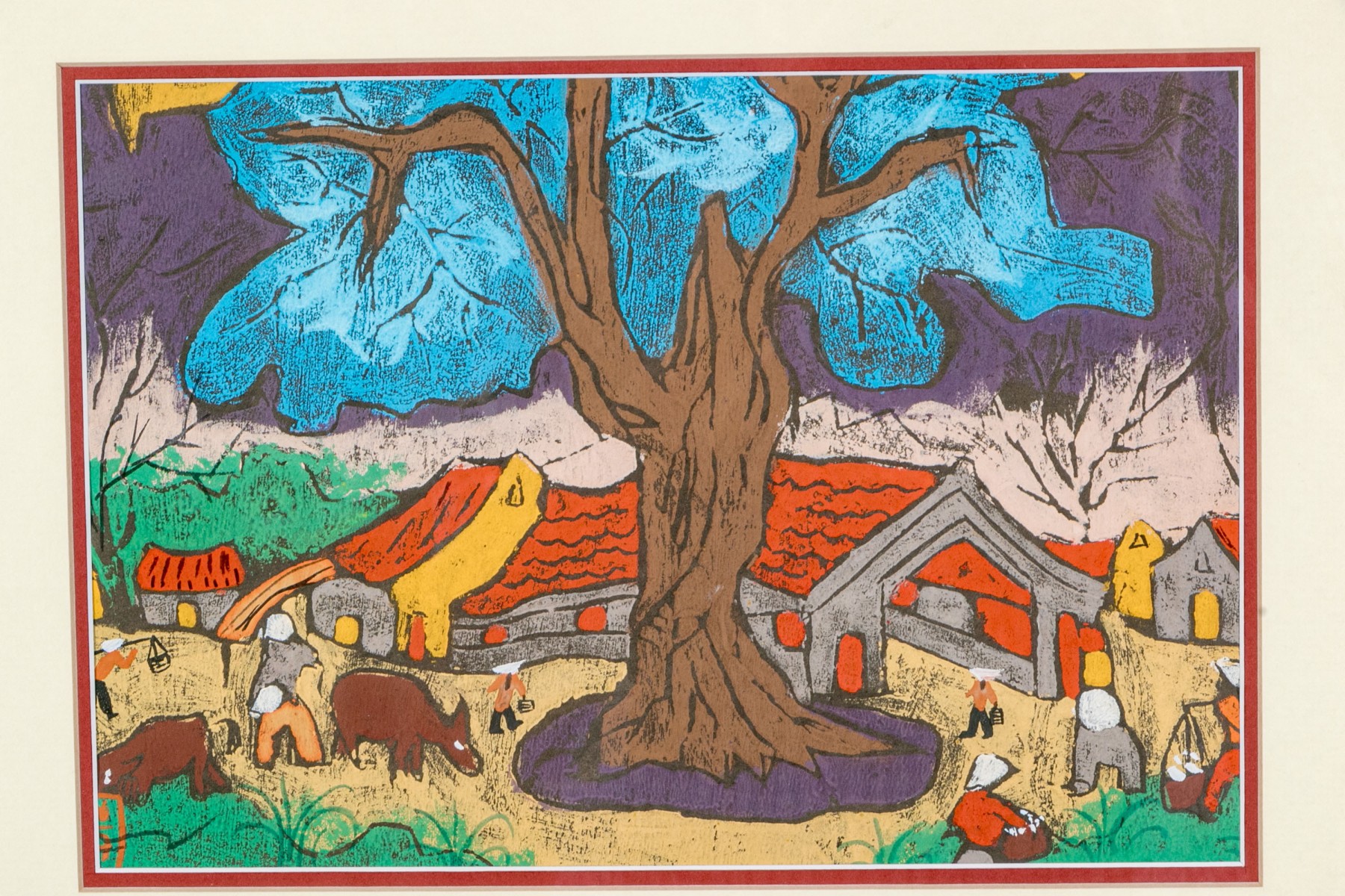 A central tree can be seen with figures wearing traditional Vietnamese style wide brimmed hats working in the landscape.