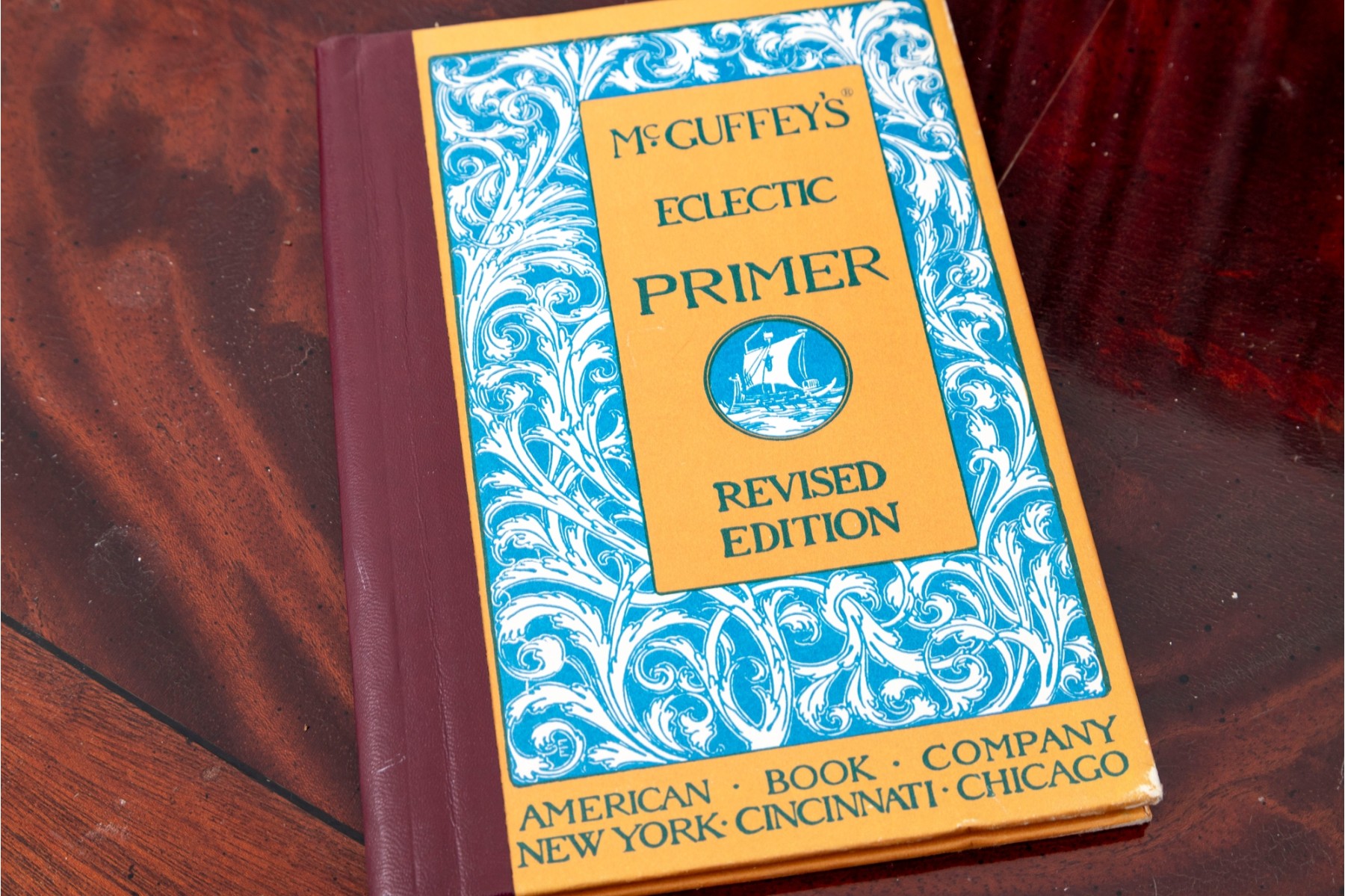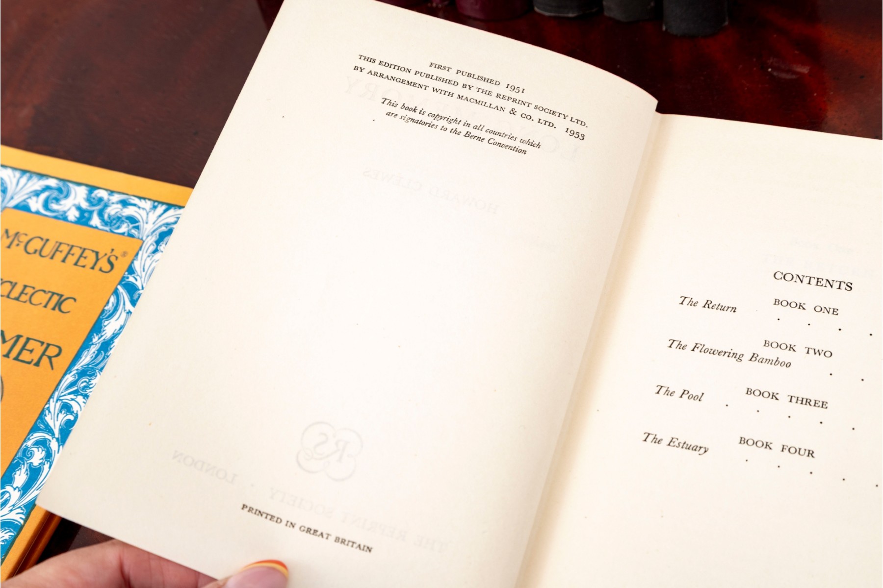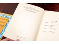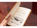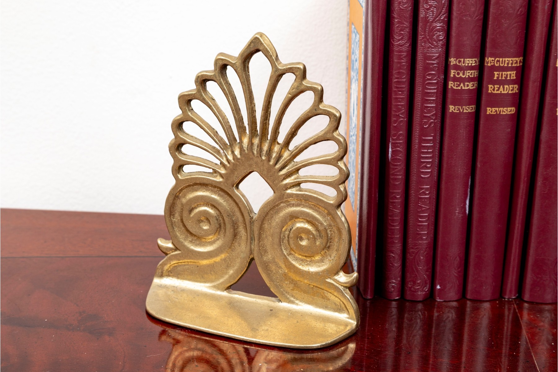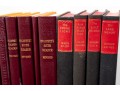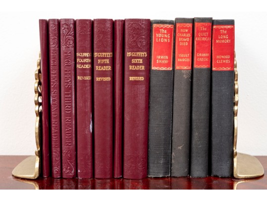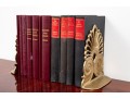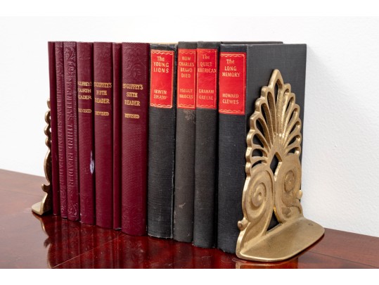 A small stack of vintage books -- leather bound examples from various authors. Includes a pair of brass, Regency inspired bookends.