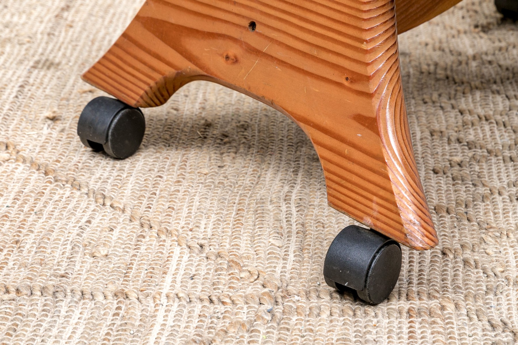 A carved wood tiered angular seat with padded top and the two rests front and back. Upholstered in black fabric. Raised on casters.
