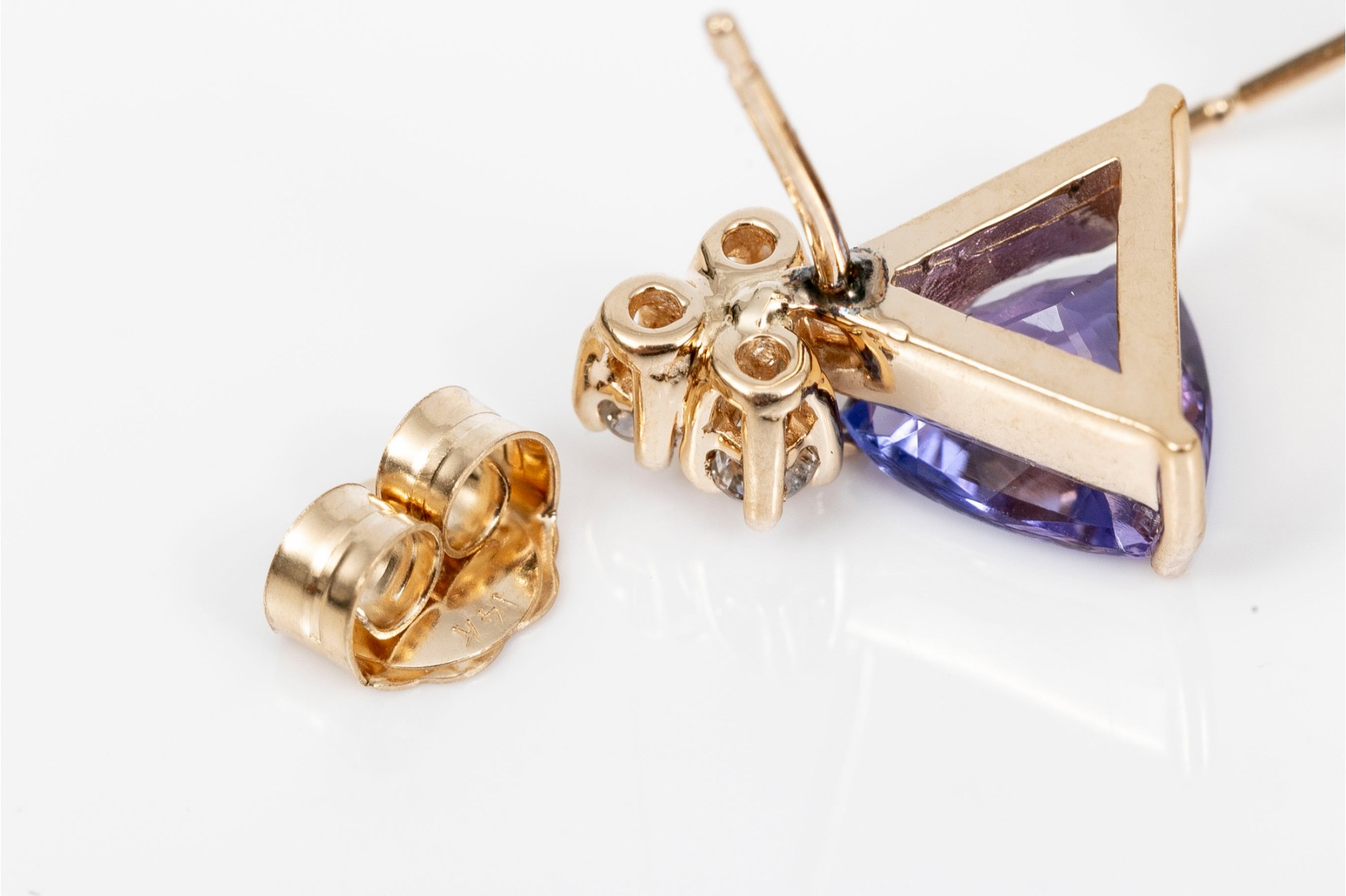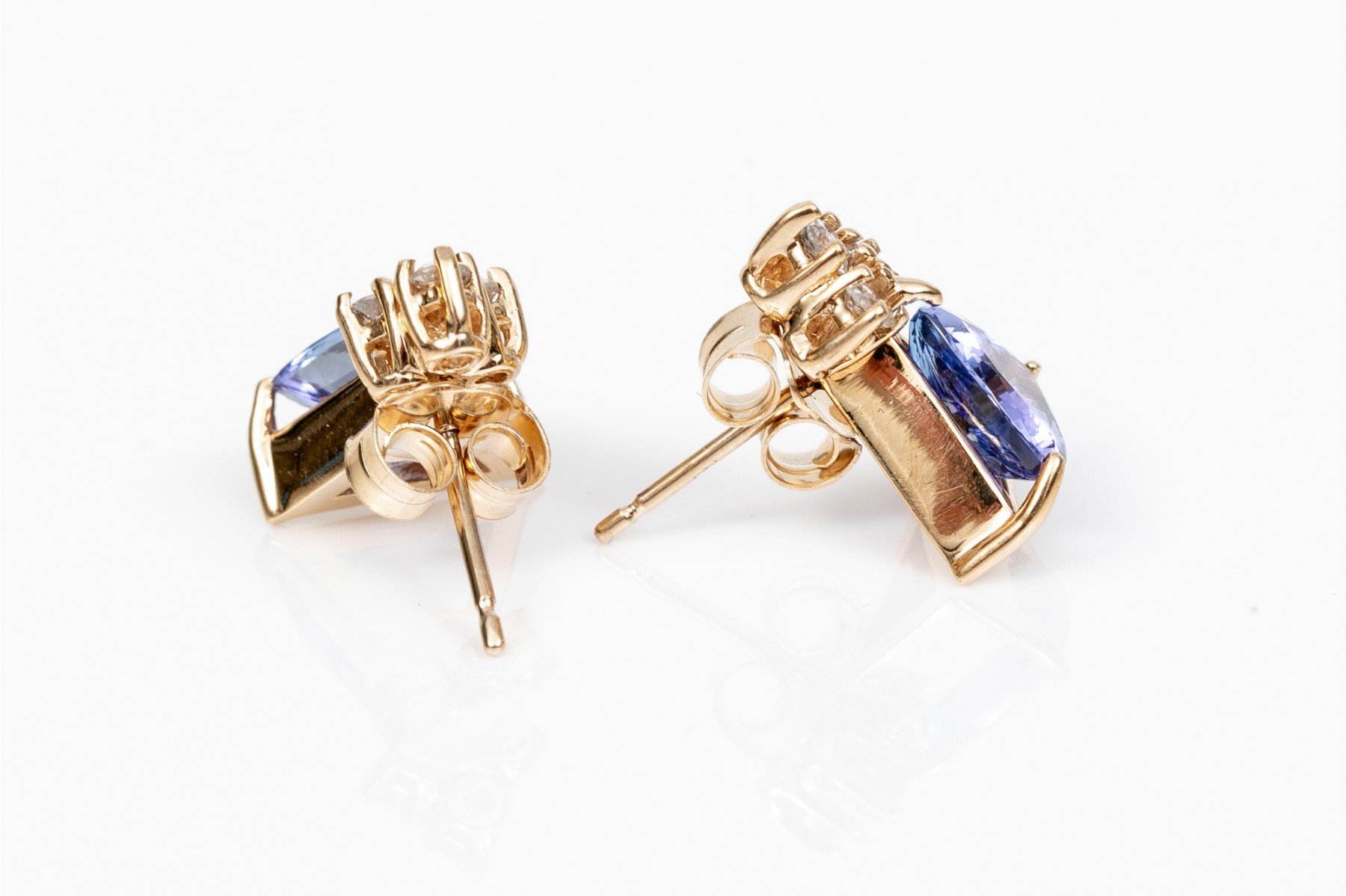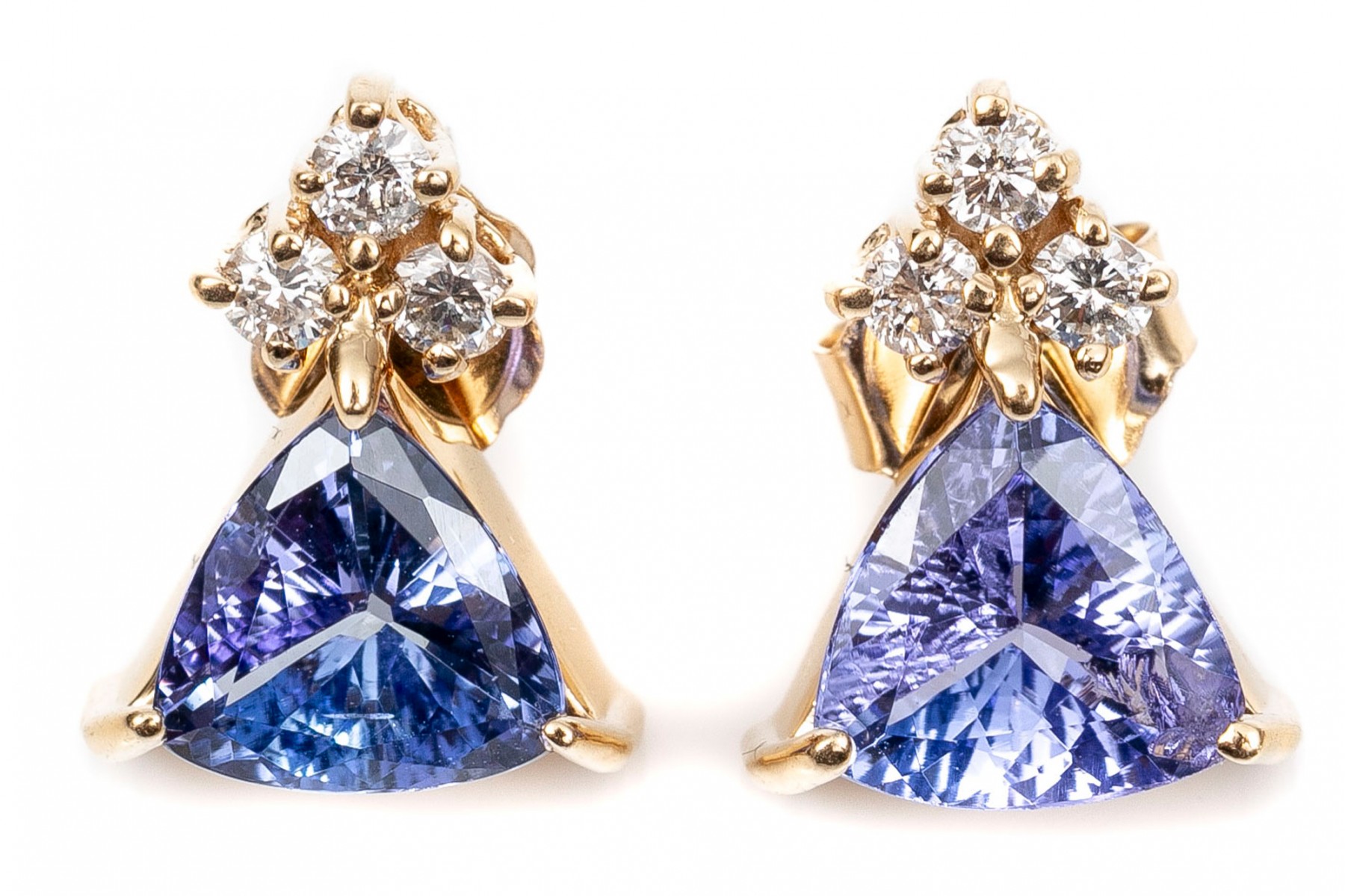 A pair of 14k yellow gold earrings. The modern style earrings are set with triangular cut tanzanite. Above the tanzanite are clusters of round brilliant cut diamonds. Tanzanite are approximately 2.0 TCW and the diamonds approximately 0.18 TCW. Post and clutch backings.