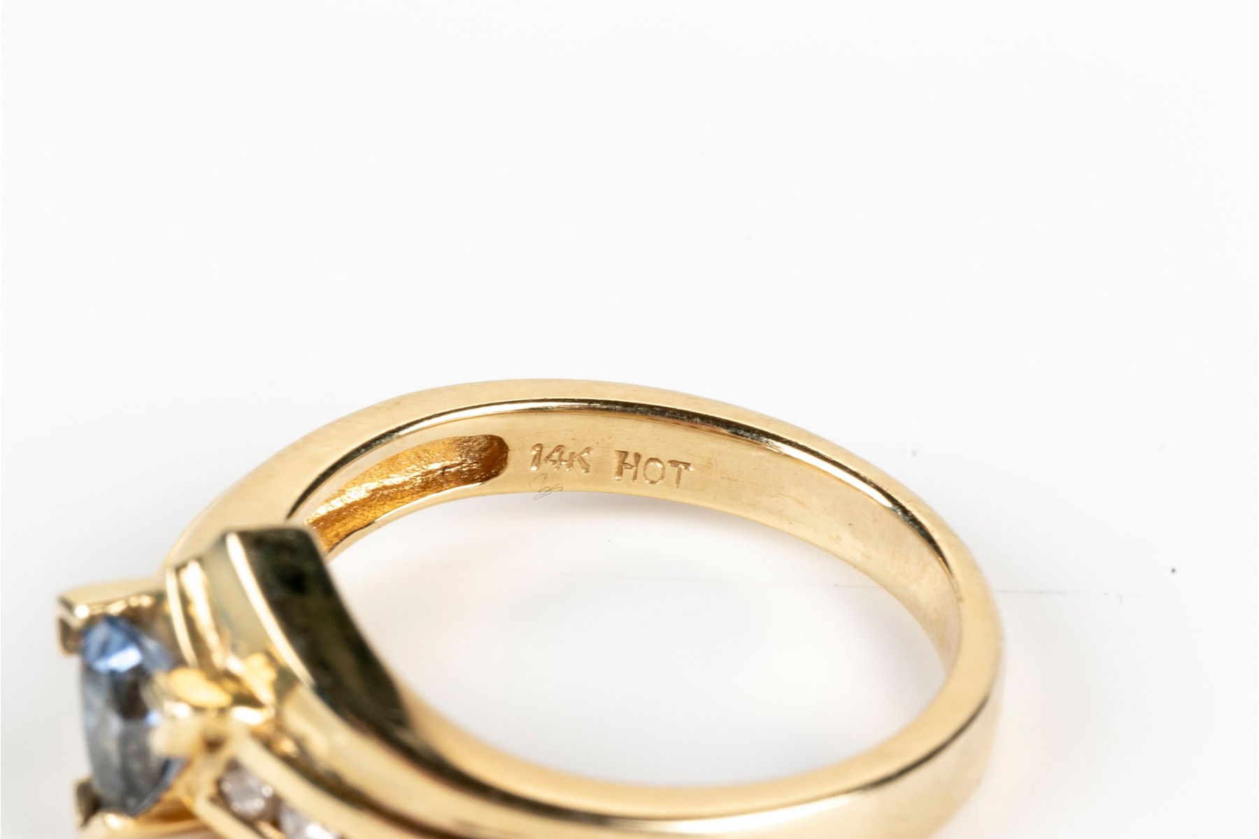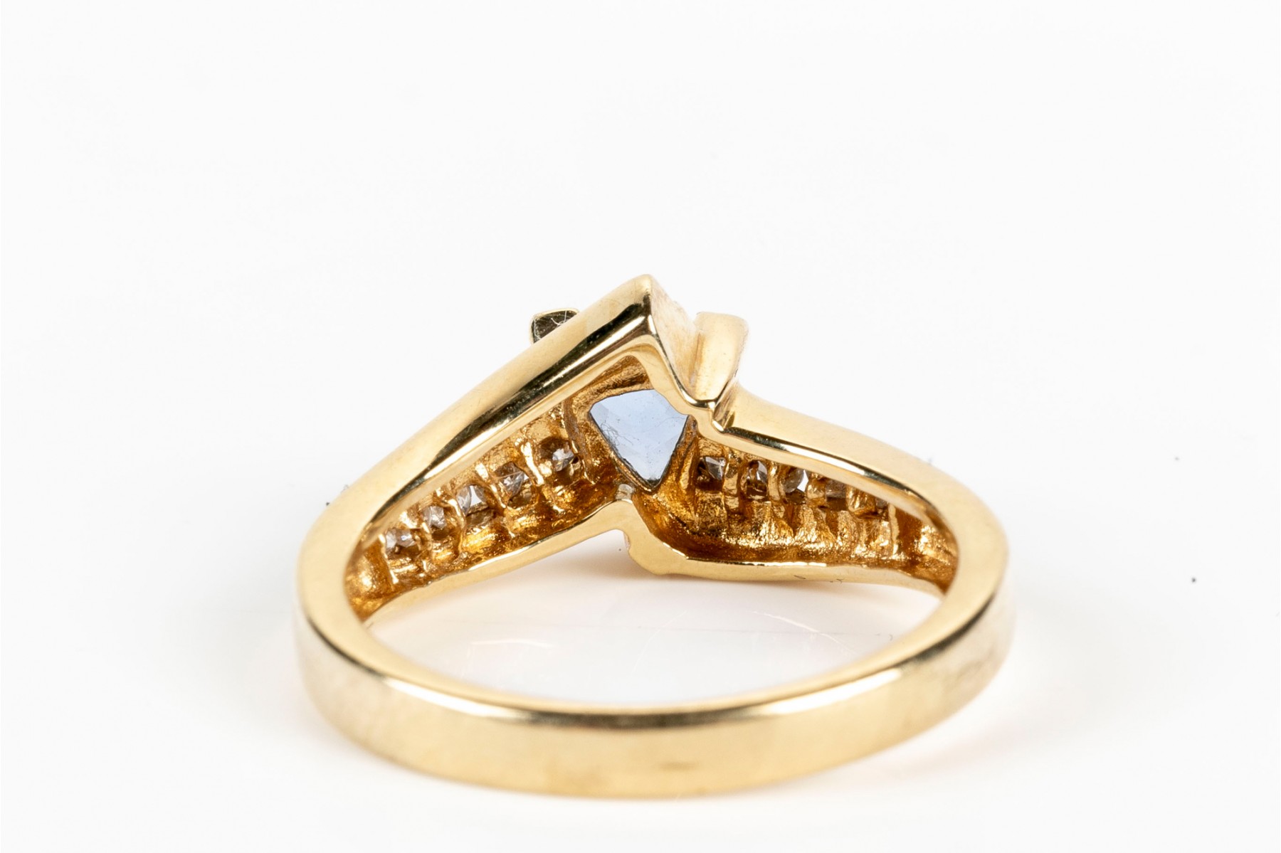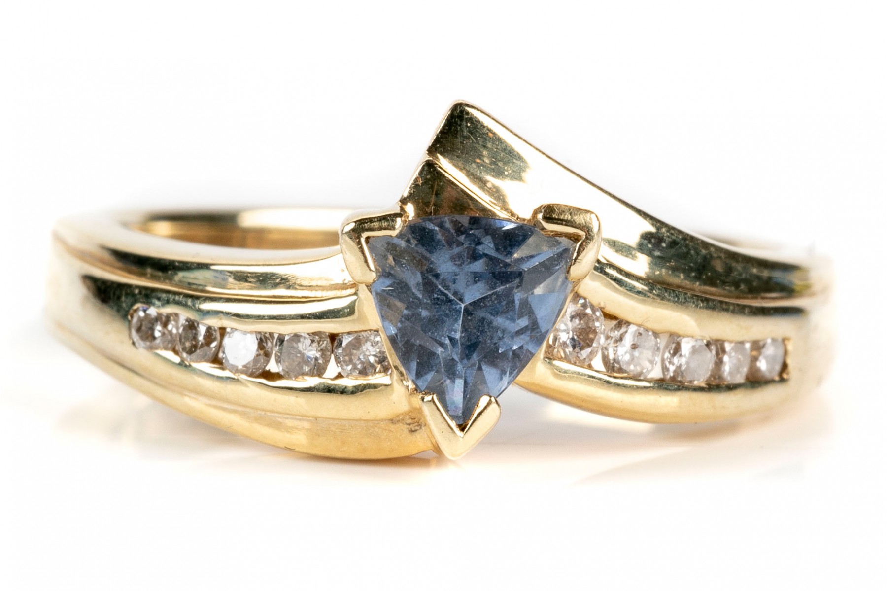 Single triangular cut tanzanite stone set into a 14K yellow gold ring. Flanking the tanzanite on both sides are five round brilliant cut and channel set diamonds. The tanzanite is approximately 0.47 cts., and the diamonds are approximately 0.19 TCW. Ring size 6.25.