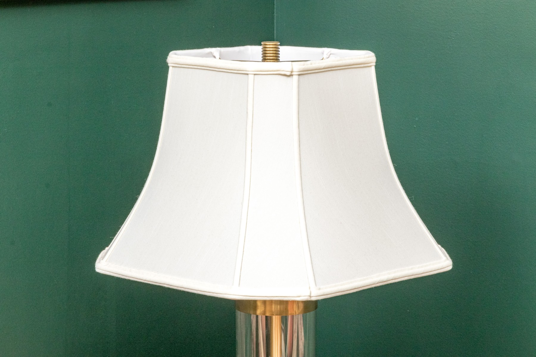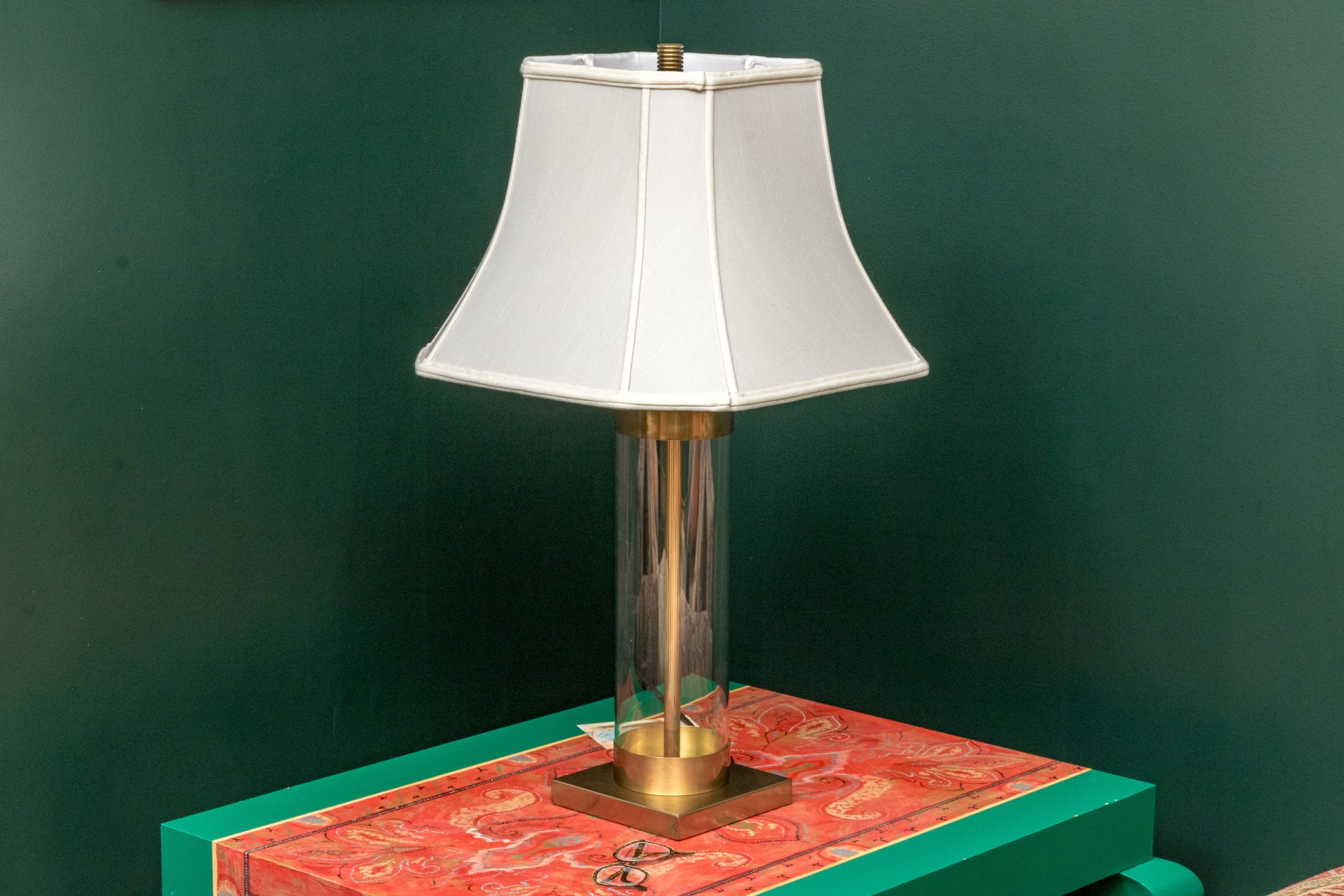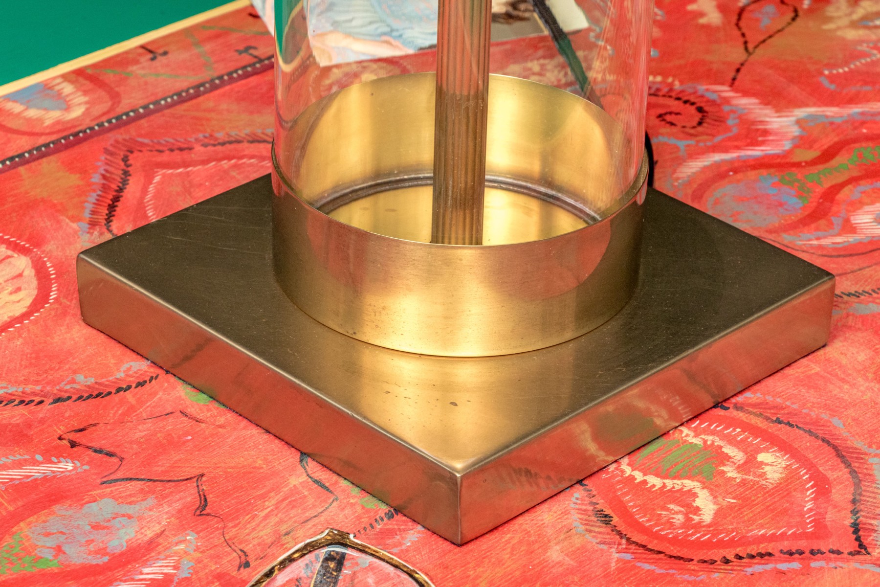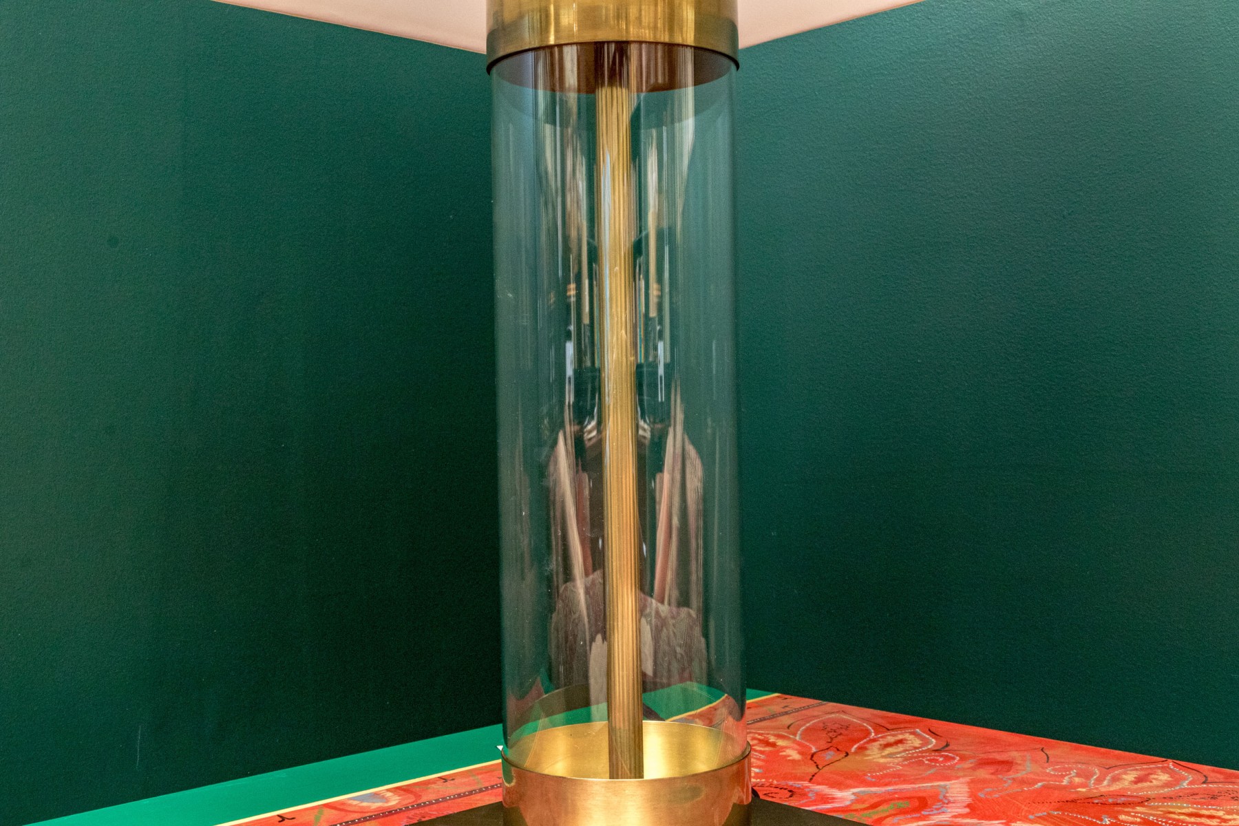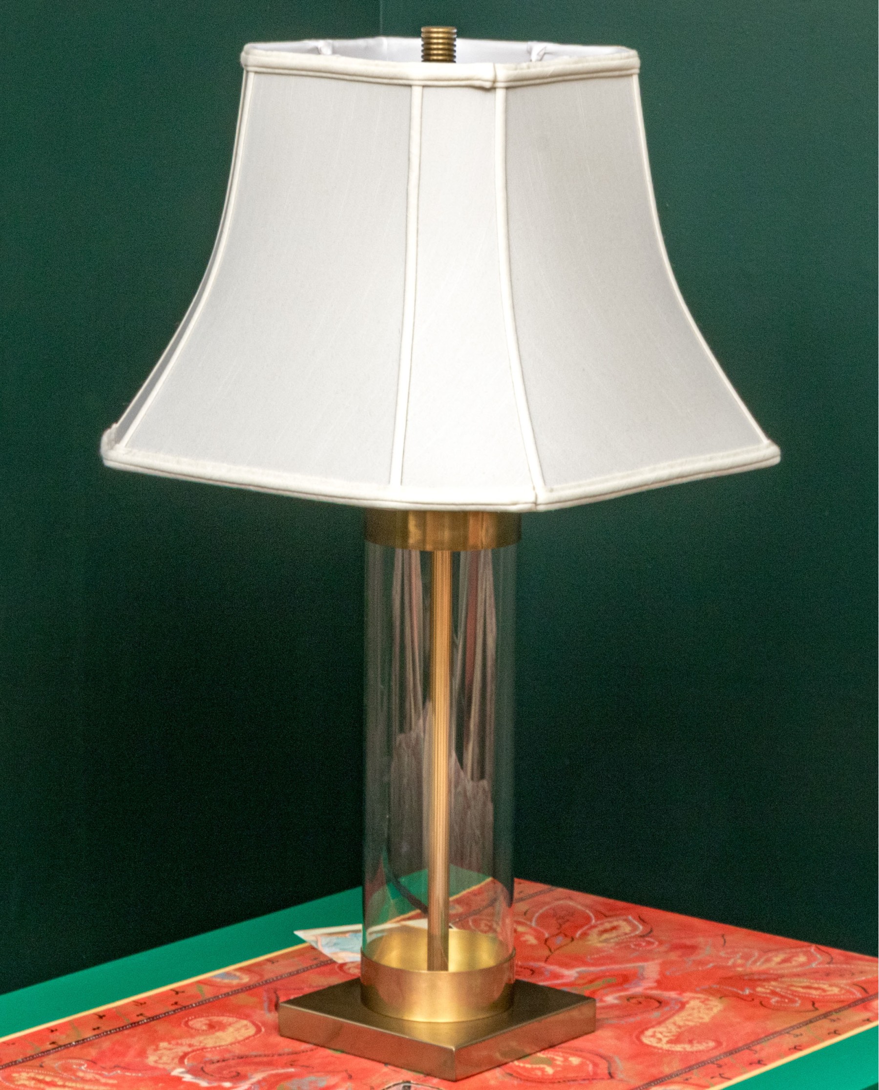 Handsome glass column surrounding fluted brass standard, on square brass base, with shaped octagonal silk shade.