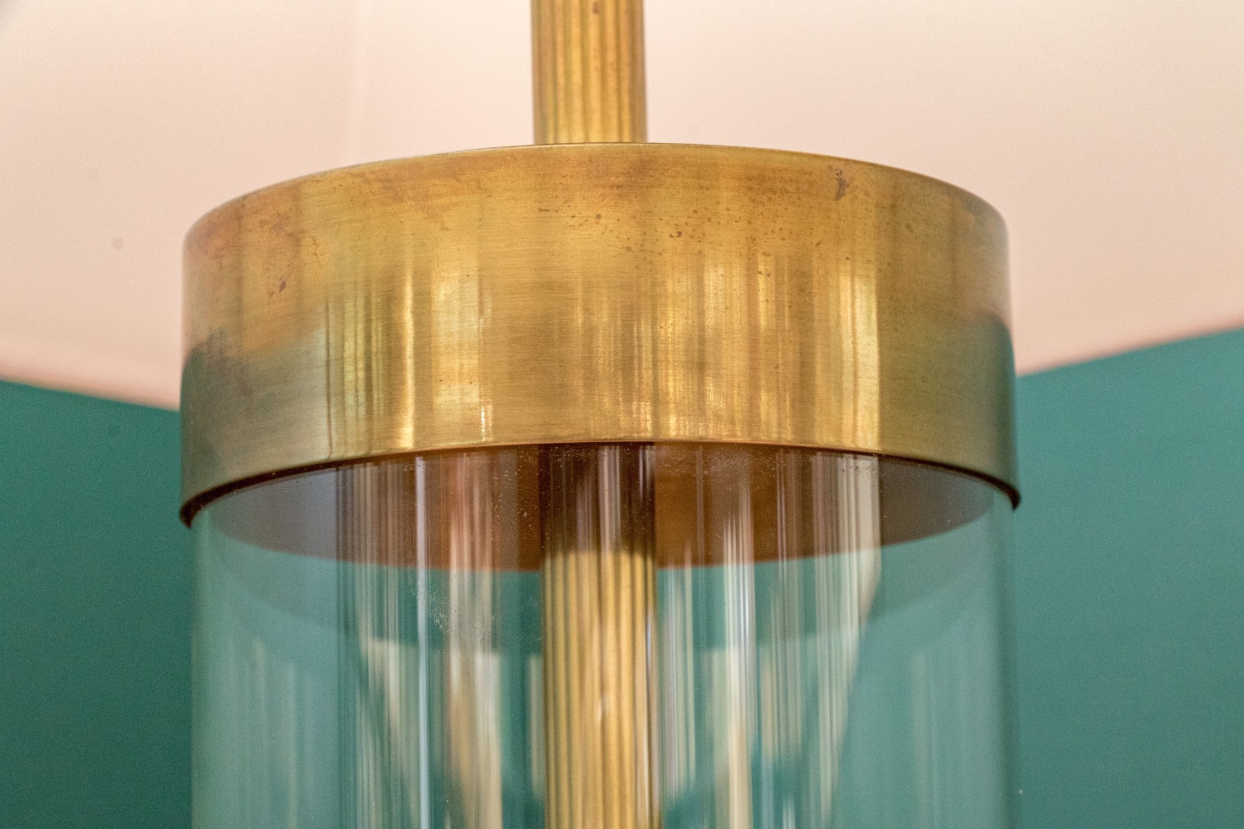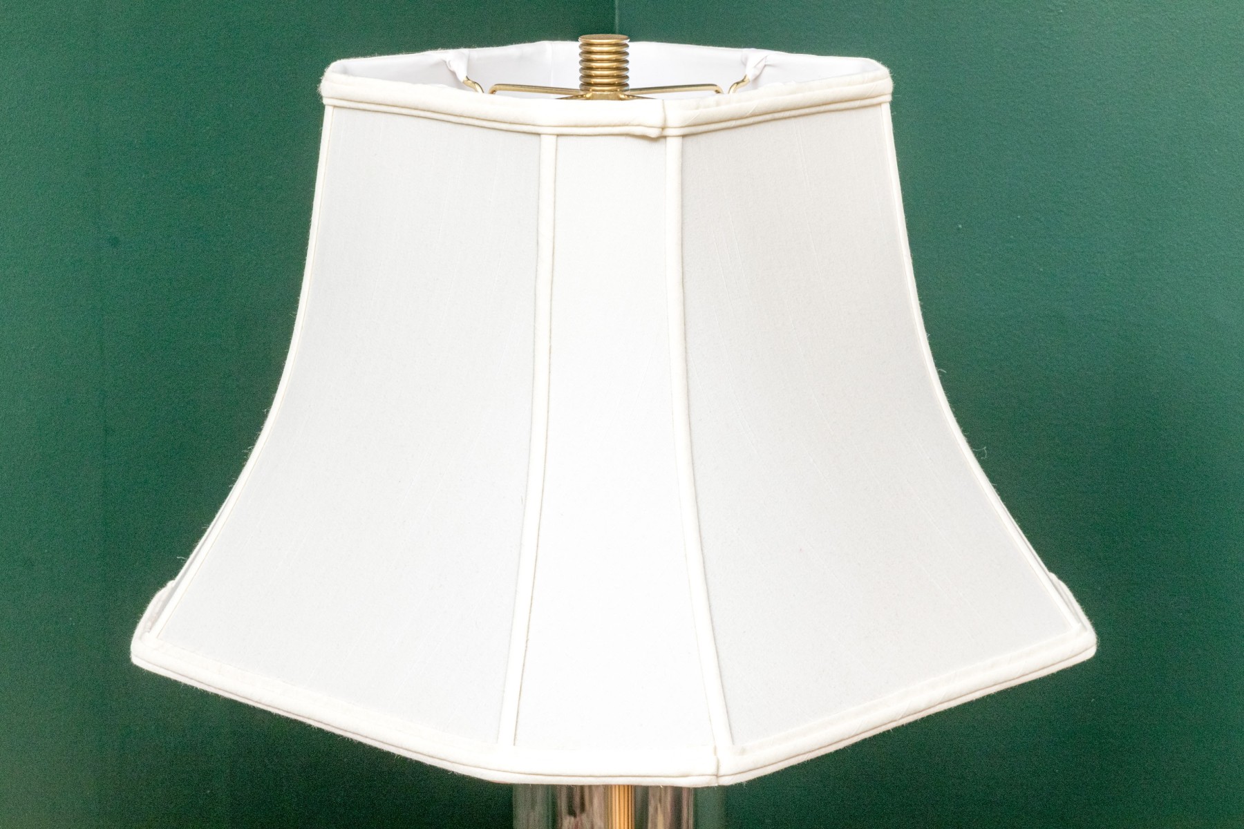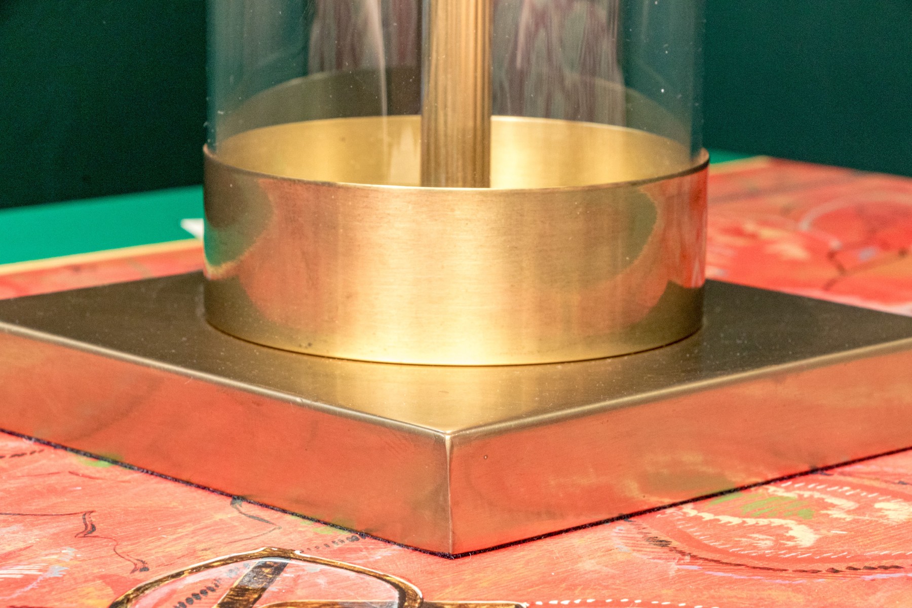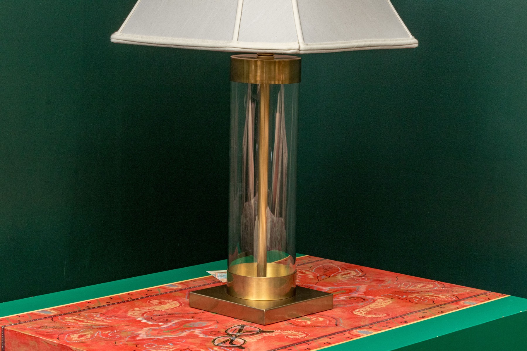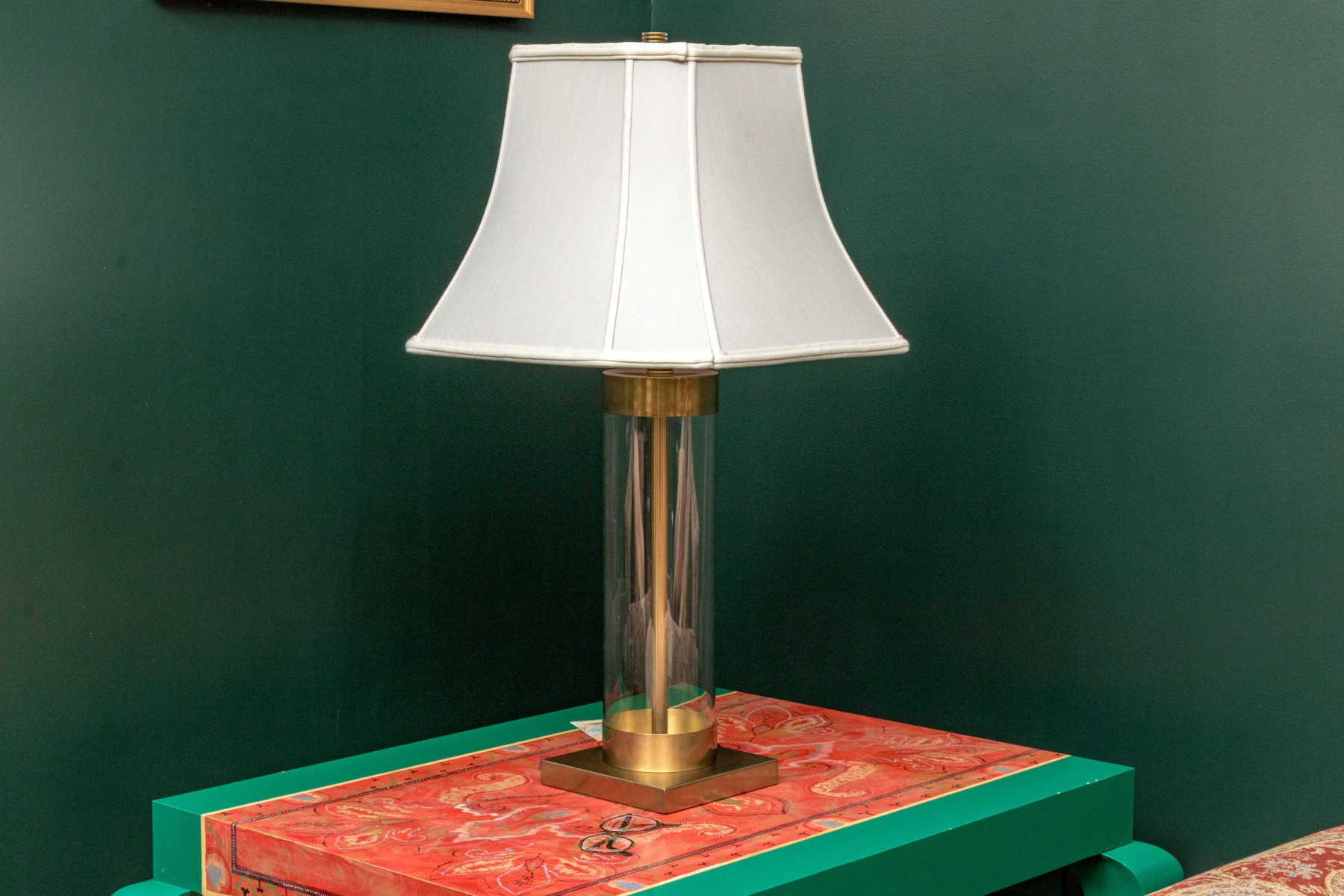 Handsome glass column surrounding fluted brass standard, on square brass base, with shaped octagonal silk shade.
