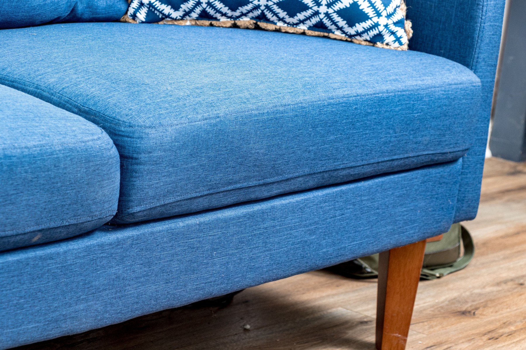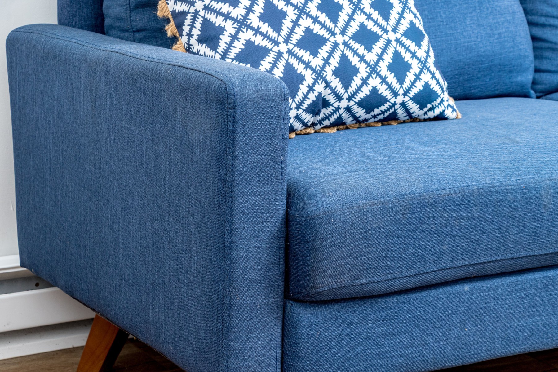 On four square tapered legs with blue upholstery including two affixed seat cushions and two loose upholstered back cushions, along with pair of accent pillows.