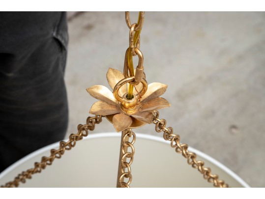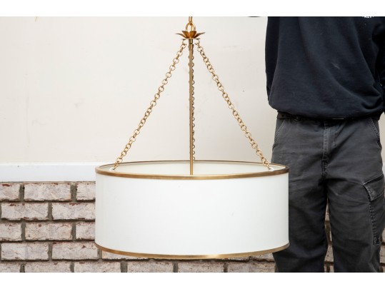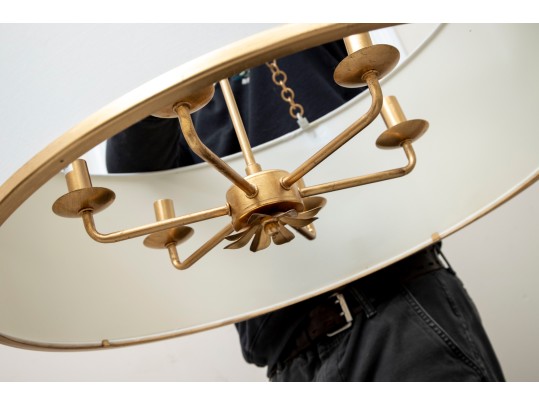 A modernist gold-tone six-arm drum chandelier, featuring a sleek, minimalist design with evenly spaced arms providing light diffused by a white drum shade.