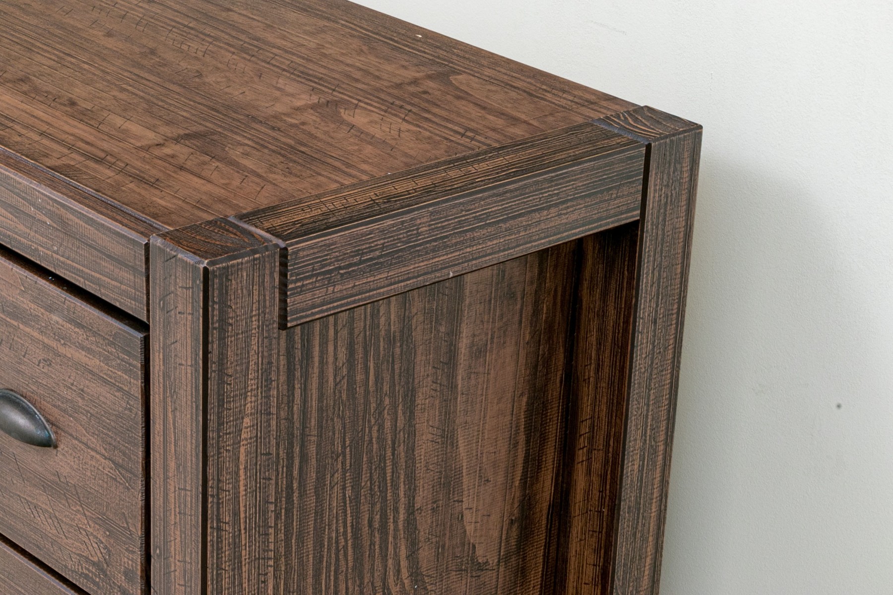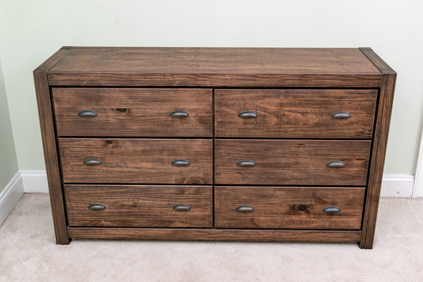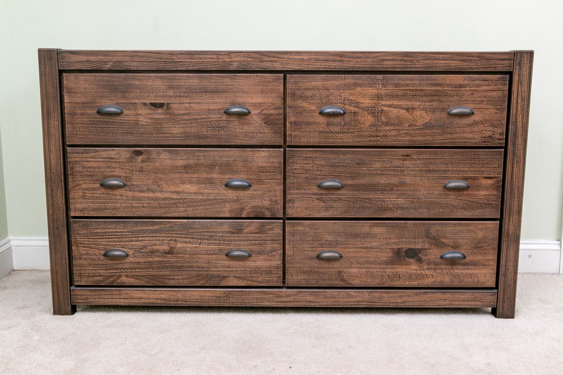 A dark stained textured wood double dresser with two rows of three drawers with metal pulls. Banded recessed sides.