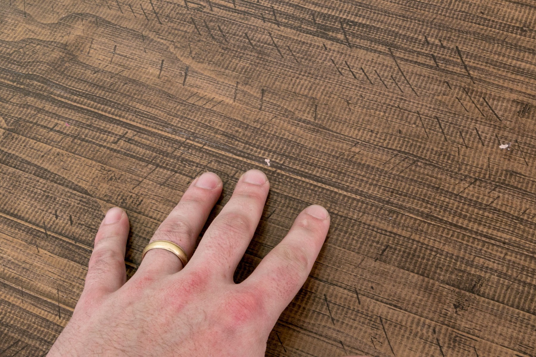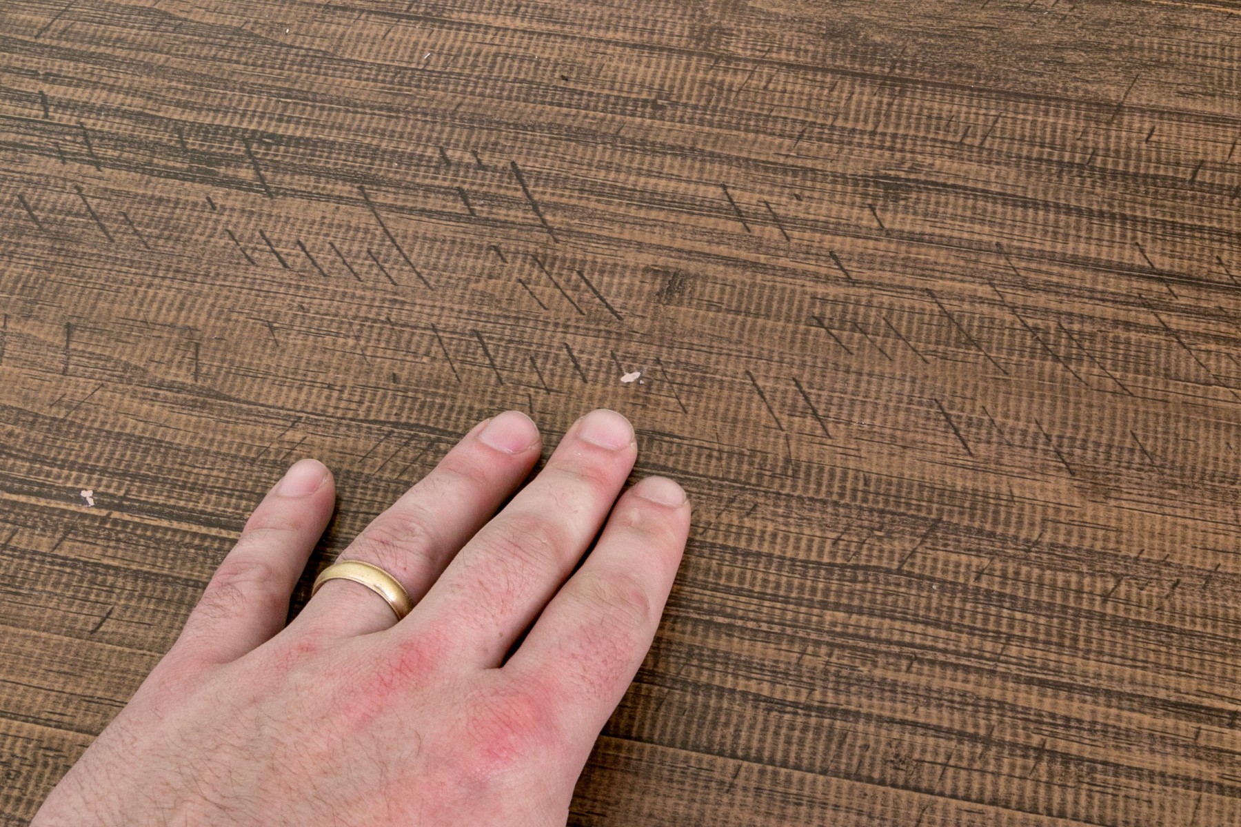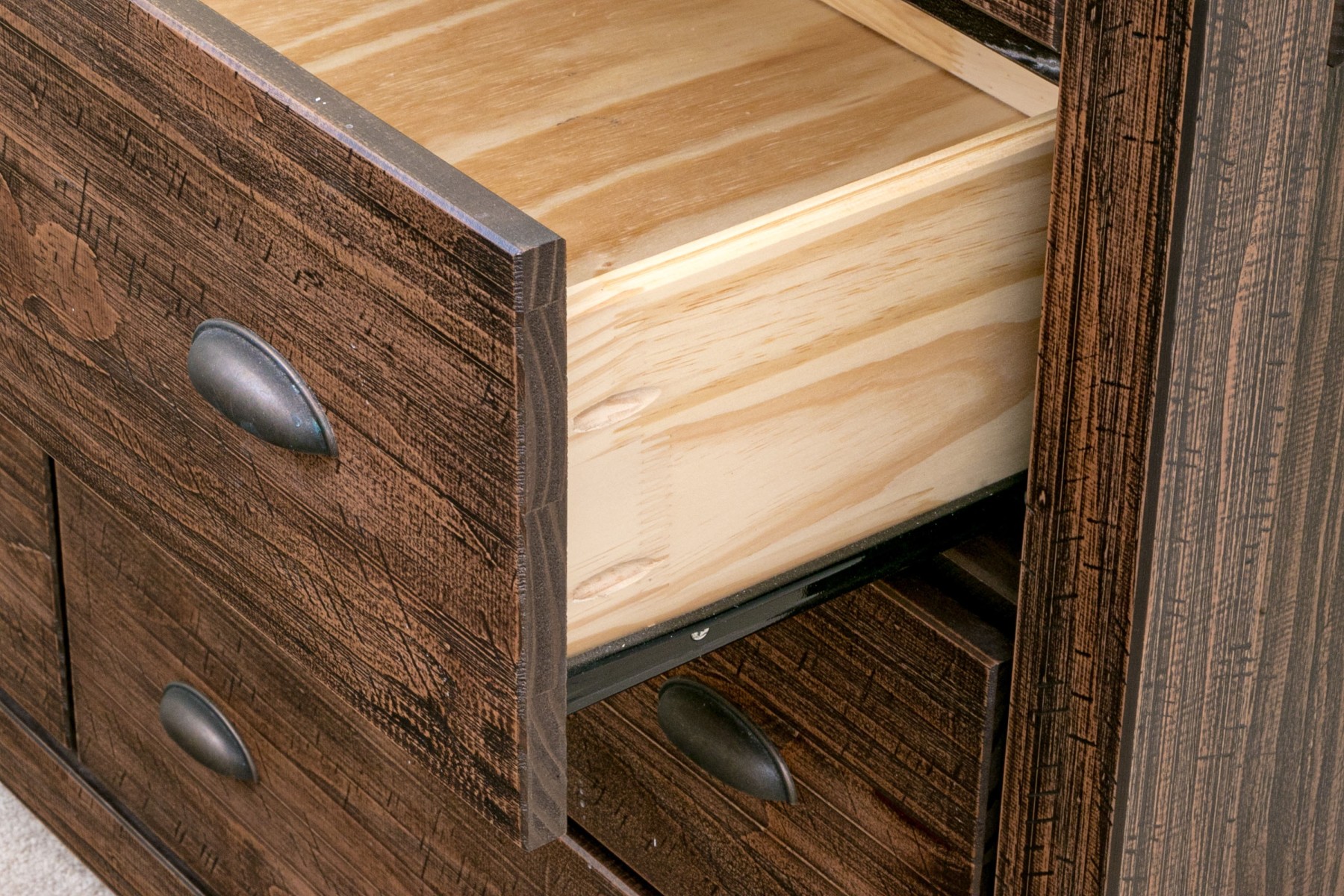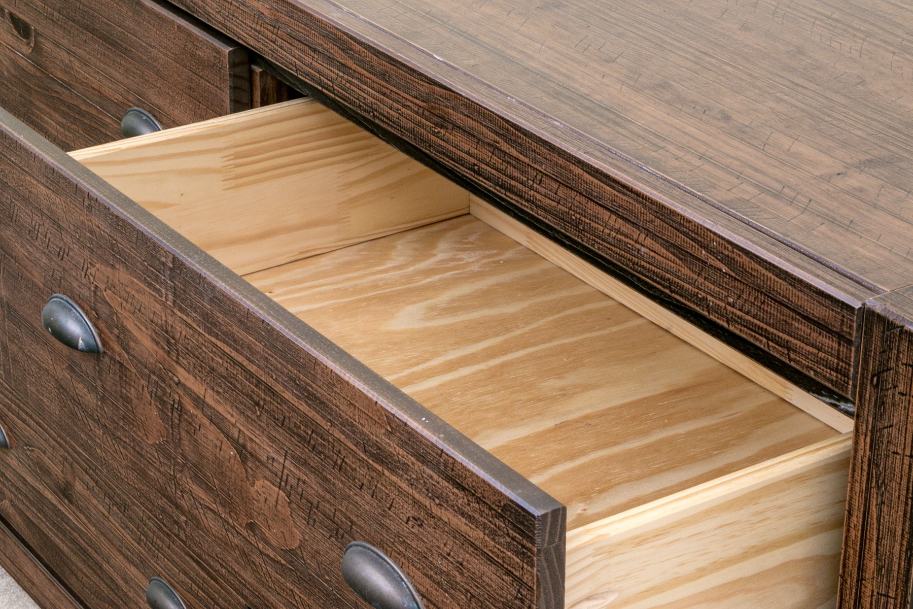 A dark stained textured wood double dresser with two rows of three drawers with metal pulls. Banded recessed sides.