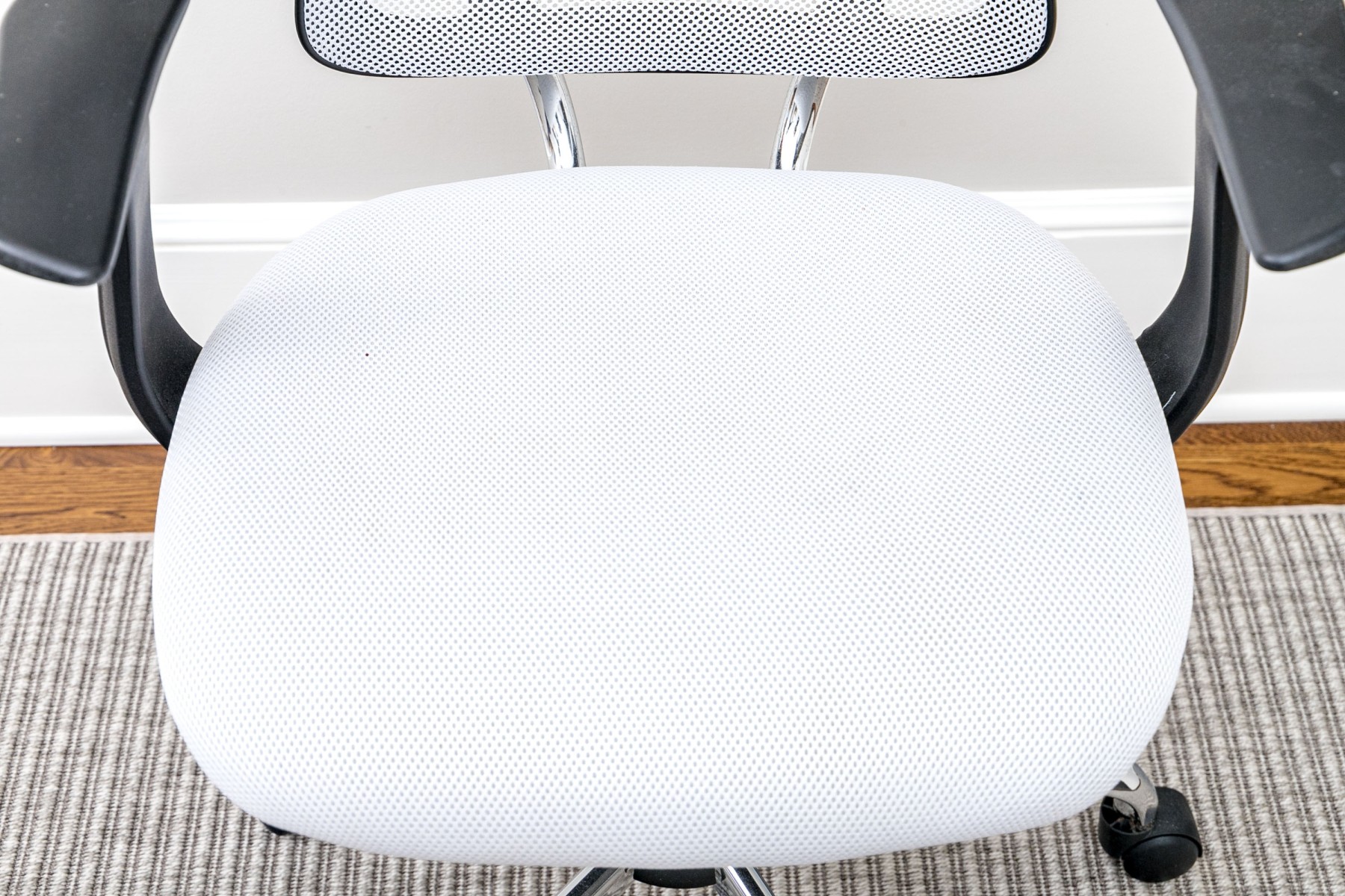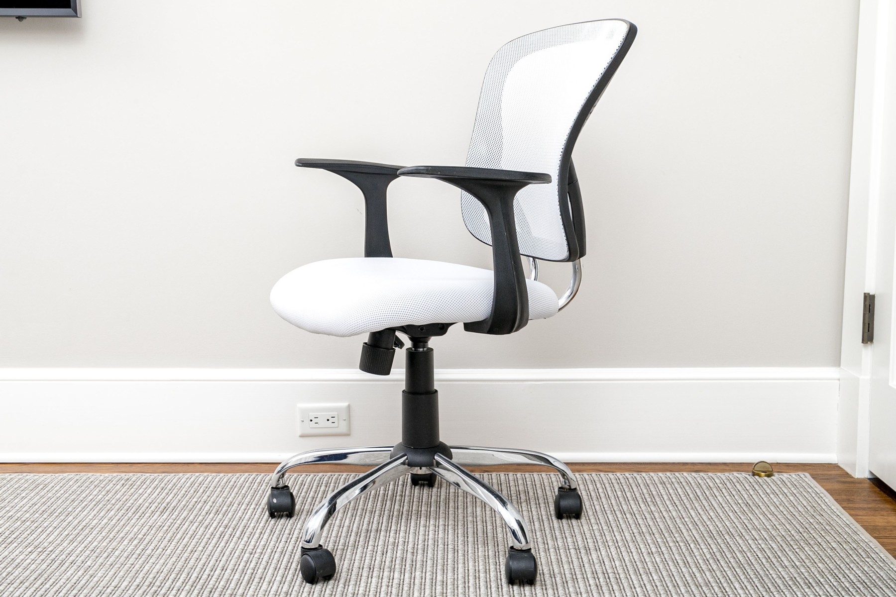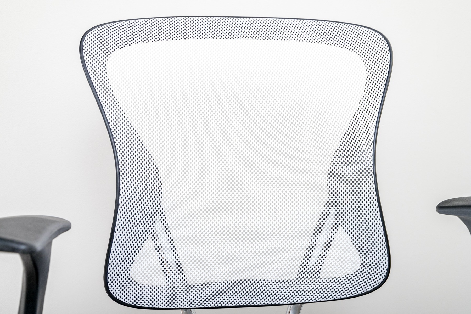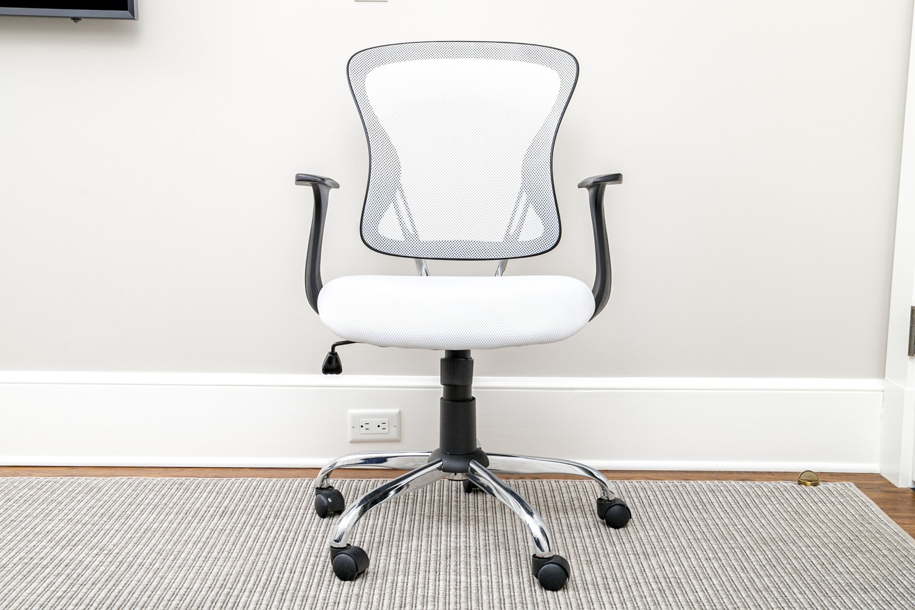 A modern white desk chair, likely Porthos Home "Cyrus," in sleek white and black, Features an airy mesh back with an ergonomic curve raised on chrome bars leading to a comfortable seat with black armrests. Raised over an adjustable pedestal on a five-spoked chrome base with caster feet.