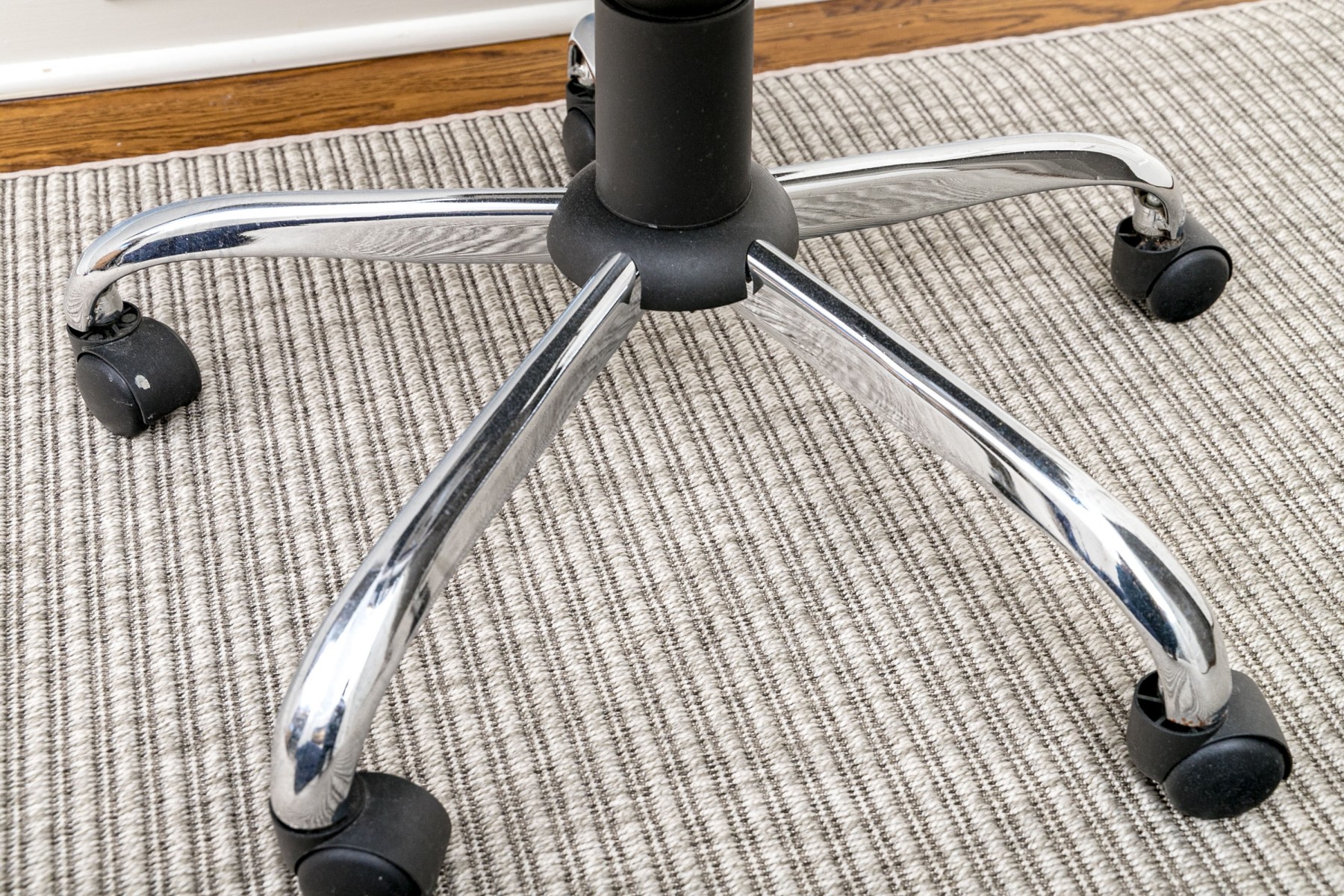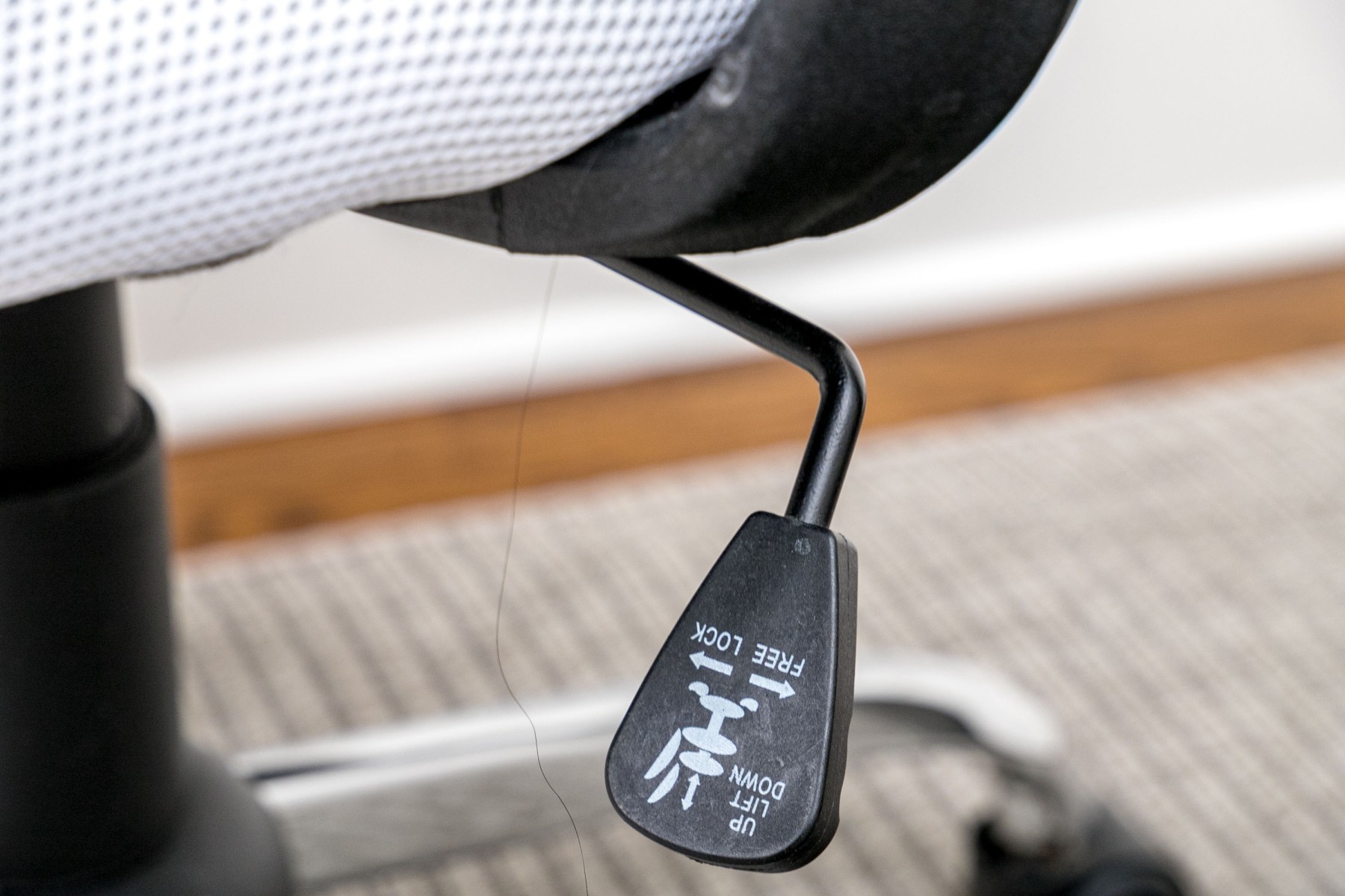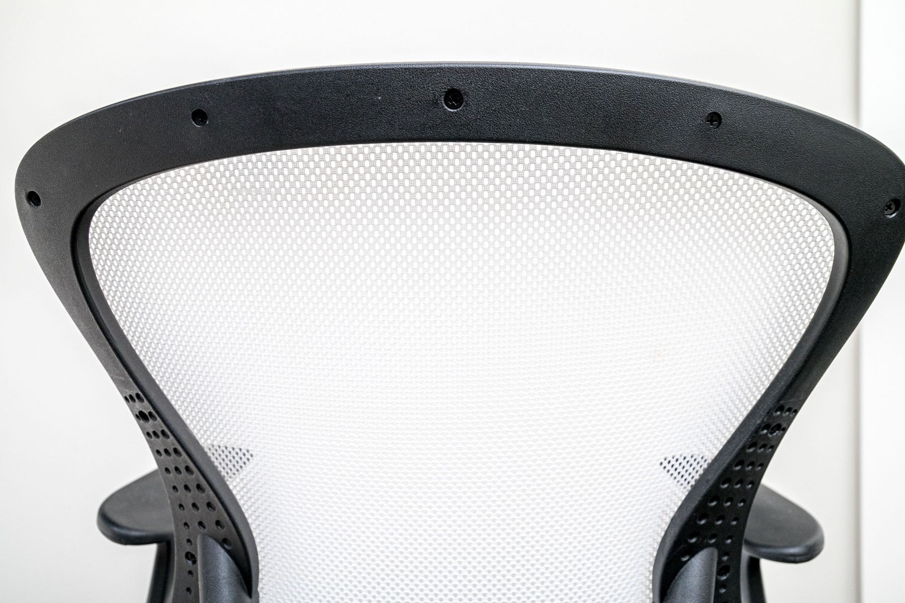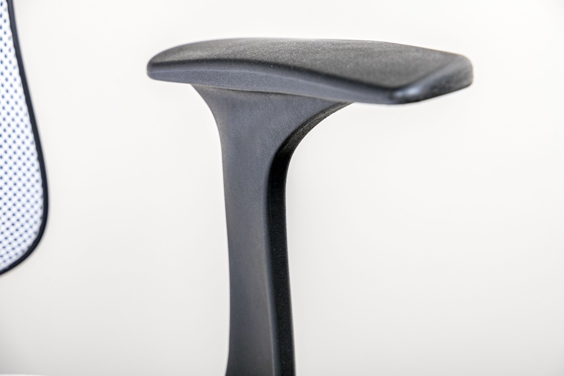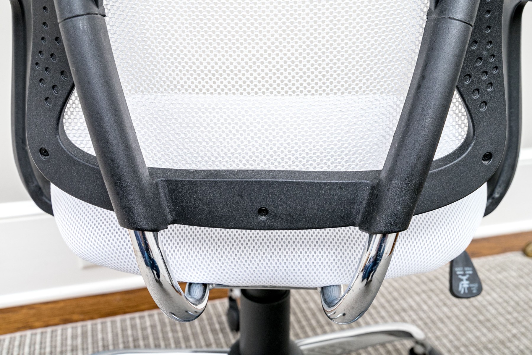 A modern white desk chair, likely Porthos Home "Cyrus," in sleek white and black, Features an airy mesh back with an ergonomic curve raised on chrome bars leading to a comfortable seat with black armrests. Raised over an adjustable pedestal on a five-spoked chrome base with caster feet.