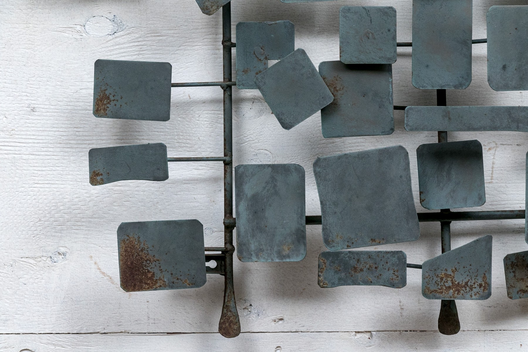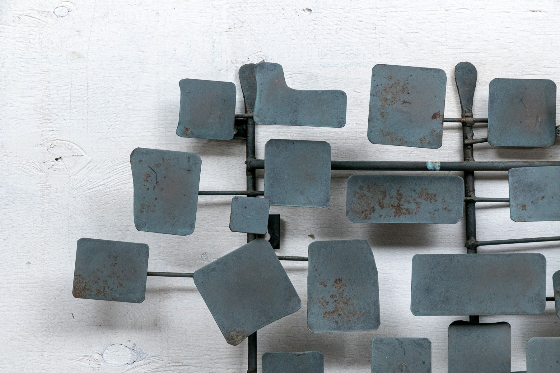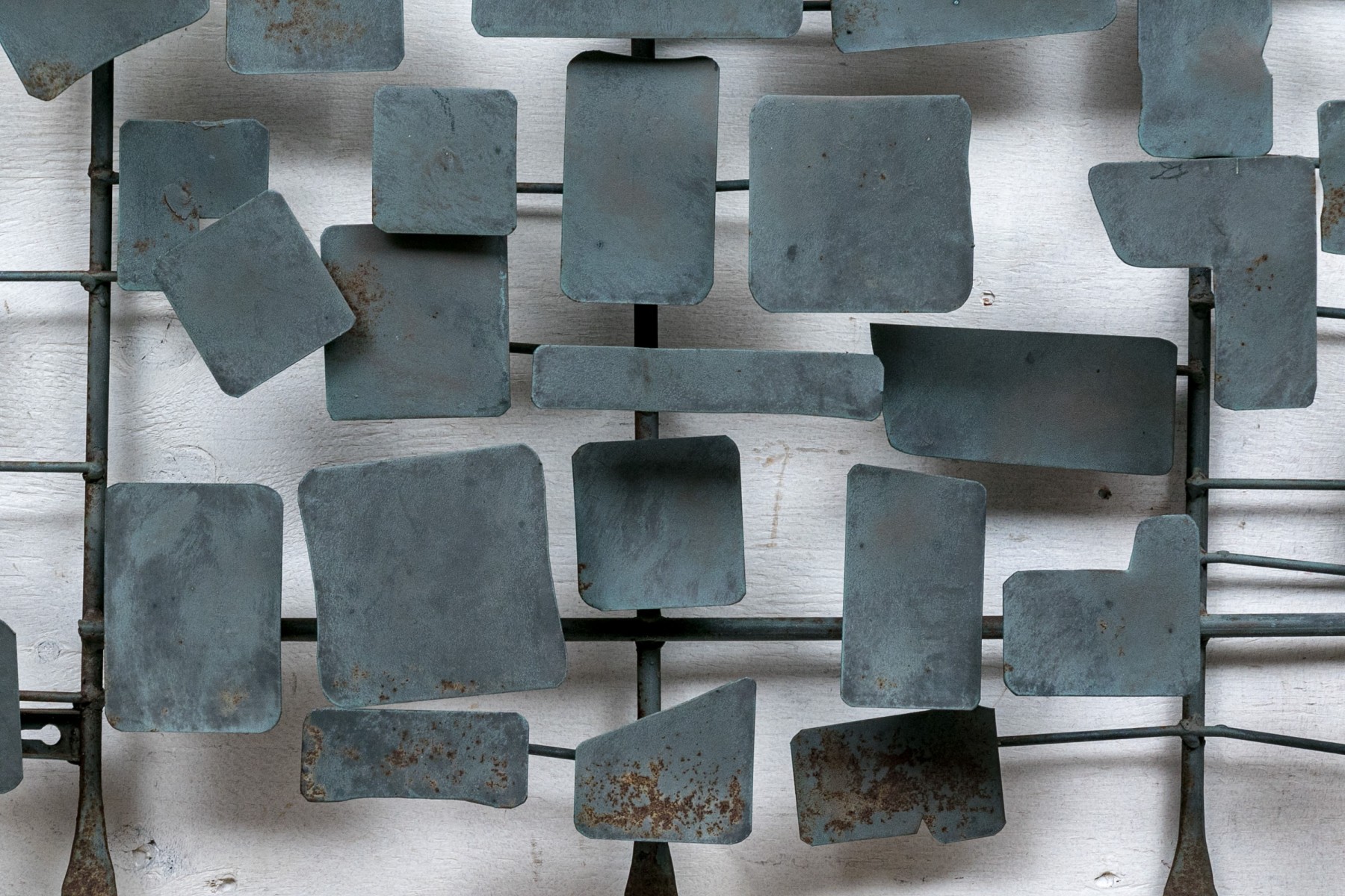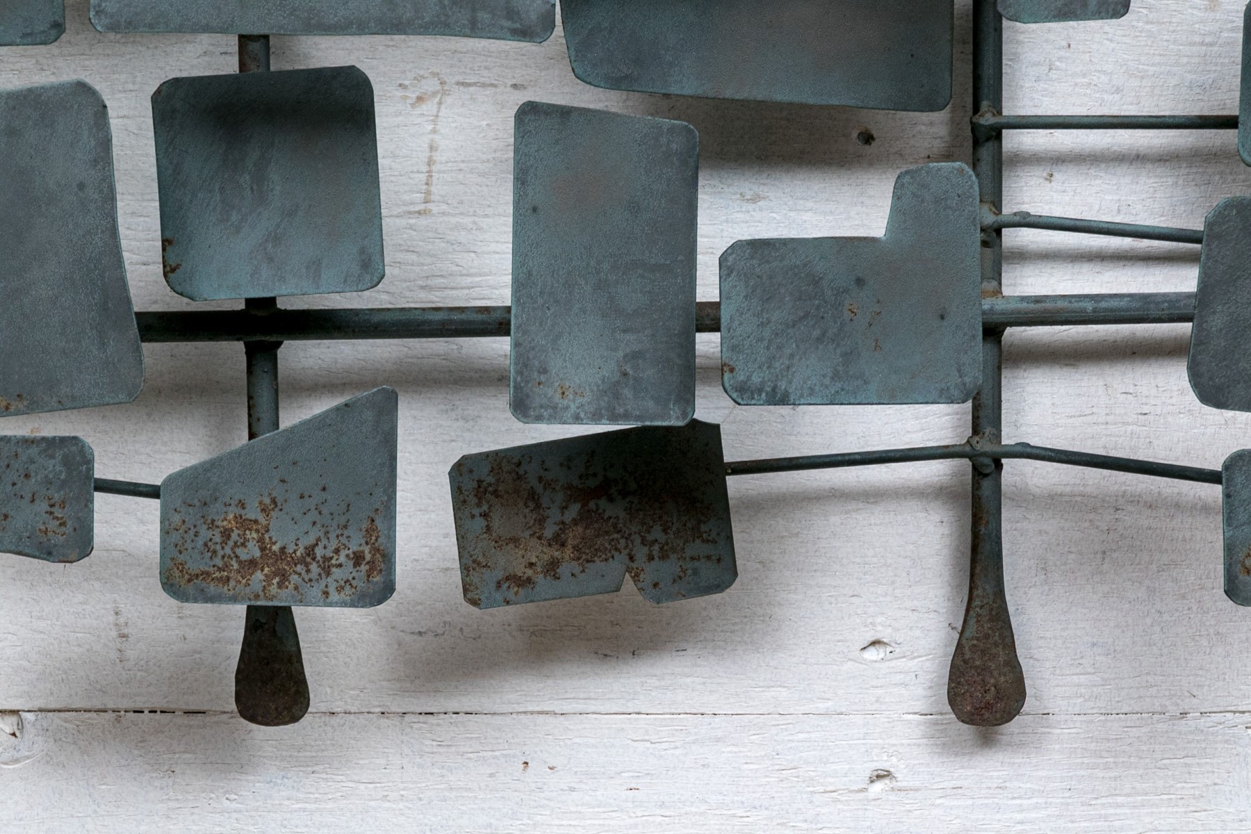 A 3-D wall sculpture made up of gray painted and staggered metal plates in different shapes attached to rods. With tabs for hanging.
