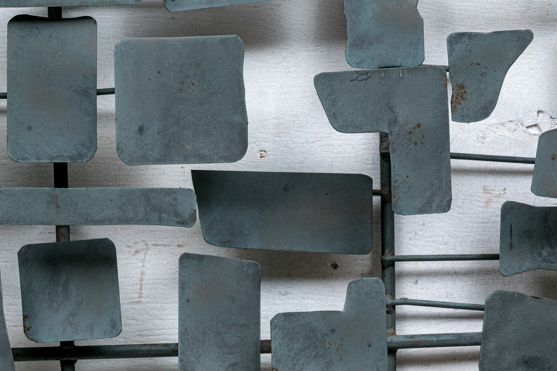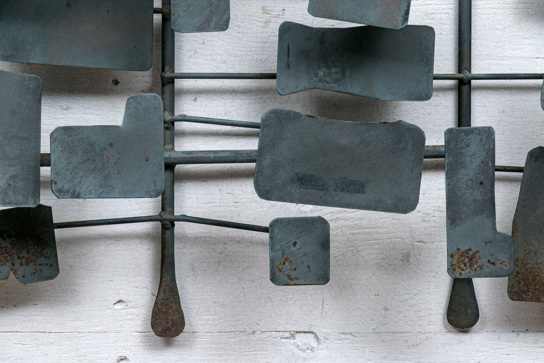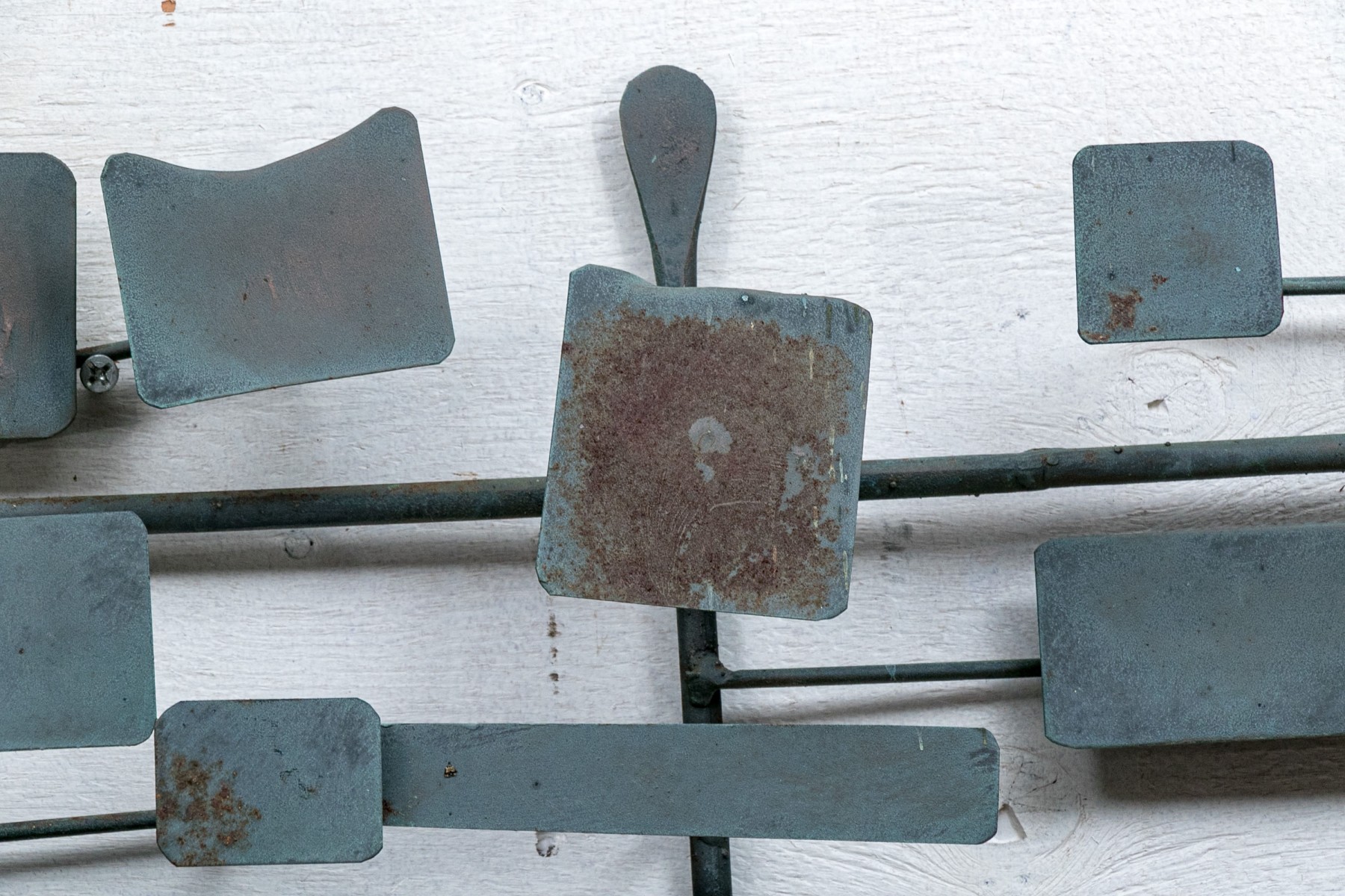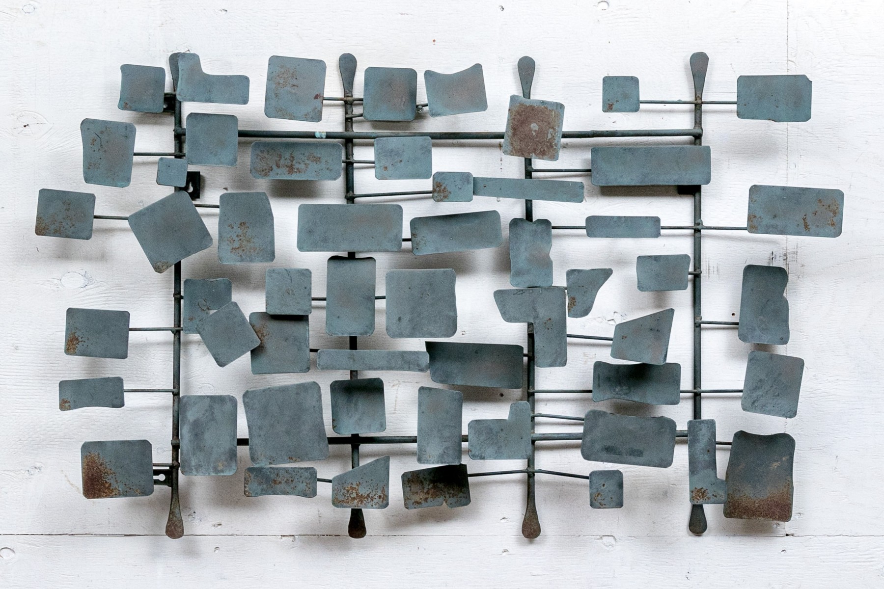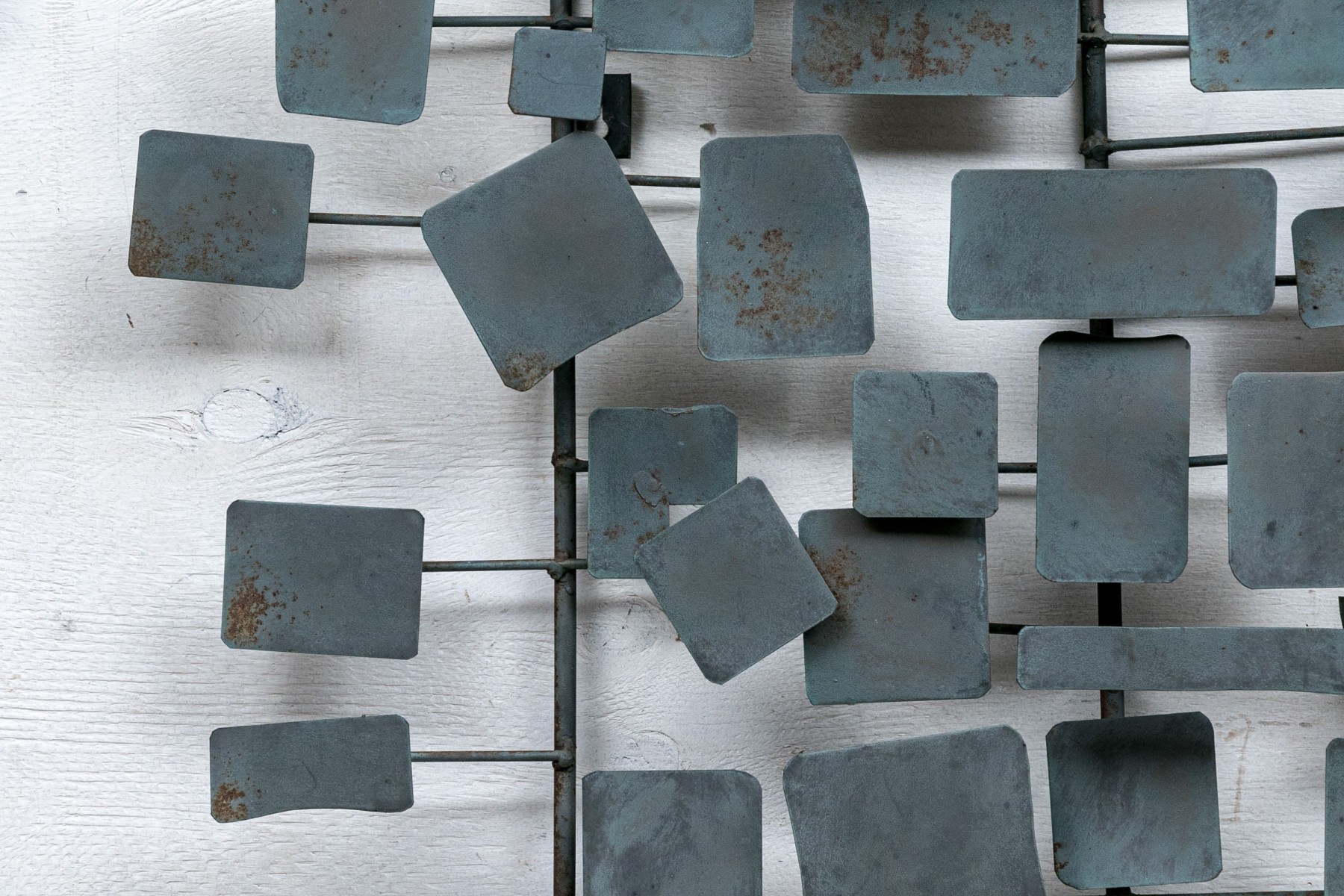 A 3-D wall sculpture made up of gray painted and staggered metal plates in different shapes attached to rods. With tabs for hanging.