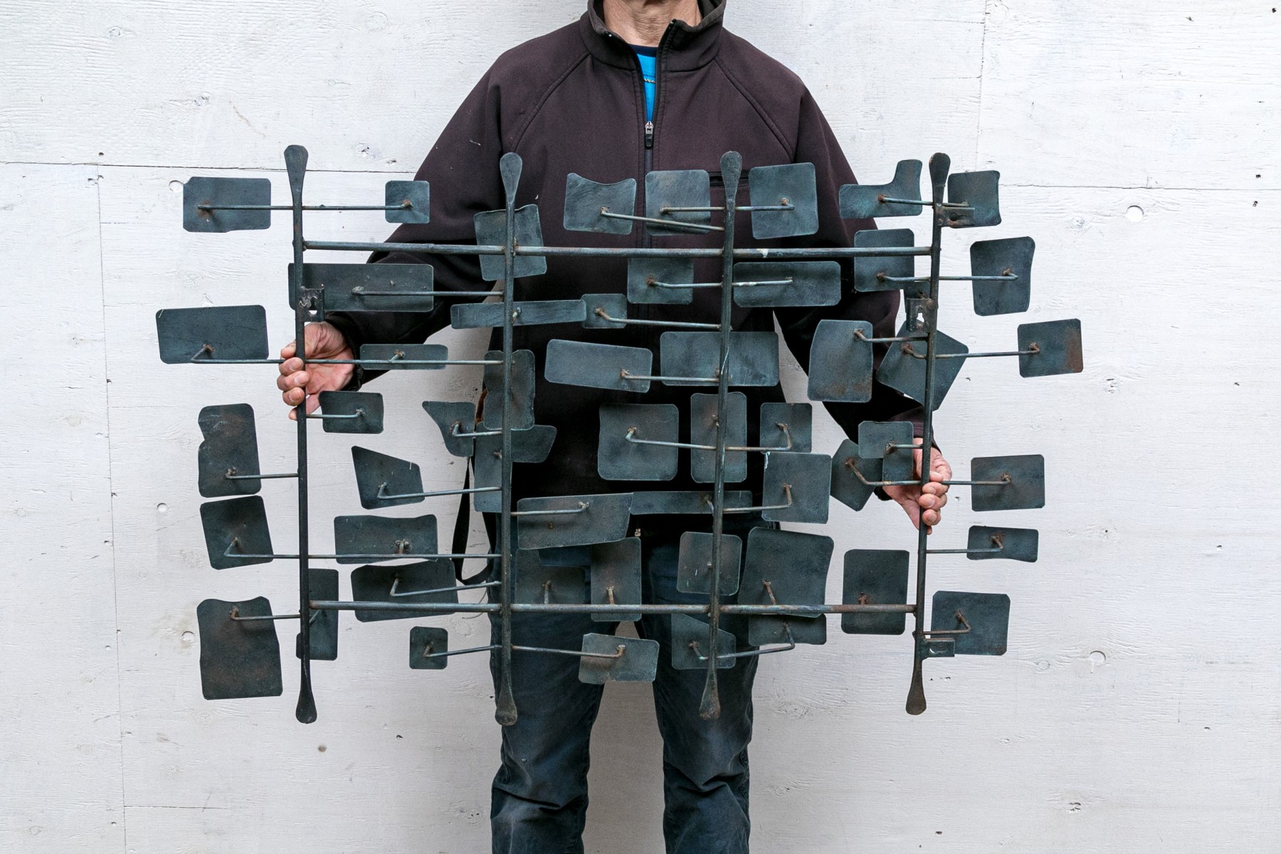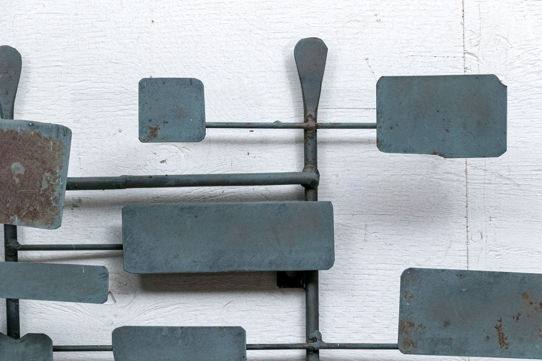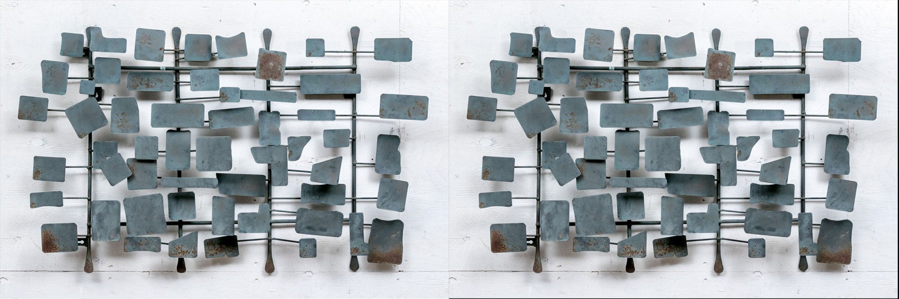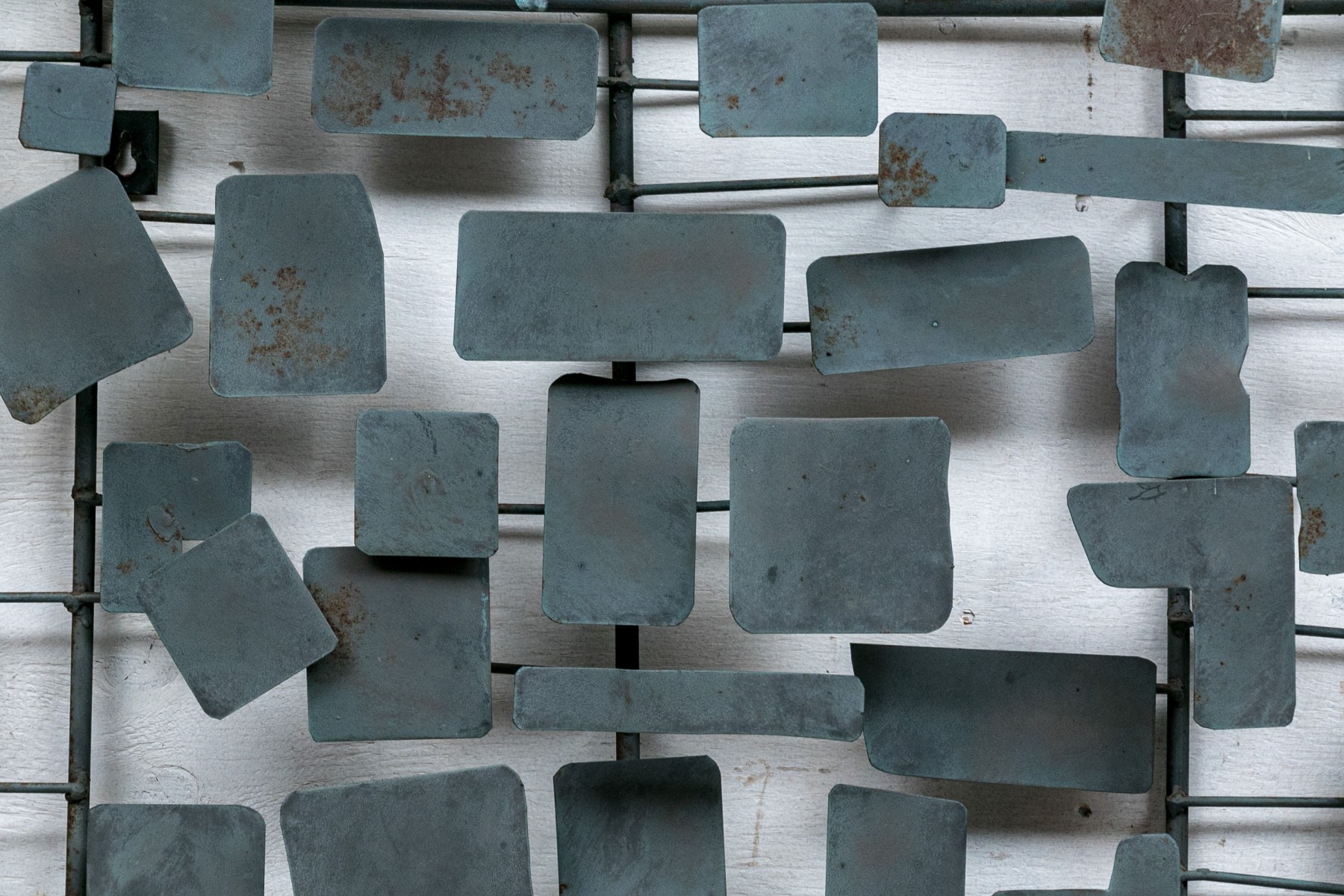 A 3-D wall sculpture made up of gray painted and staggered metal plates in different shapes attached to rods. With tabs for hanging.