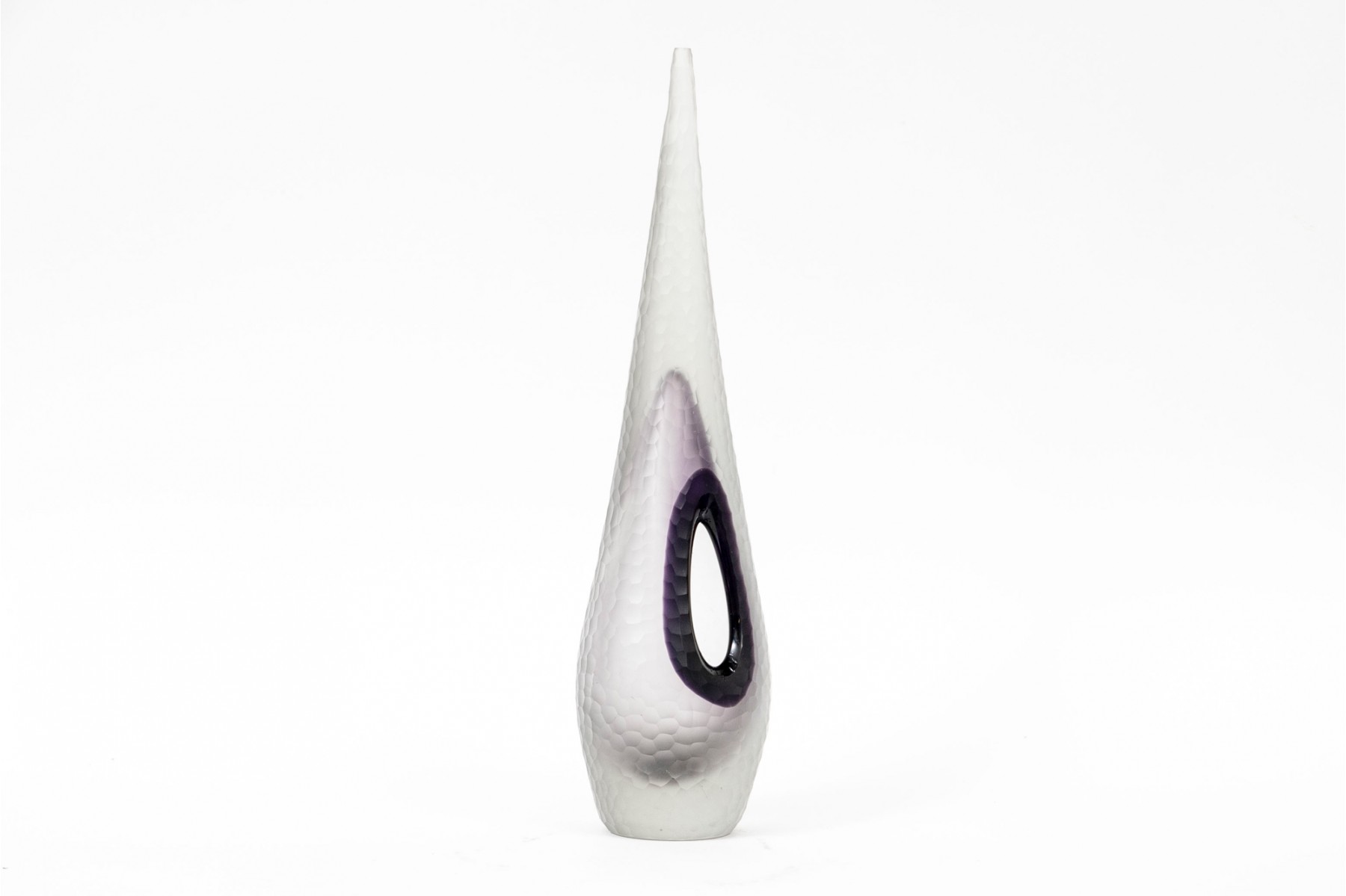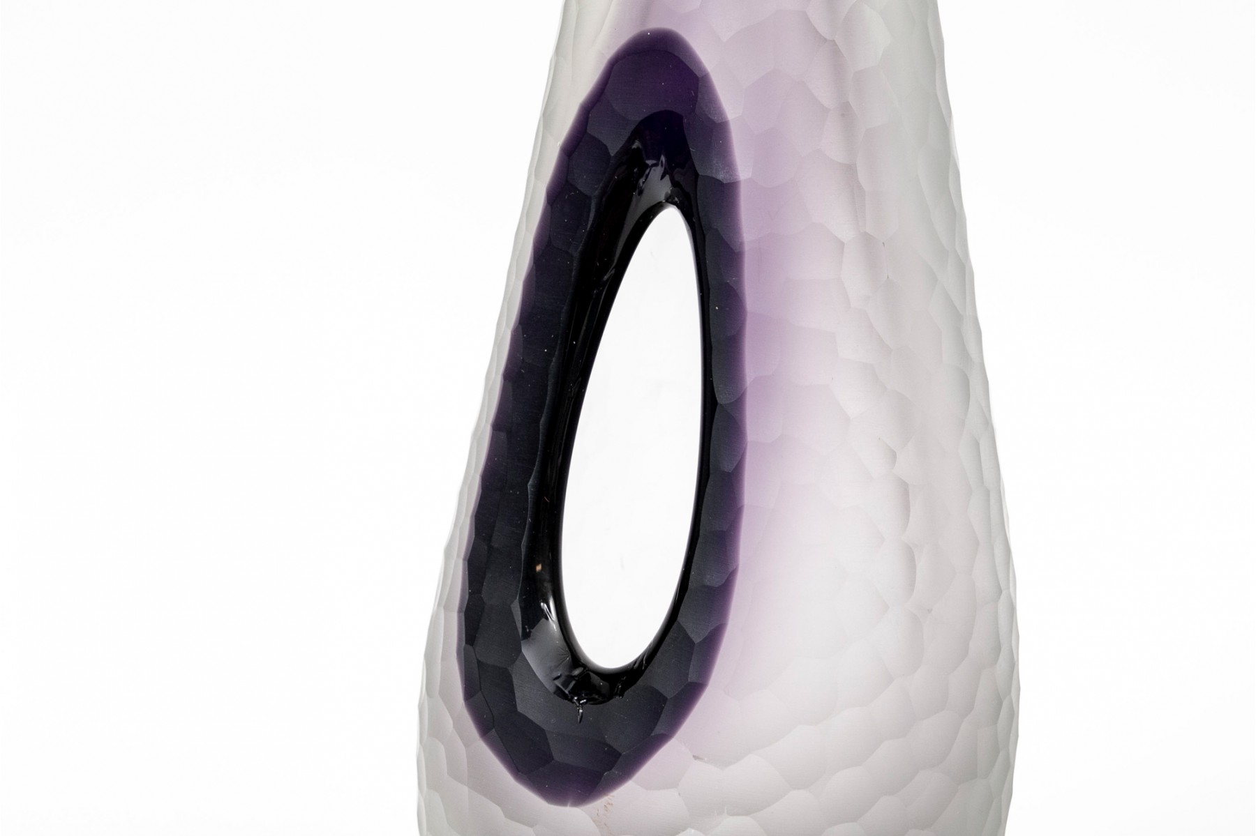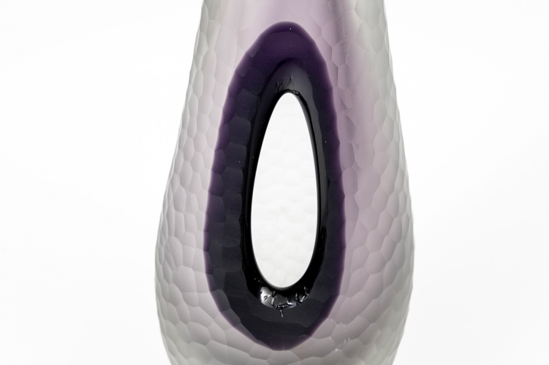 A tall teardrop shape in frosted gray glass with a hammered look surface. With a purple-black edged oval opening for the vase. Unsigned.
