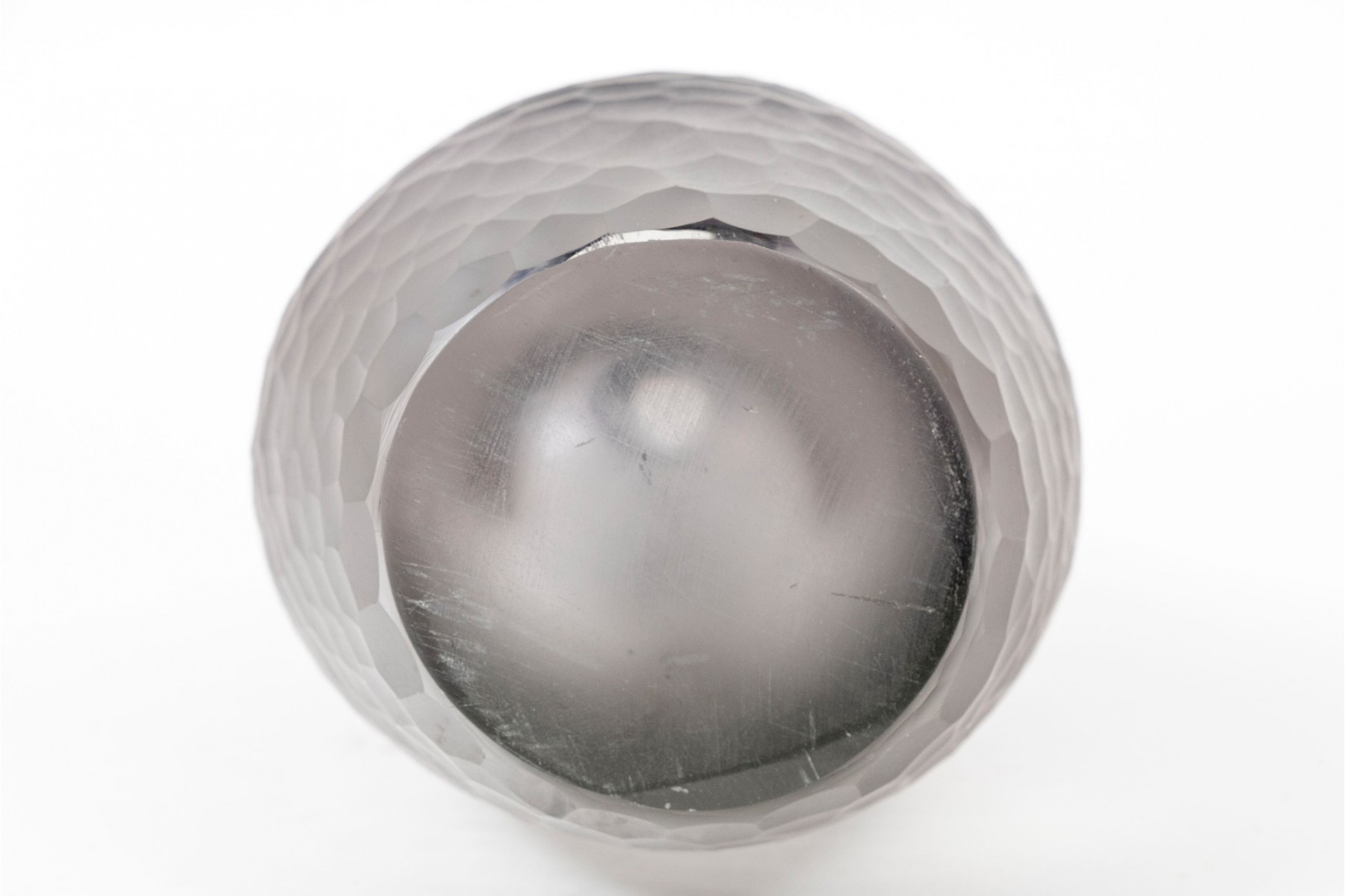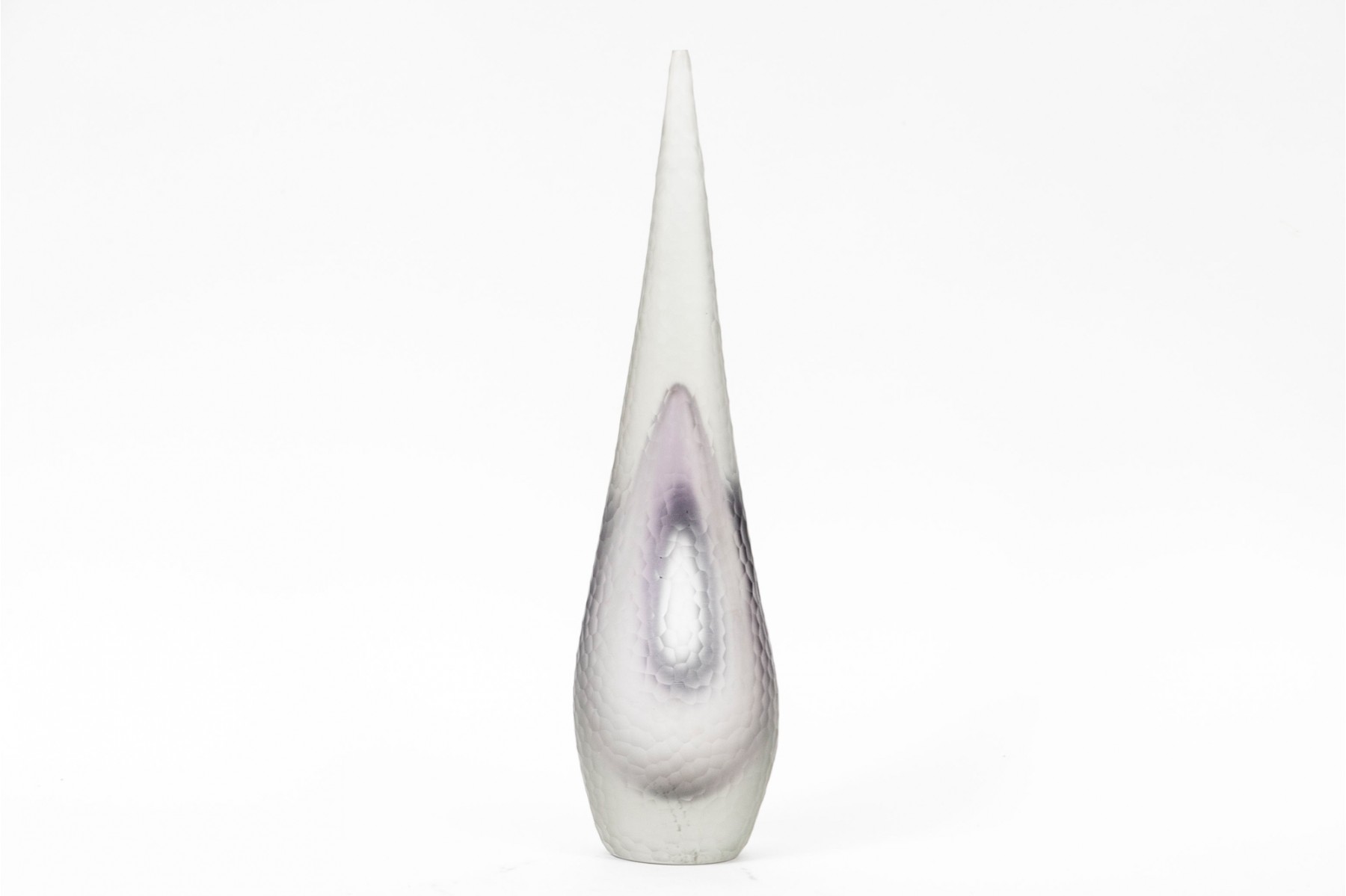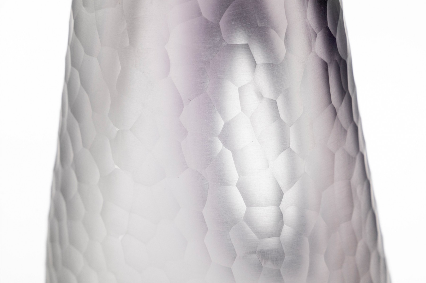 A tall teardrop shape in frosted gray glass with a hammered look surface. With a purple-black edged oval opening for the vase. Unsigned.