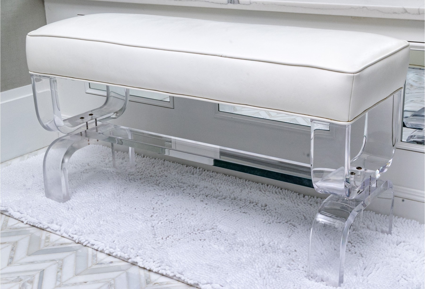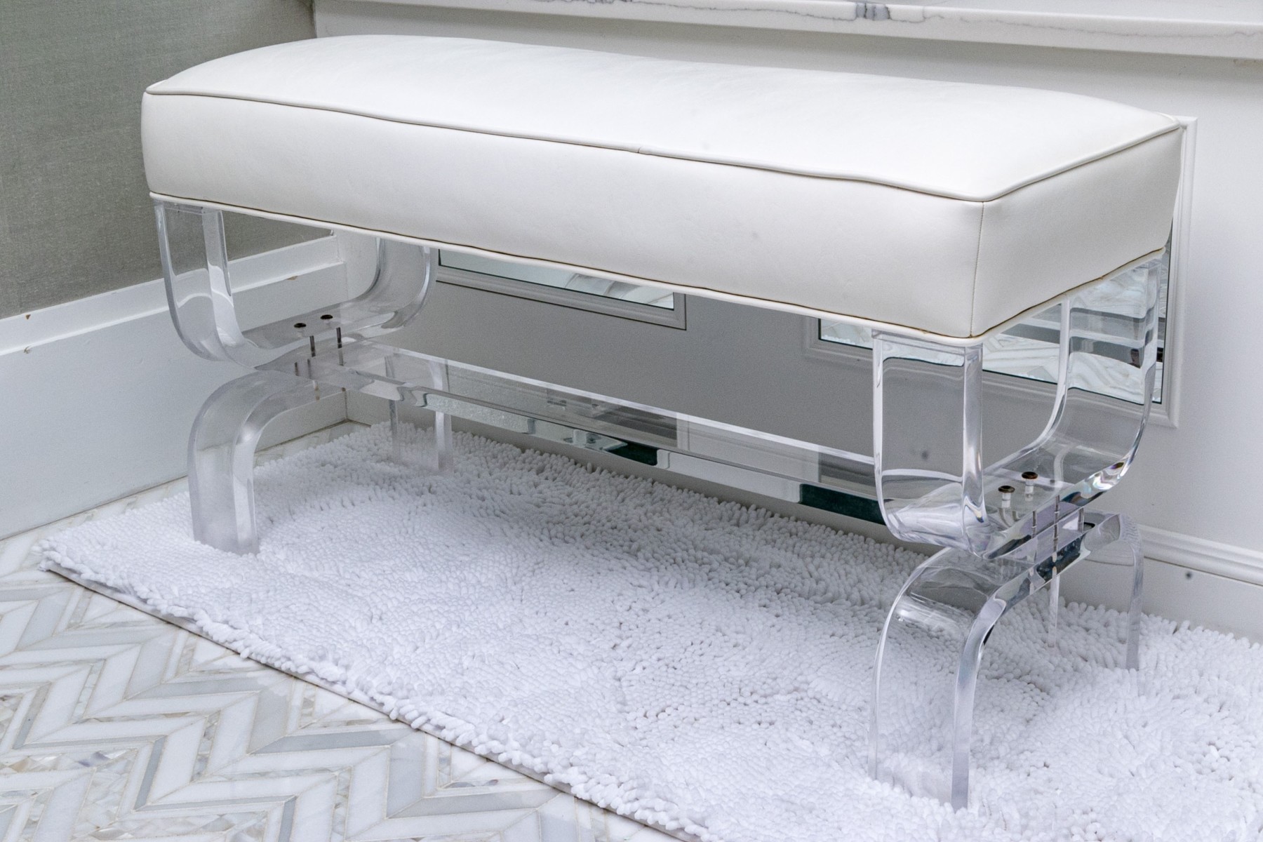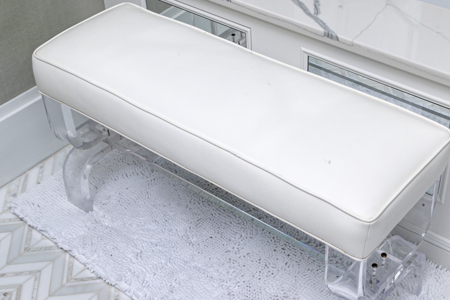 Elevate your master bath with the perfect blend of style and functionality. This bench is crafted from scuba-grade materials, ensuring durability and water resistance ideal for bathroom environments. Featuring a thick cushion for comfort, it rests elegantly on a lucite base with a center stretcher support, combining modern aesthetics with practical design. Perfect for adding a touch of luxury and functionality to your space.