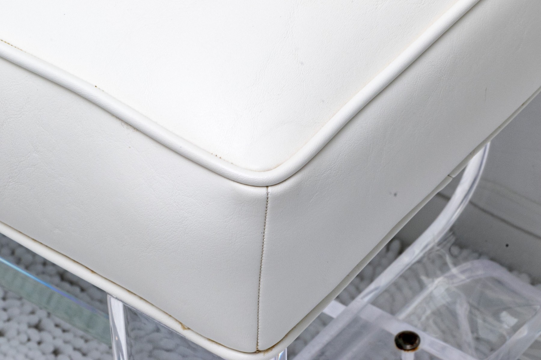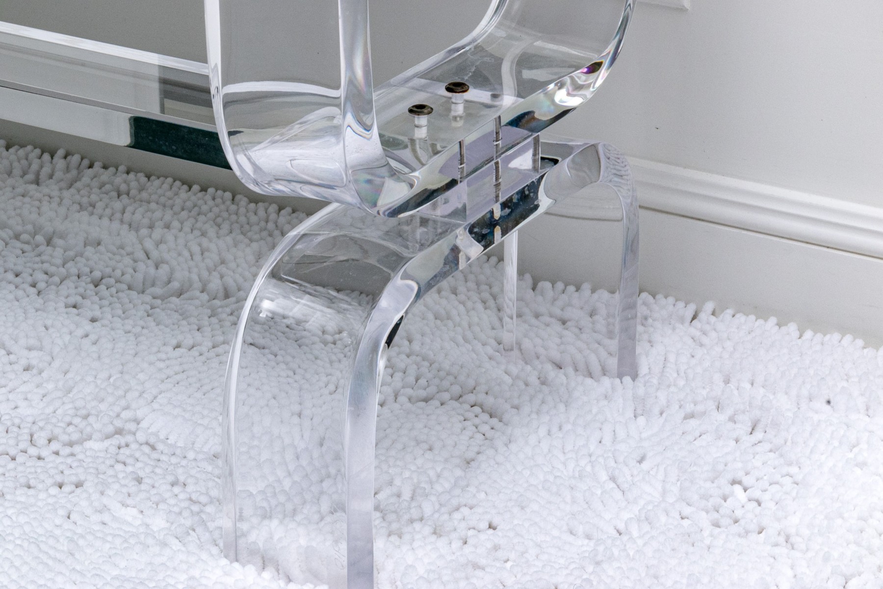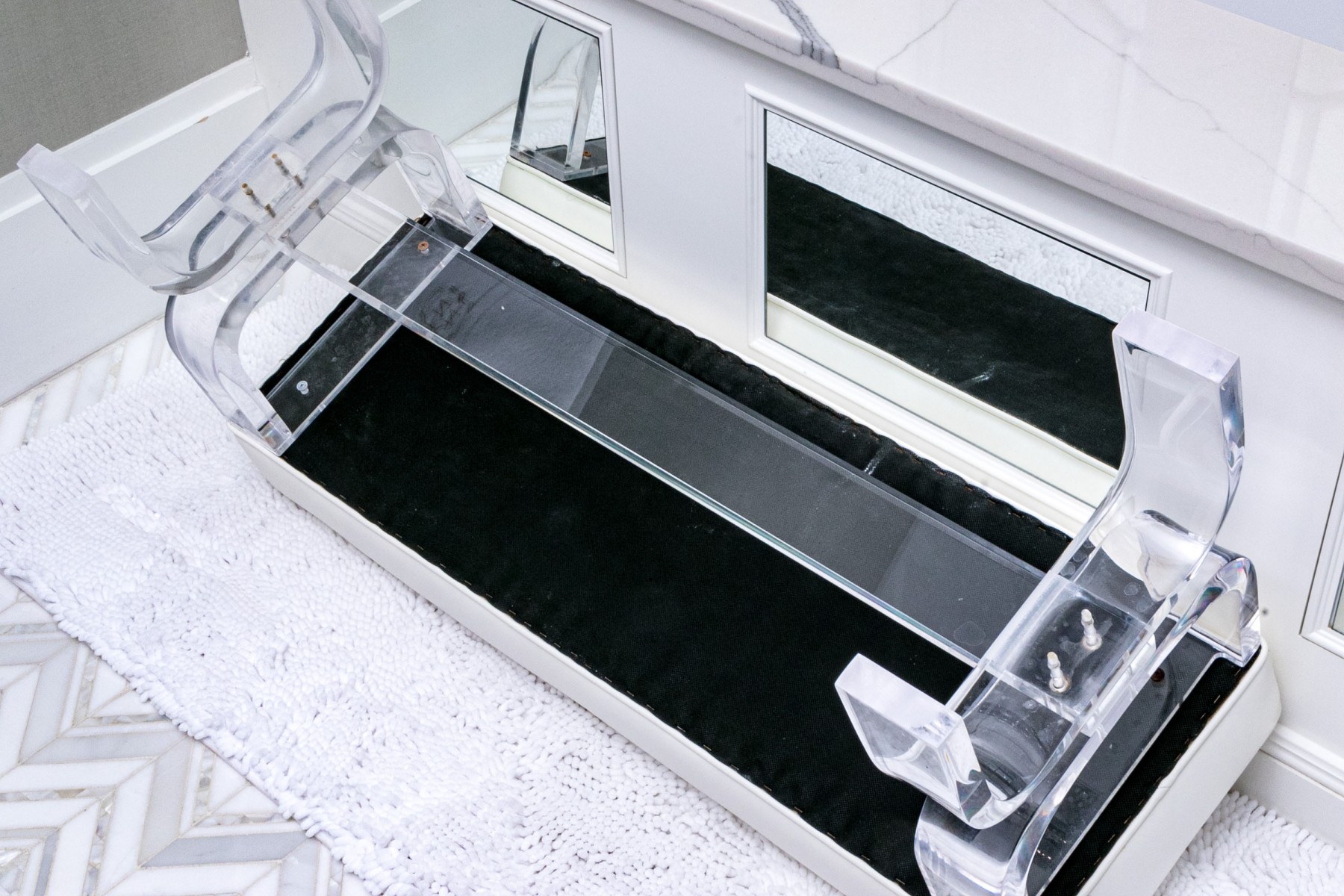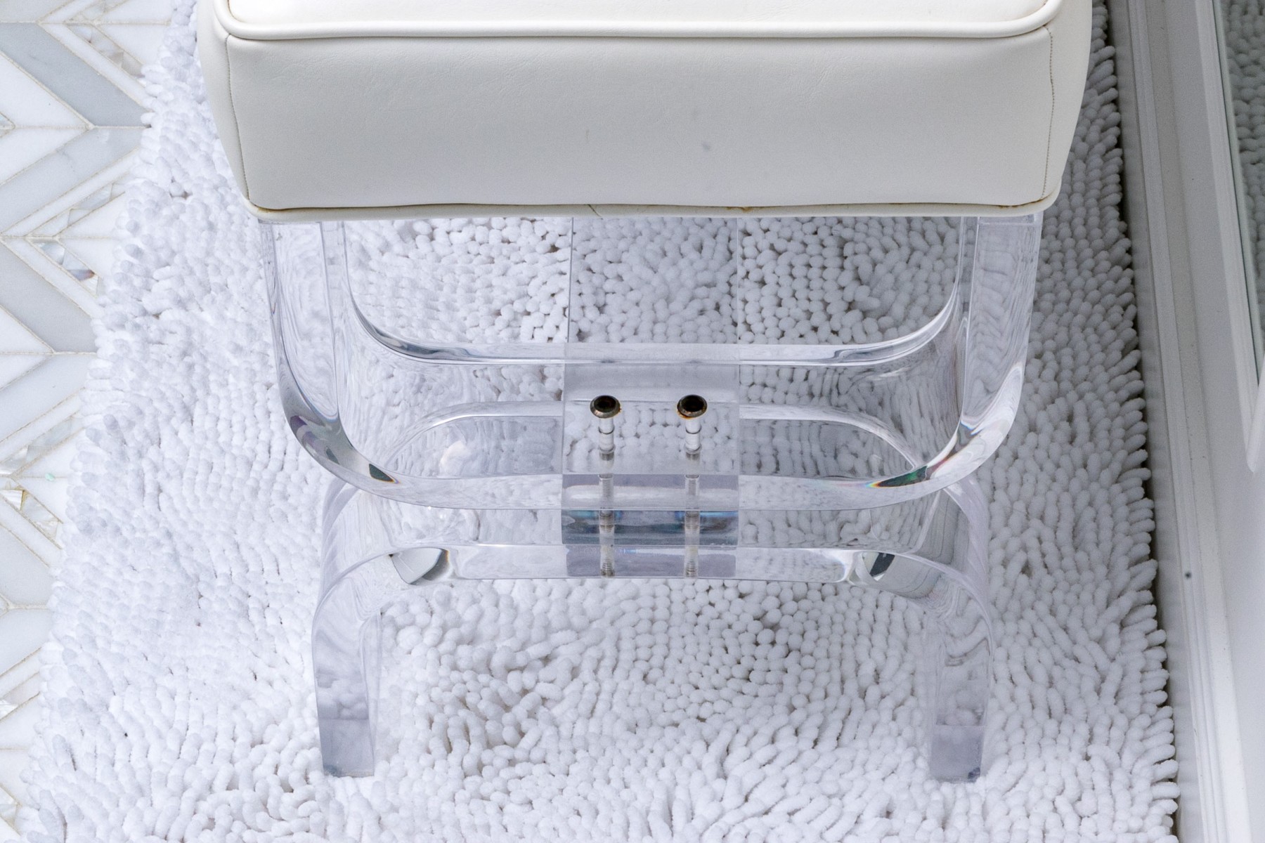 Elevate your master bath with the perfect blend of style and functionality. This bench is crafted from scuba-grade materials, ensuring durability and water resistance ideal for bathroom environments. Featuring a thick cushion for comfort, it rests elegantly on a lucite base with a center stretcher support, combining modern aesthetics with practical design. Perfect for adding a touch of luxury and functionality to your space.