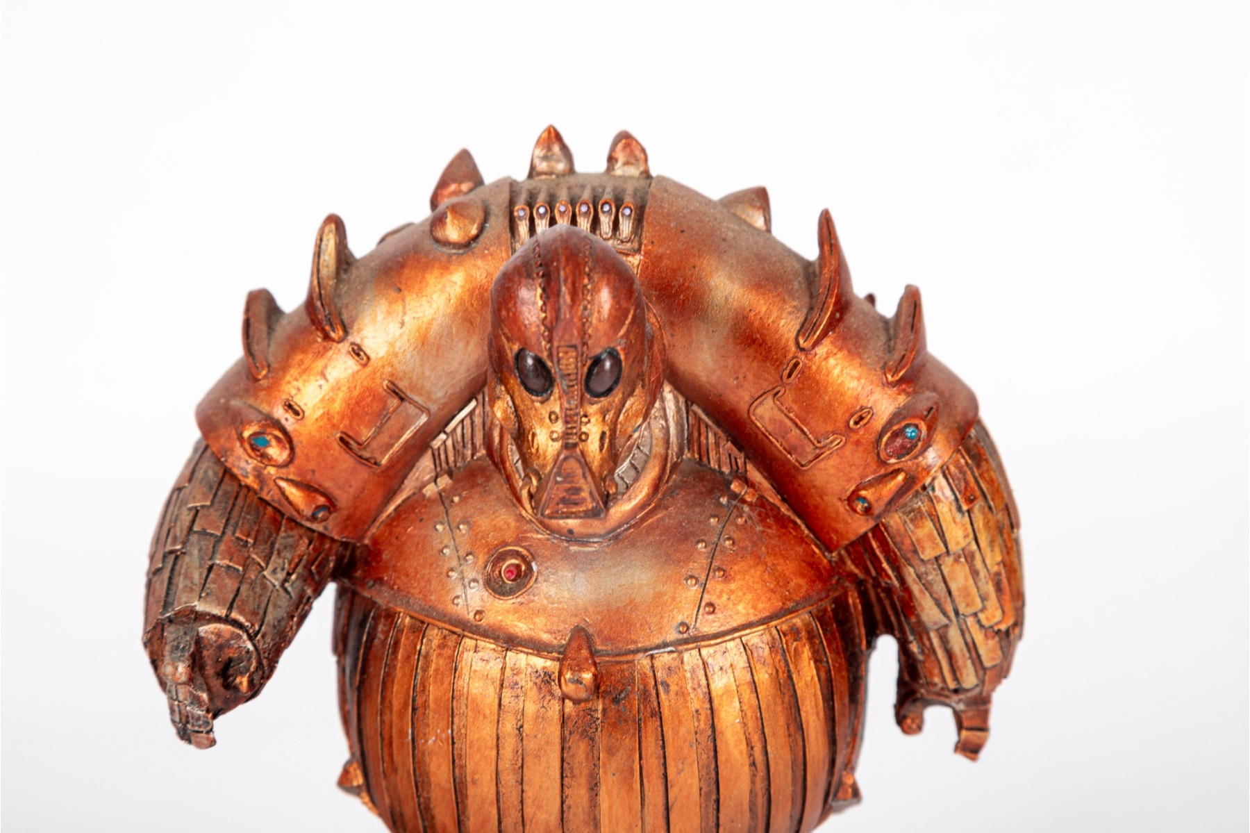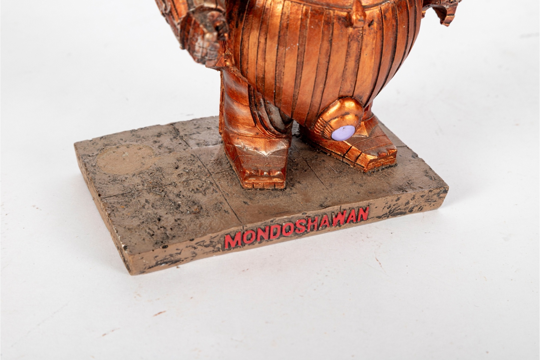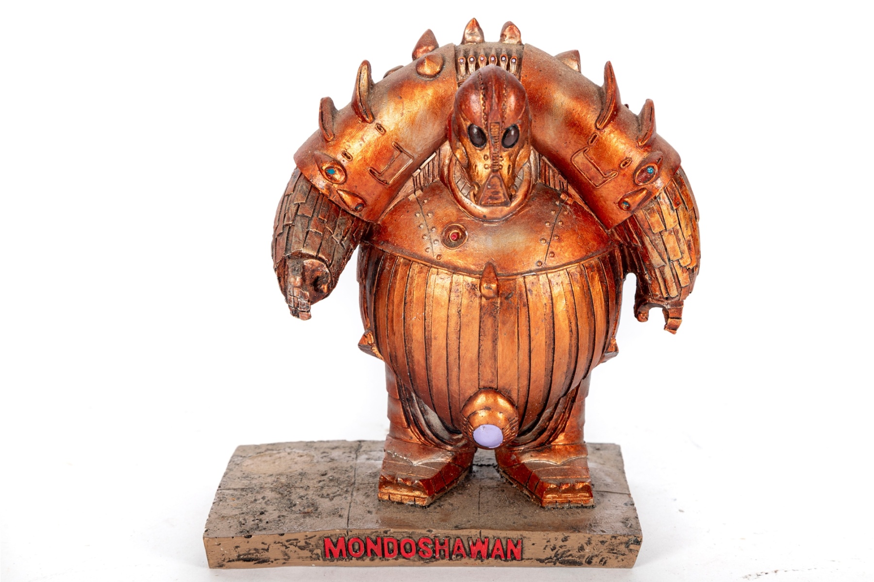 A detailed resin sculpture inspired by the Mondoshawan, the ancient alien species from Luc Besson’s 1997 sci-fi classic The Fifth Element. Cast in resin and finished in a metallic copper-gold tone with aged patina detailing, this statue captures the distinctive armored design of the Mondoshawan race—guardians of the Fifth Element. The figure stands on a textured display base inscribed “MONDOSHAWAN” in bold red lettering. Highly detailed with intricate surface etching, rivets, and spiked armor accents characteristic of the film’s aesthetic.
