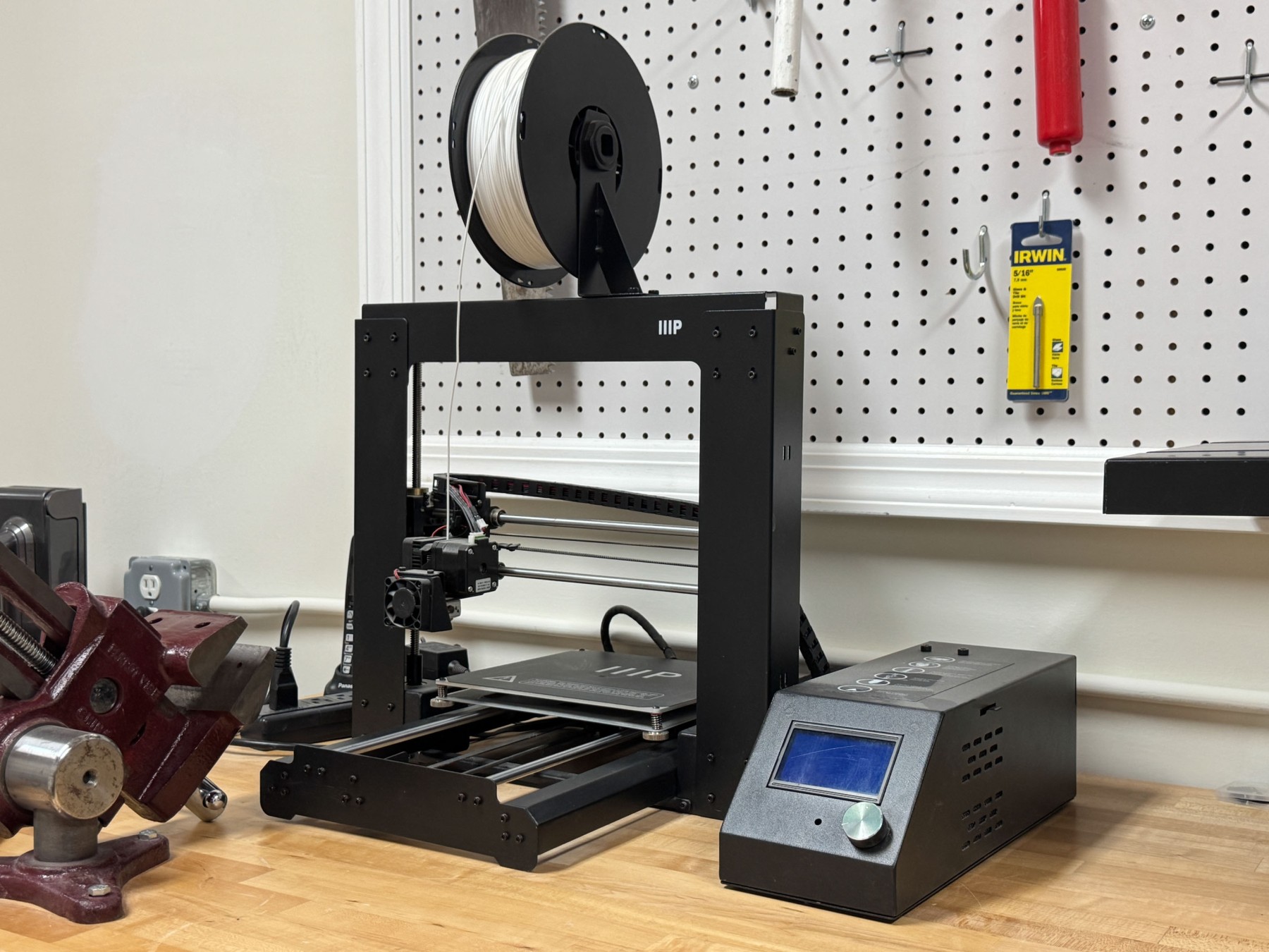 A wonderful Monoprice Maker Select 3D printer V2 model 13860 with a spool of white filament.
