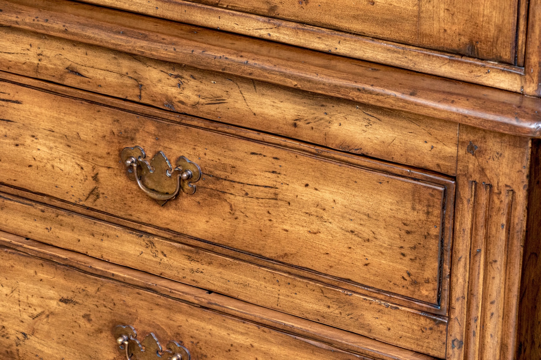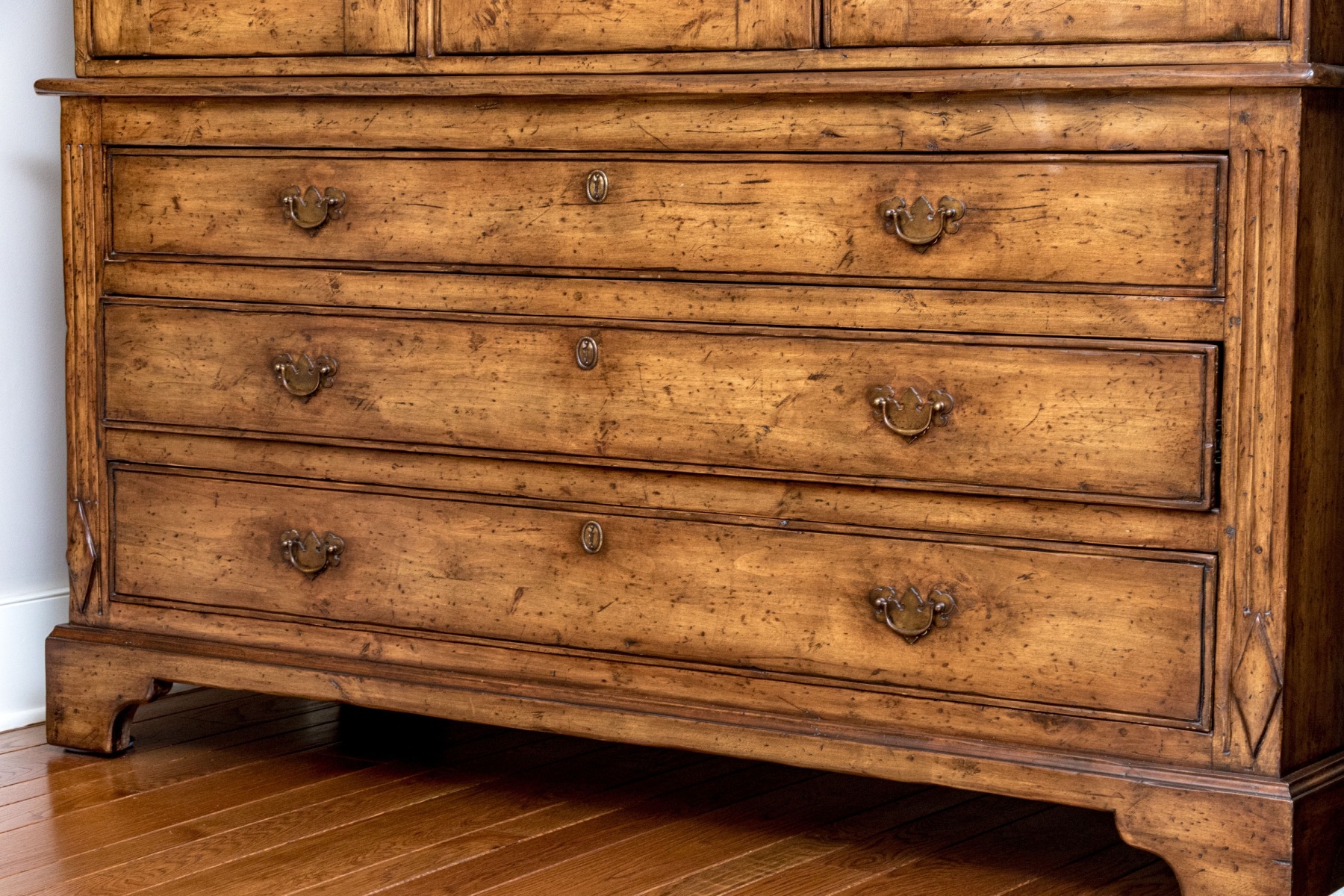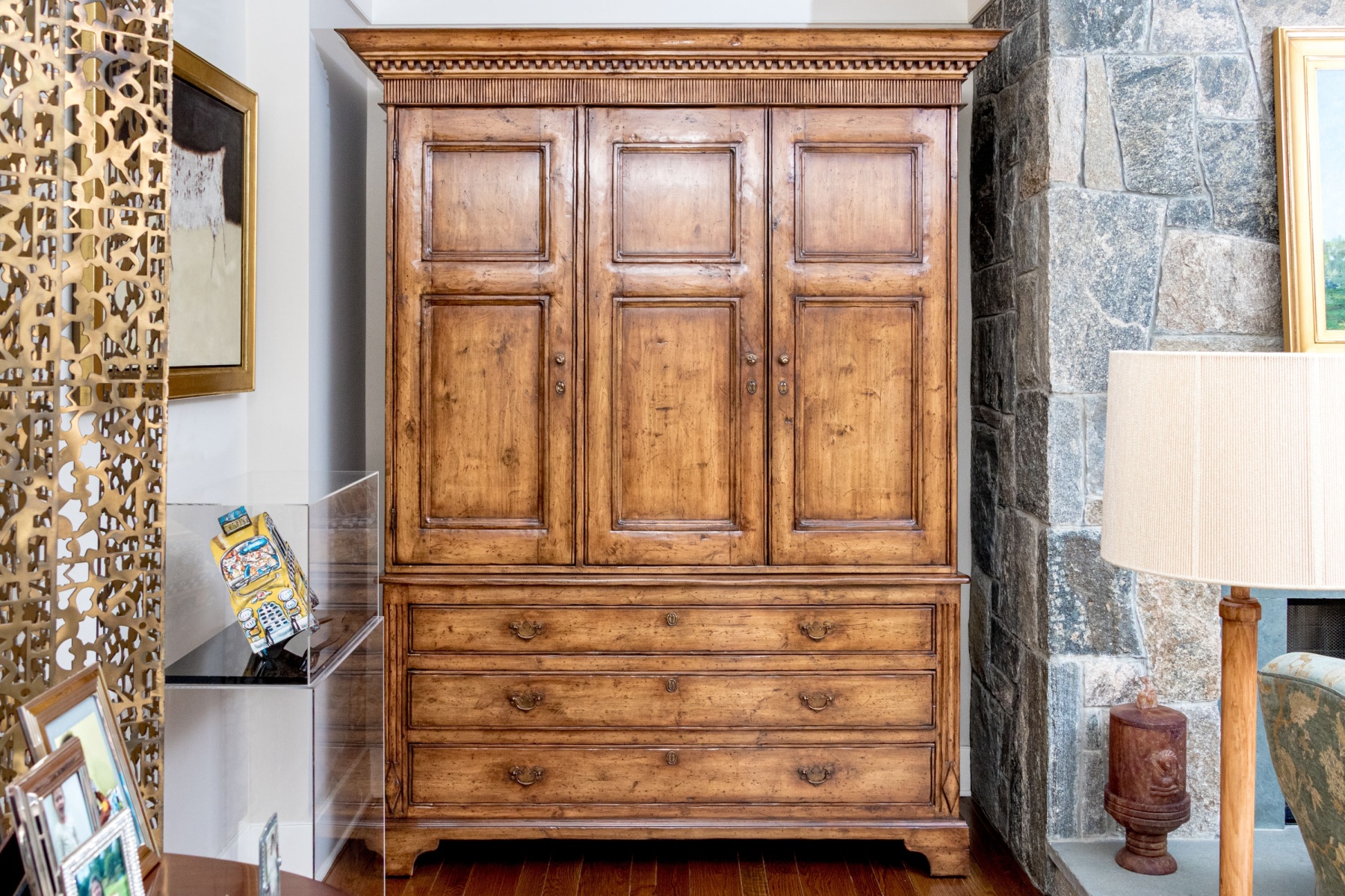 A high quality entertainment cabinet standing at 8'4" for an impactful and elegant presence. The cabinet is designed with great Georgian influence, showcasing a beveled straight crown over a dentil trim heralding three cabinet doors. The two doors to the right opens to a media cabinet, while the door to the left opens to wood shelves for storage. Below, three long drawers provide additional storage space, each adorned with twin brass bail handles on batwing plaques. Raised on bracket feet.