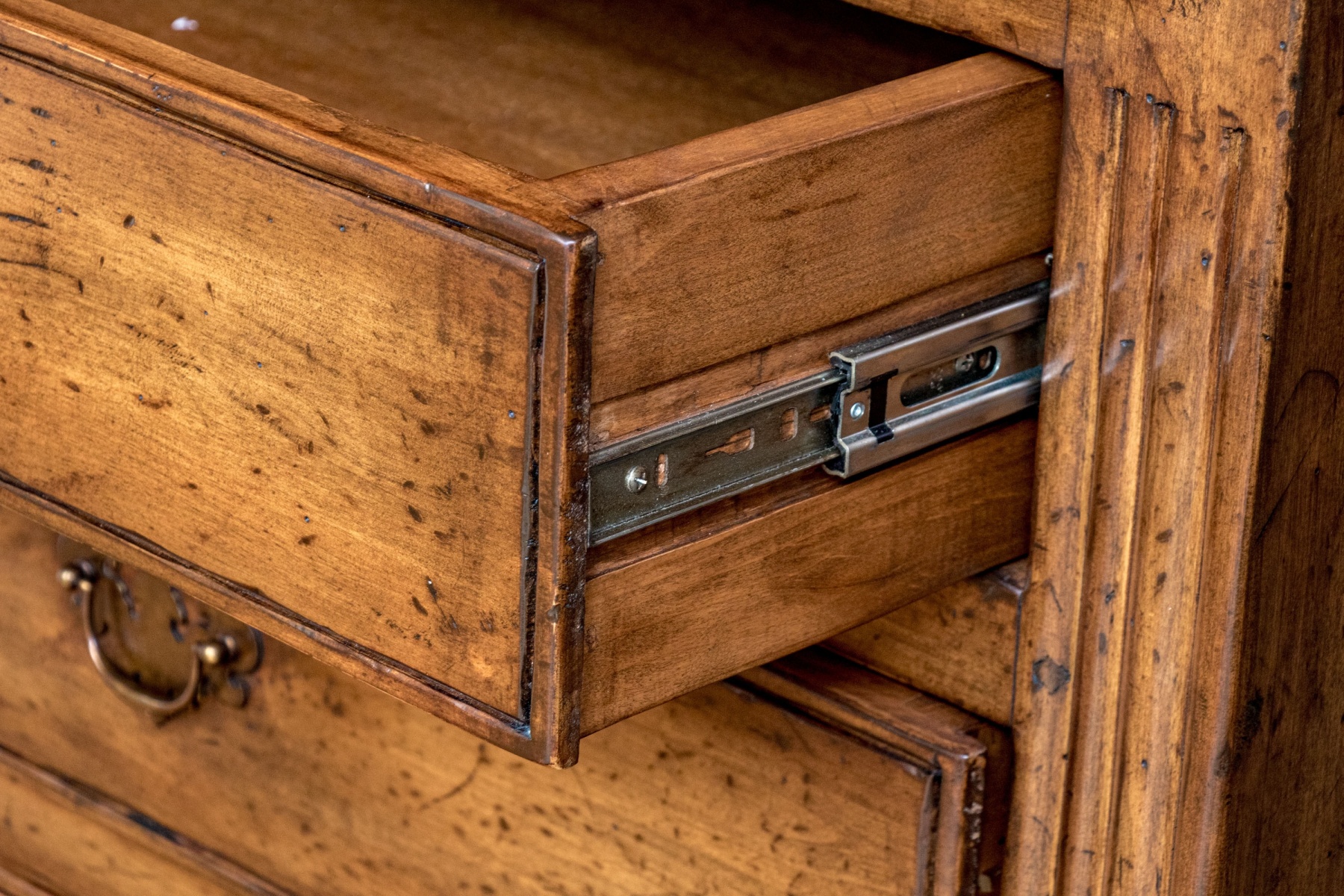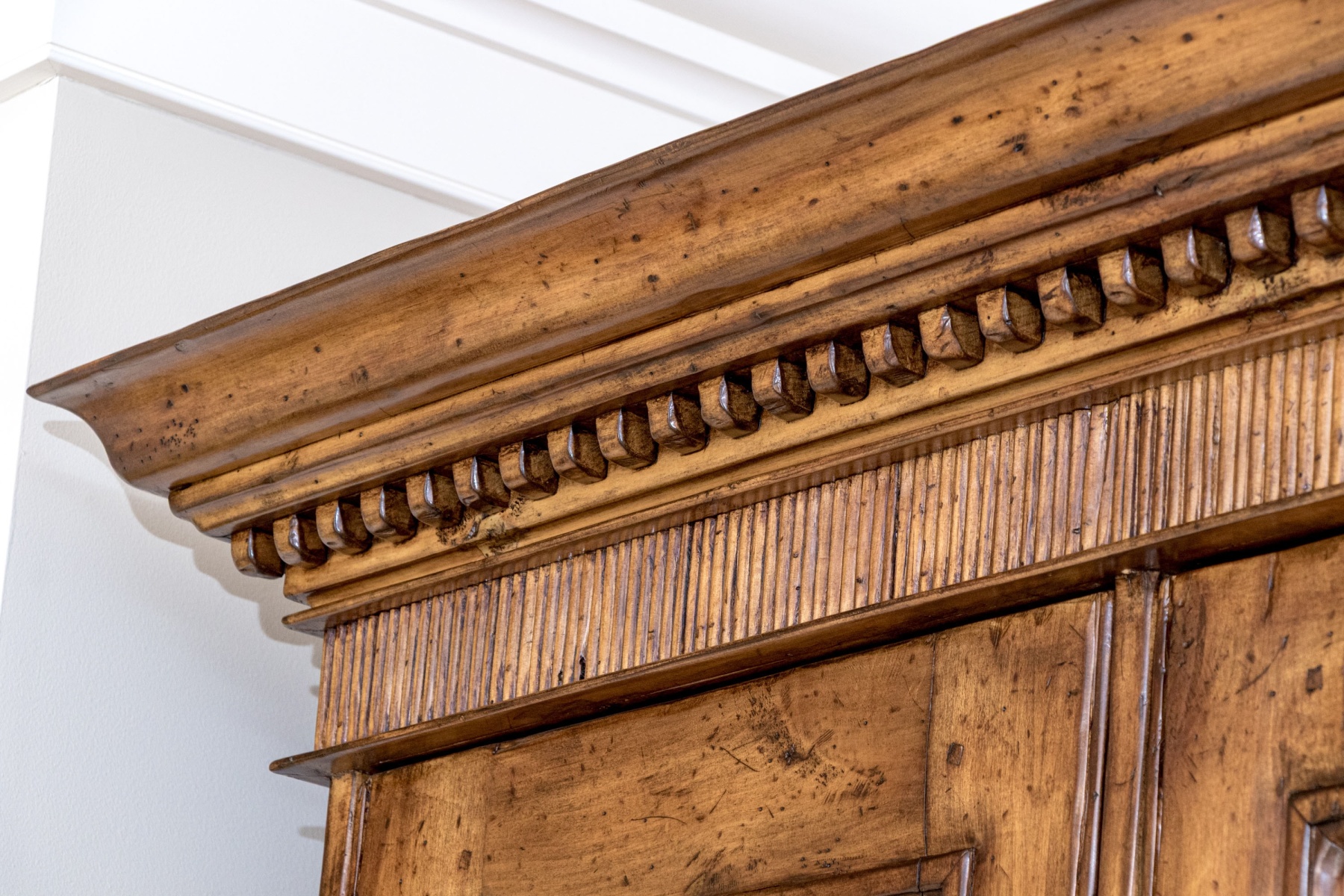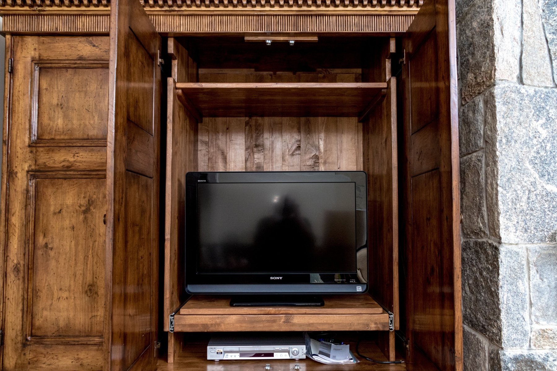 A high quality entertainment cabinet standing at 8'4" for an impactful and elegant presence. The cabinet is designed with great Georgian influence, showcasing a beveled straight crown over a dentil trim heralding three cabinet doors. The two doors to the right opens to a media cabinet, while the door to the left opens to wood shelves for storage. Below, three long drawers provide additional storage space, each adorned with twin brass bail handles on batwing plaques. Raised on bracket feet.