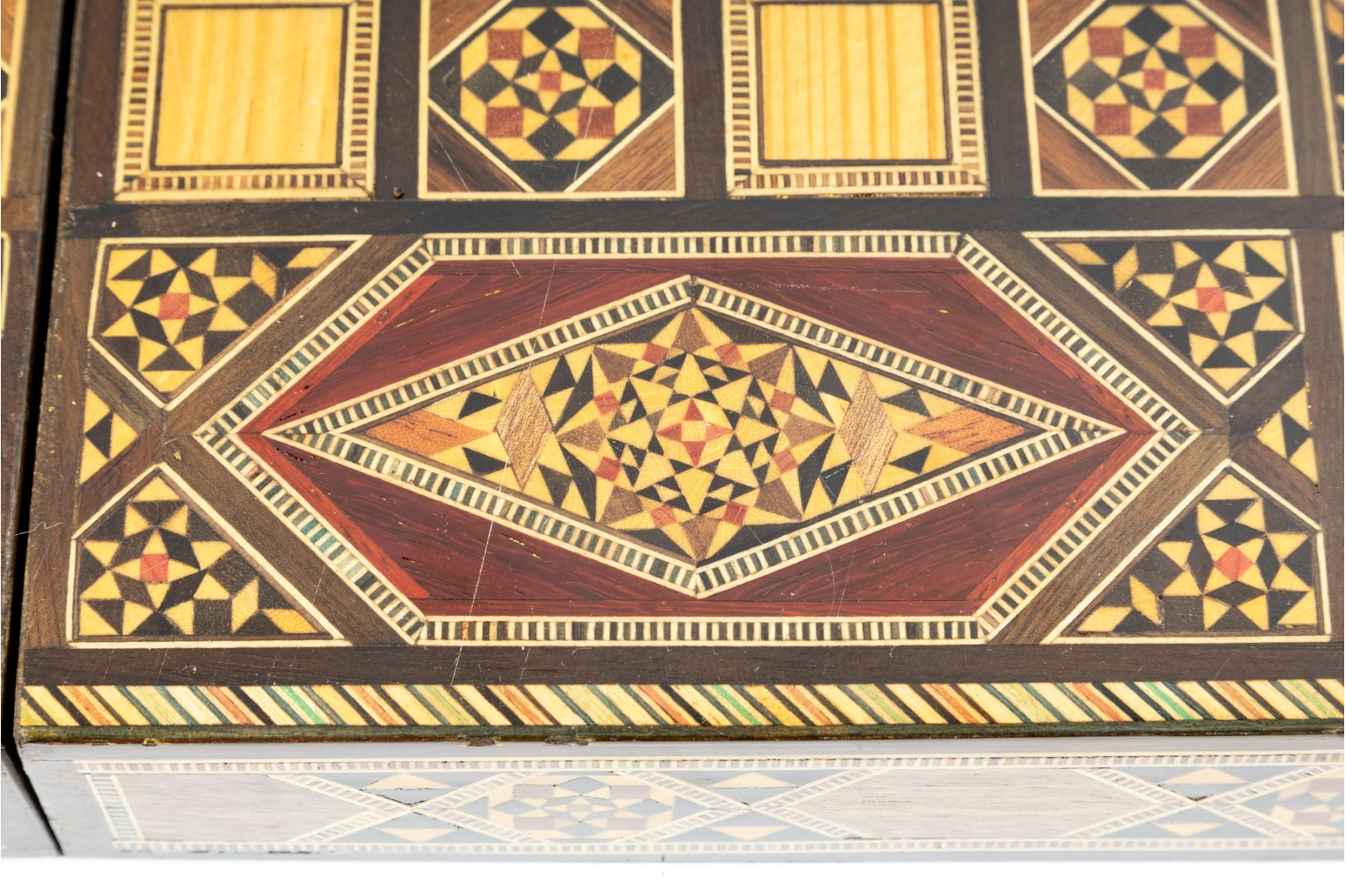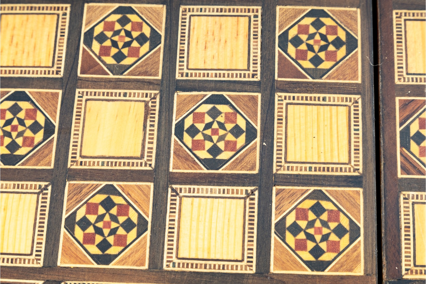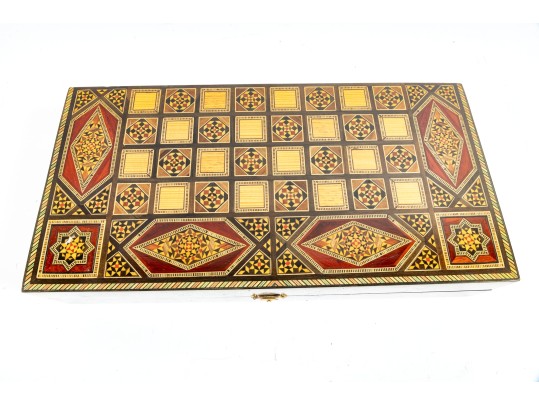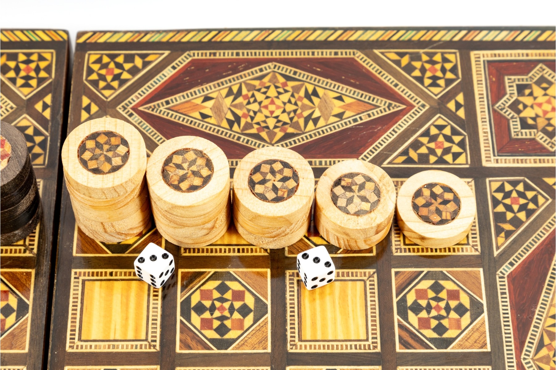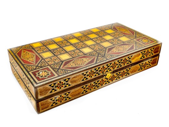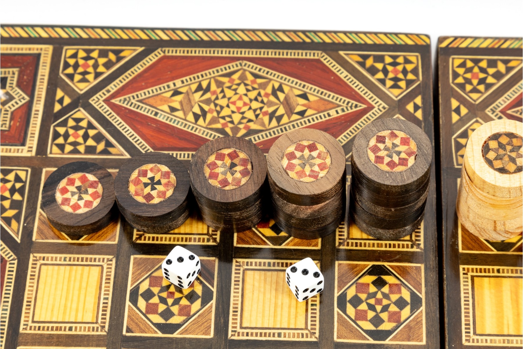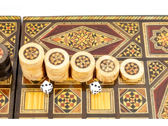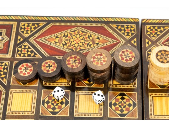 Inspired by traditional Moorish designs, this backgammon box features intricate inlay work with an array of exotic woods, creating mesmerizing geometric patterns and motifs which extends to the game pieces themselves. Dice included.