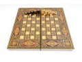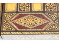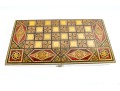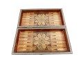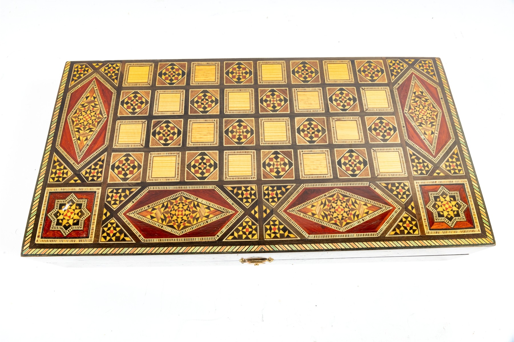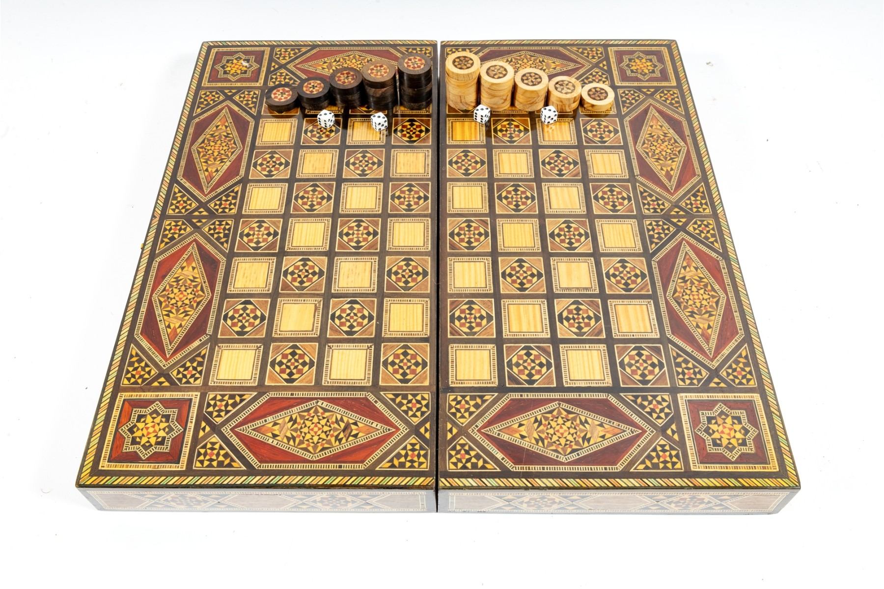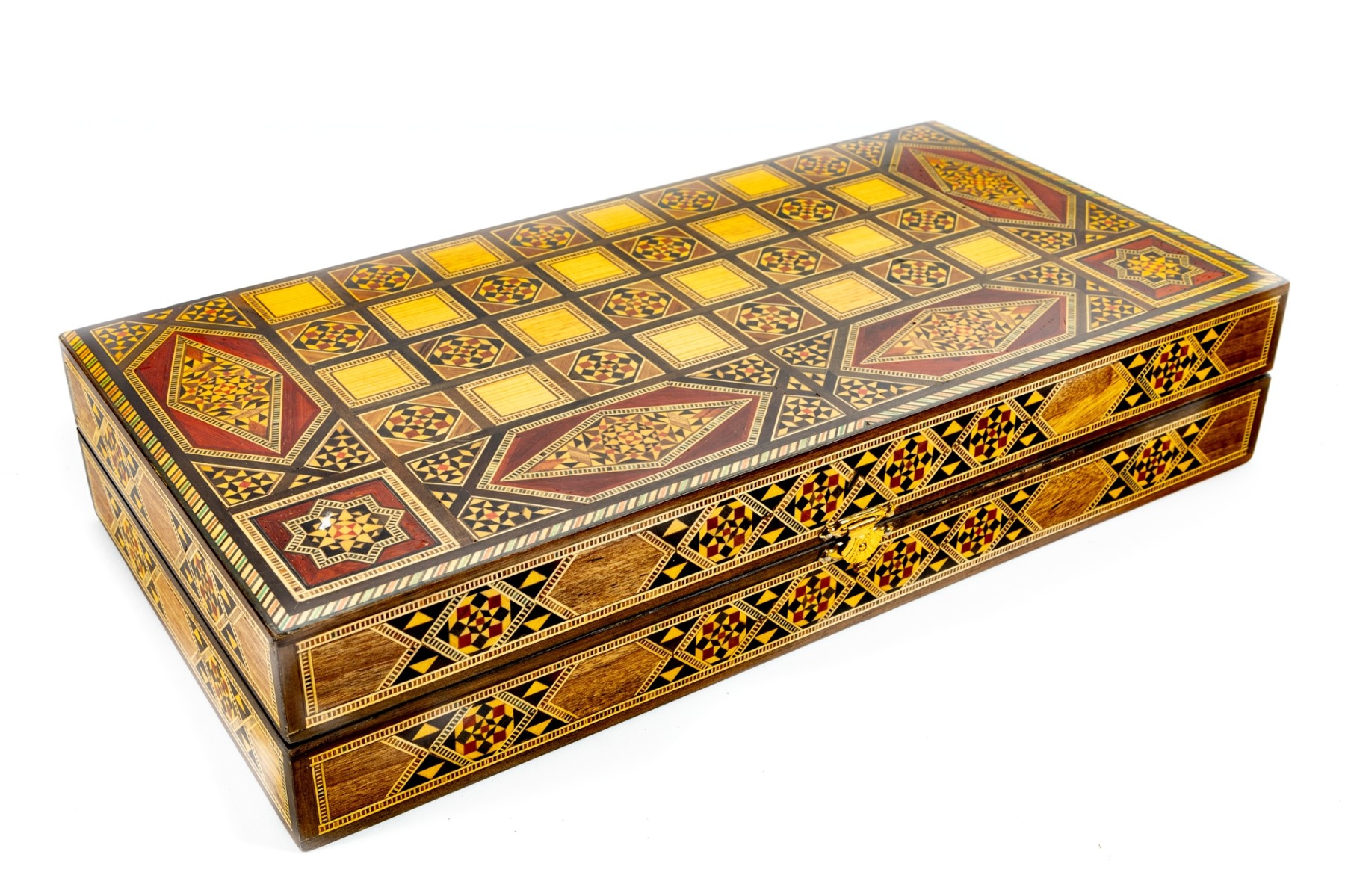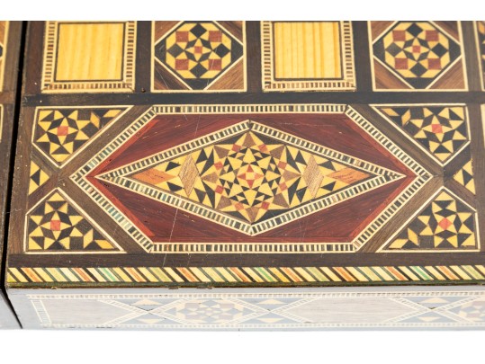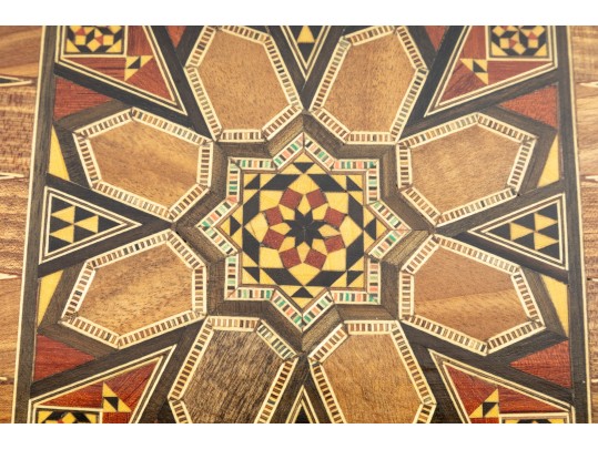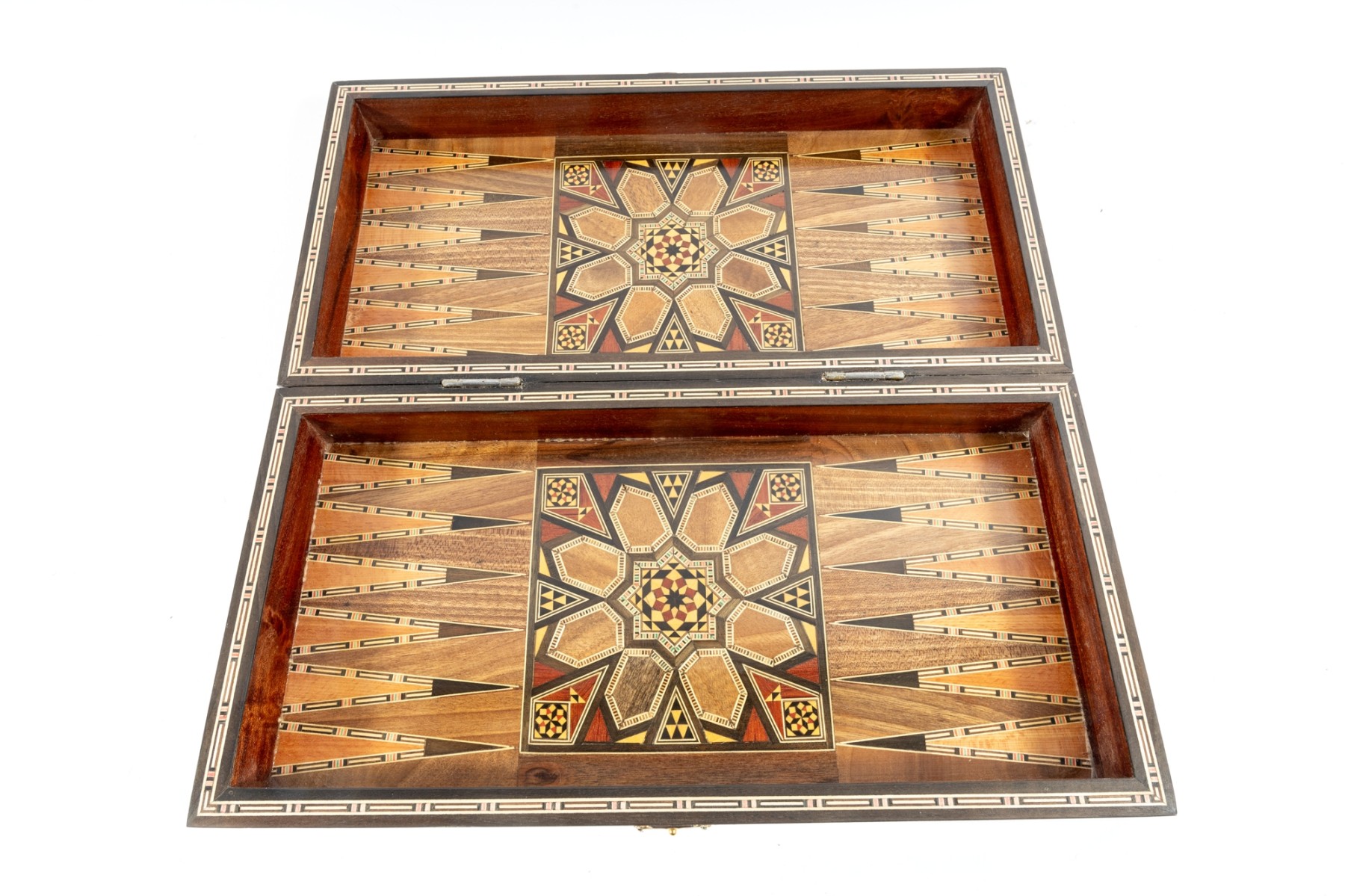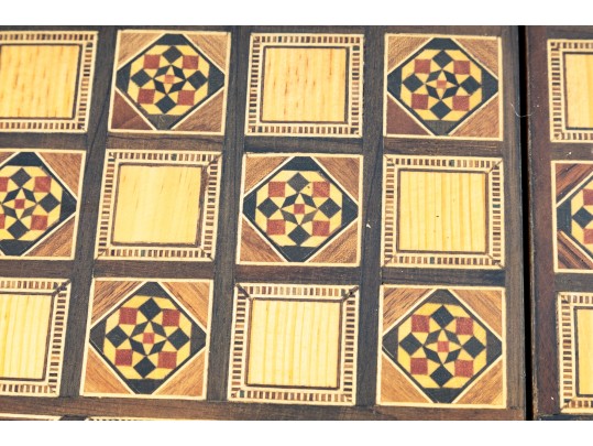 Inspired by traditional Moorish designs, this backgammon box features intricate inlay work with an array of exotic woods, creating mesmerizing geometric patterns and motifs which extends to the game pieces themselves. Dice included.