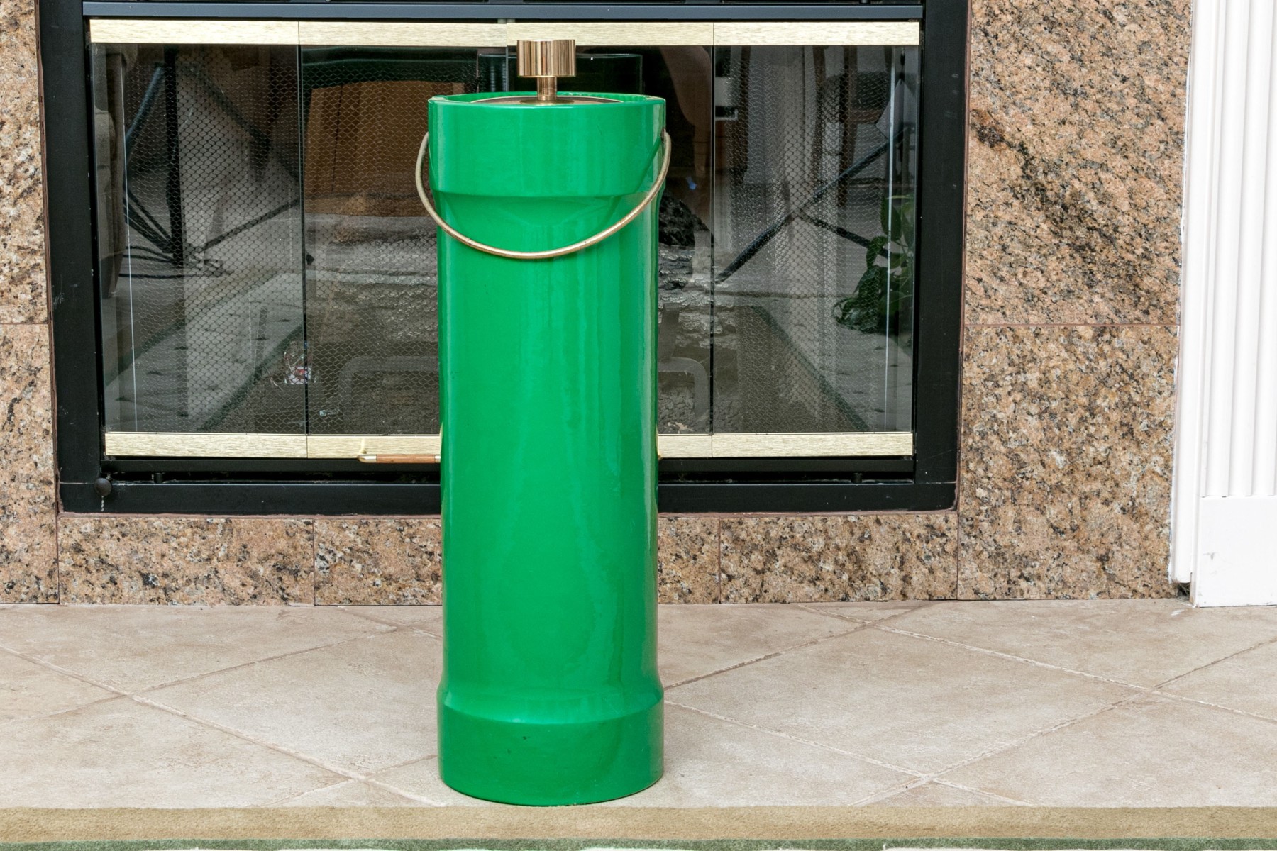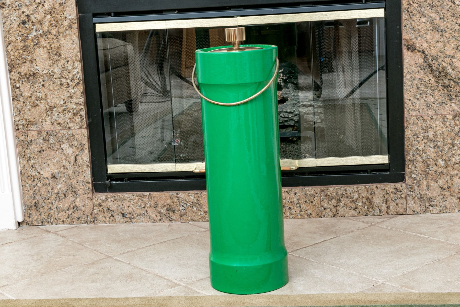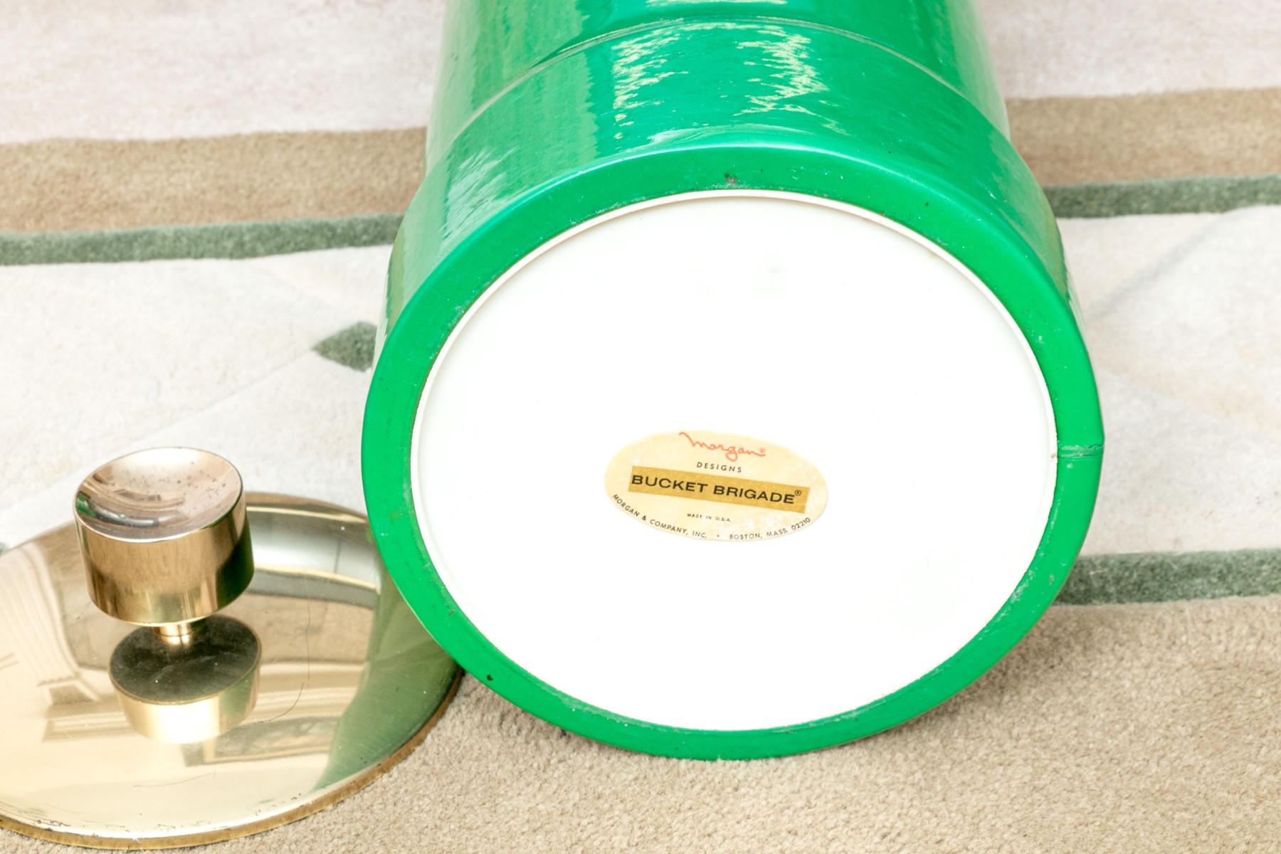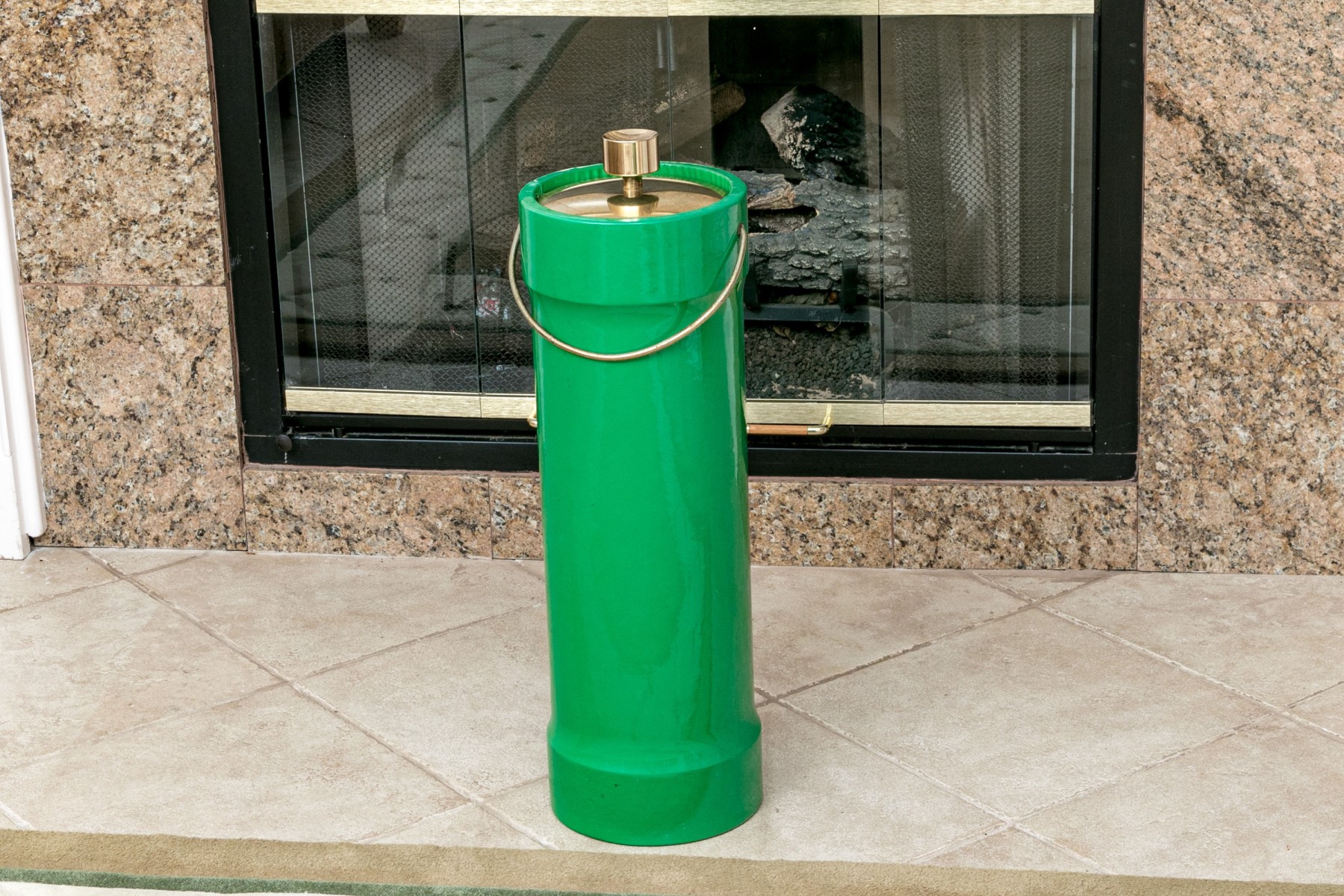 A fabulous, vintage Morgan Designs Bucket Brigade wine cooler in tall, cylindrical form with a striking, vibrant green exterior and a white interior. Topped with a brasstone handle and lid, lending a stylish mid-century modern and Hollywood Regency charm.