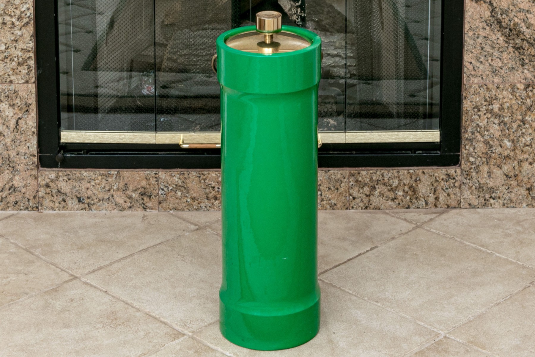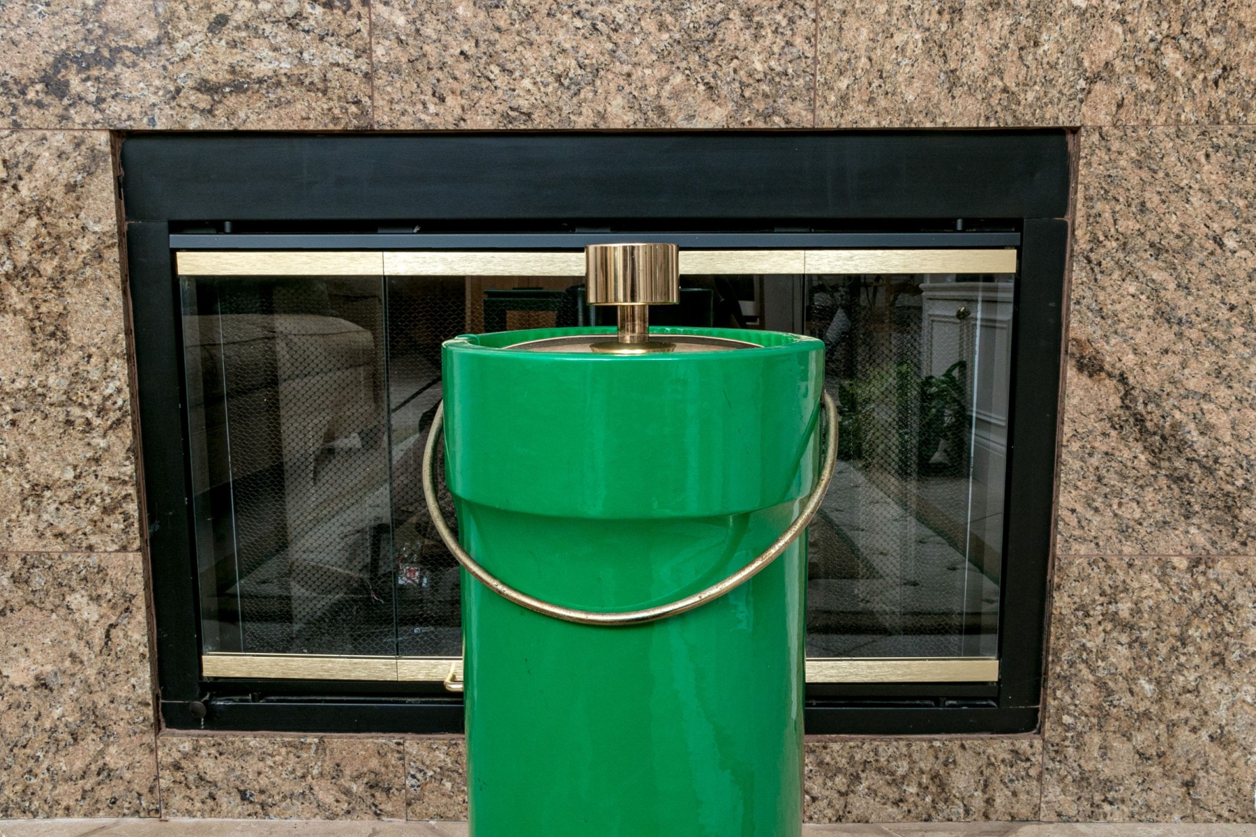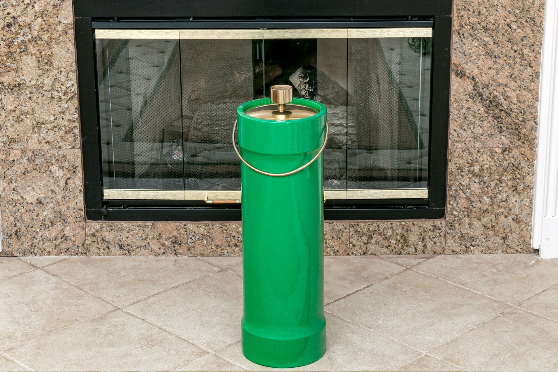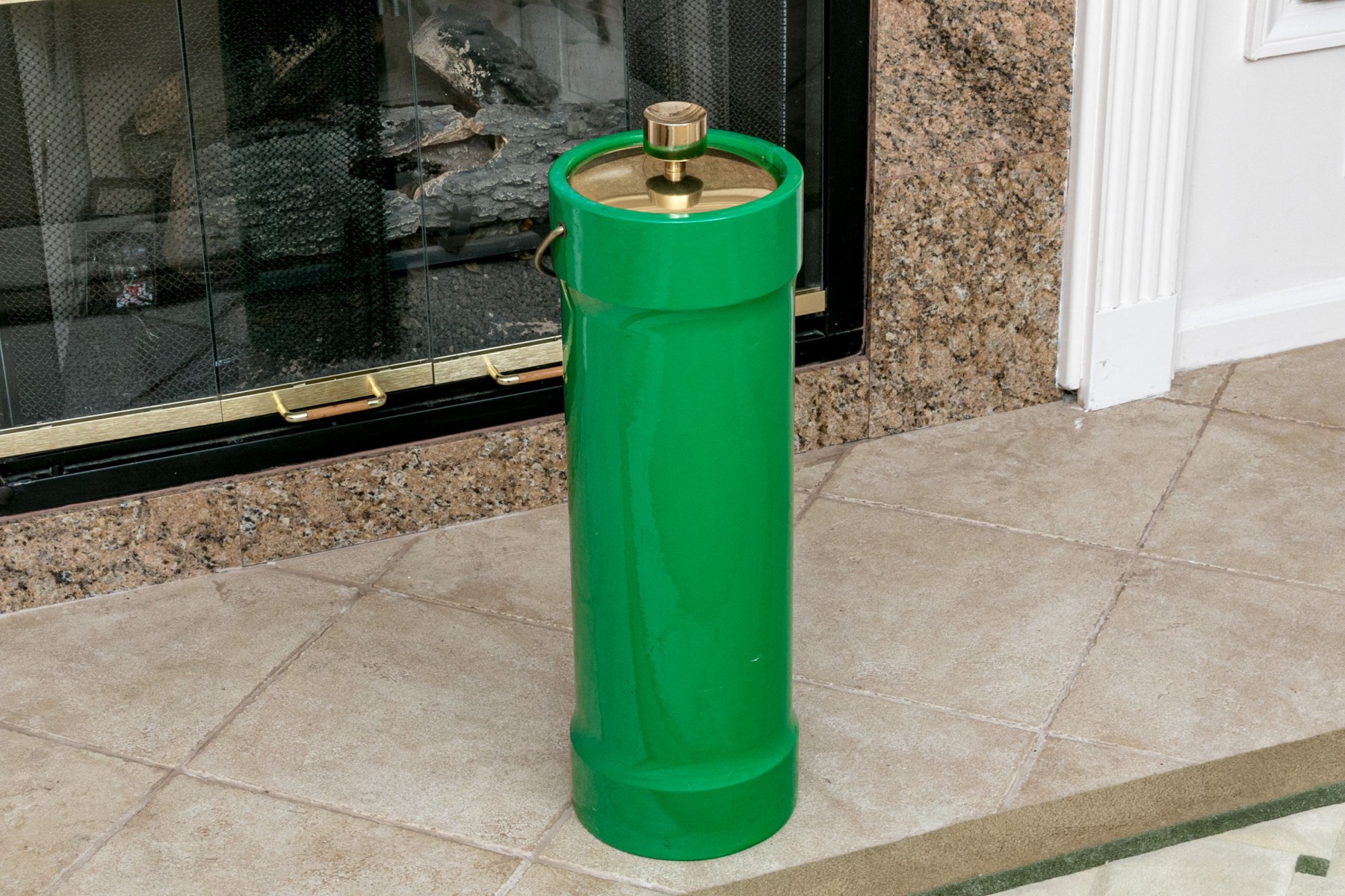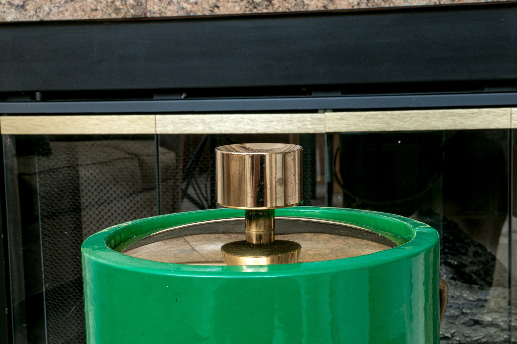 A fabulous, vintage Morgan Designs Bucket Brigade wine cooler in tall, cylindrical form with a striking, vibrant green exterior and a white interior. Topped with a brasstone handle and lid, lending a stylish mid-century modern and Hollywood Regency charm.