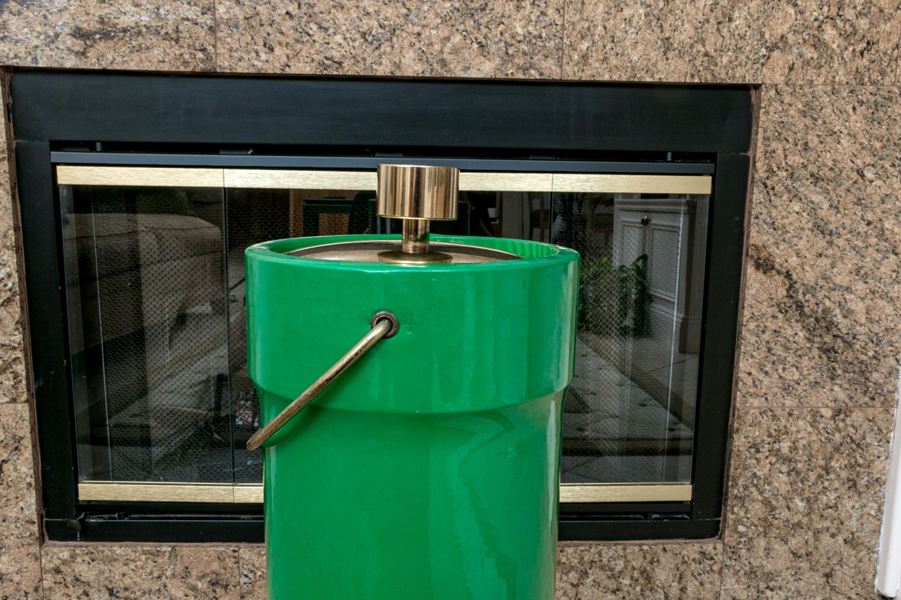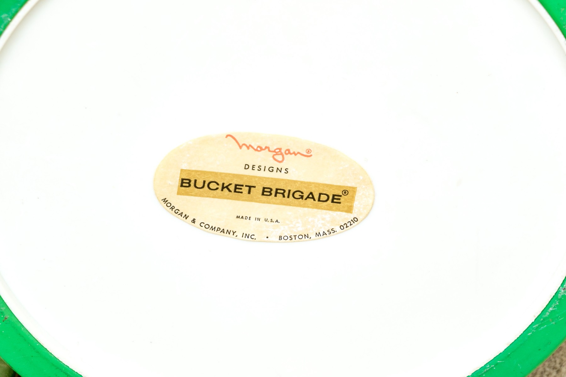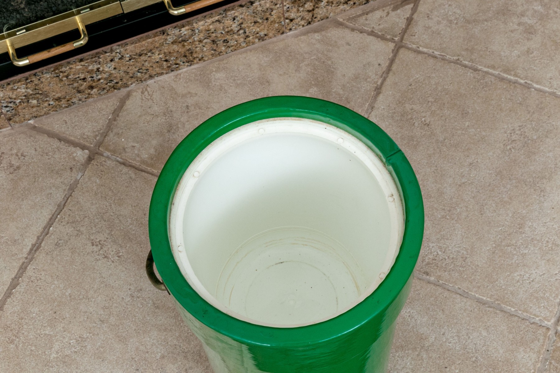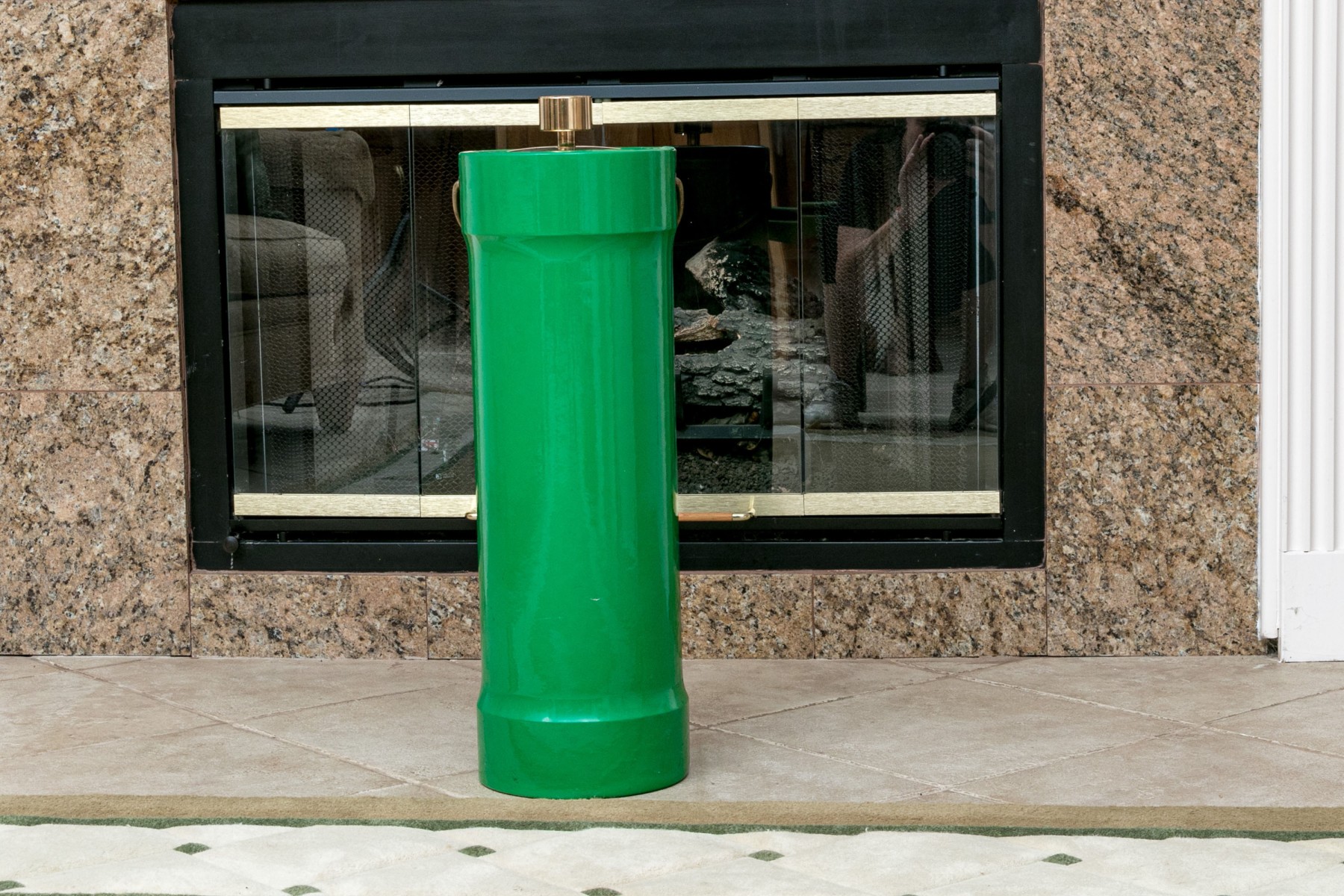 A fabulous, vintage Morgan Designs Bucket Brigade wine cooler in tall, cylindrical form with a striking, vibrant green exterior and a white interior. Topped with a brasstone handle and lid, lending a stylish mid-century modern and Hollywood Regency charm.