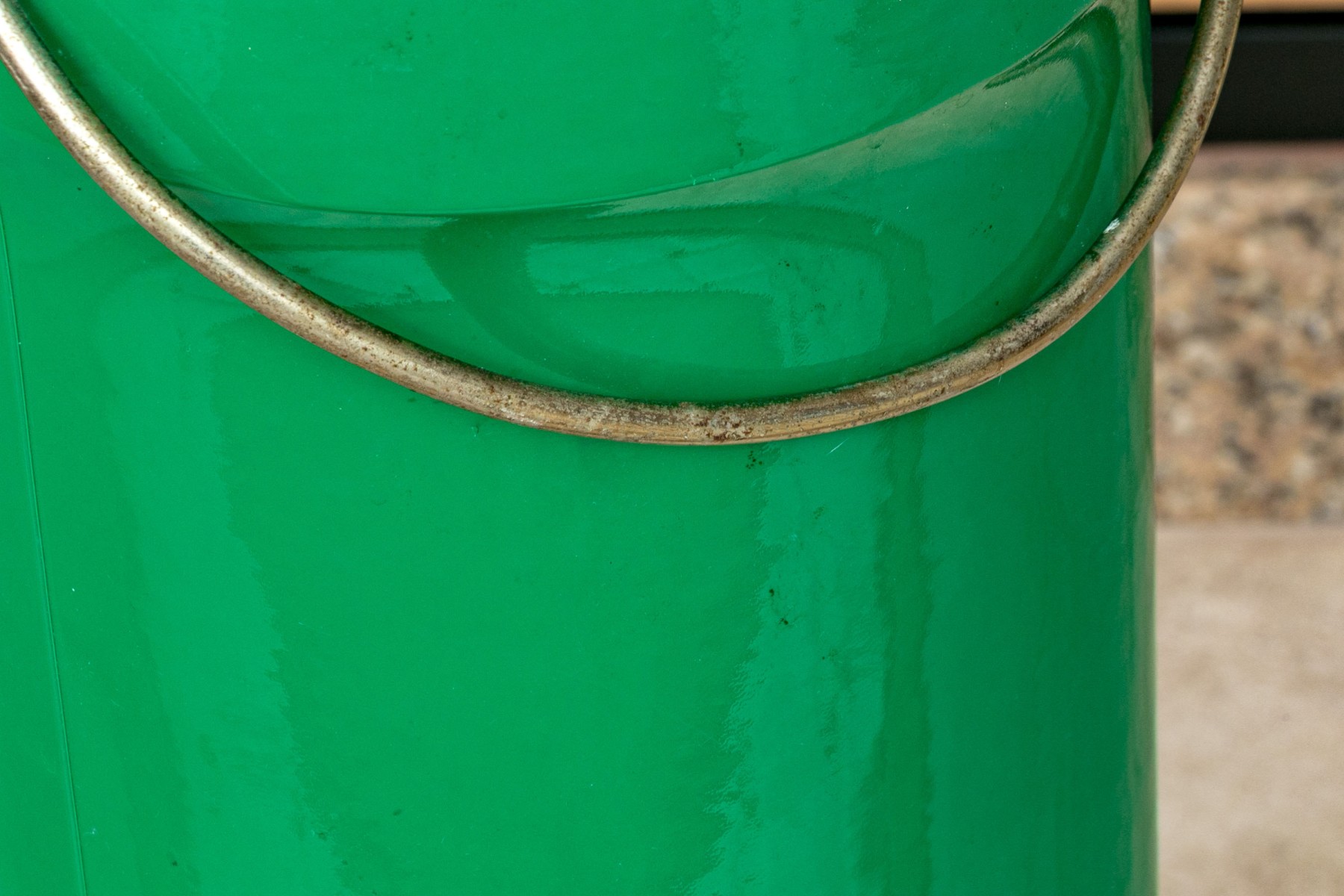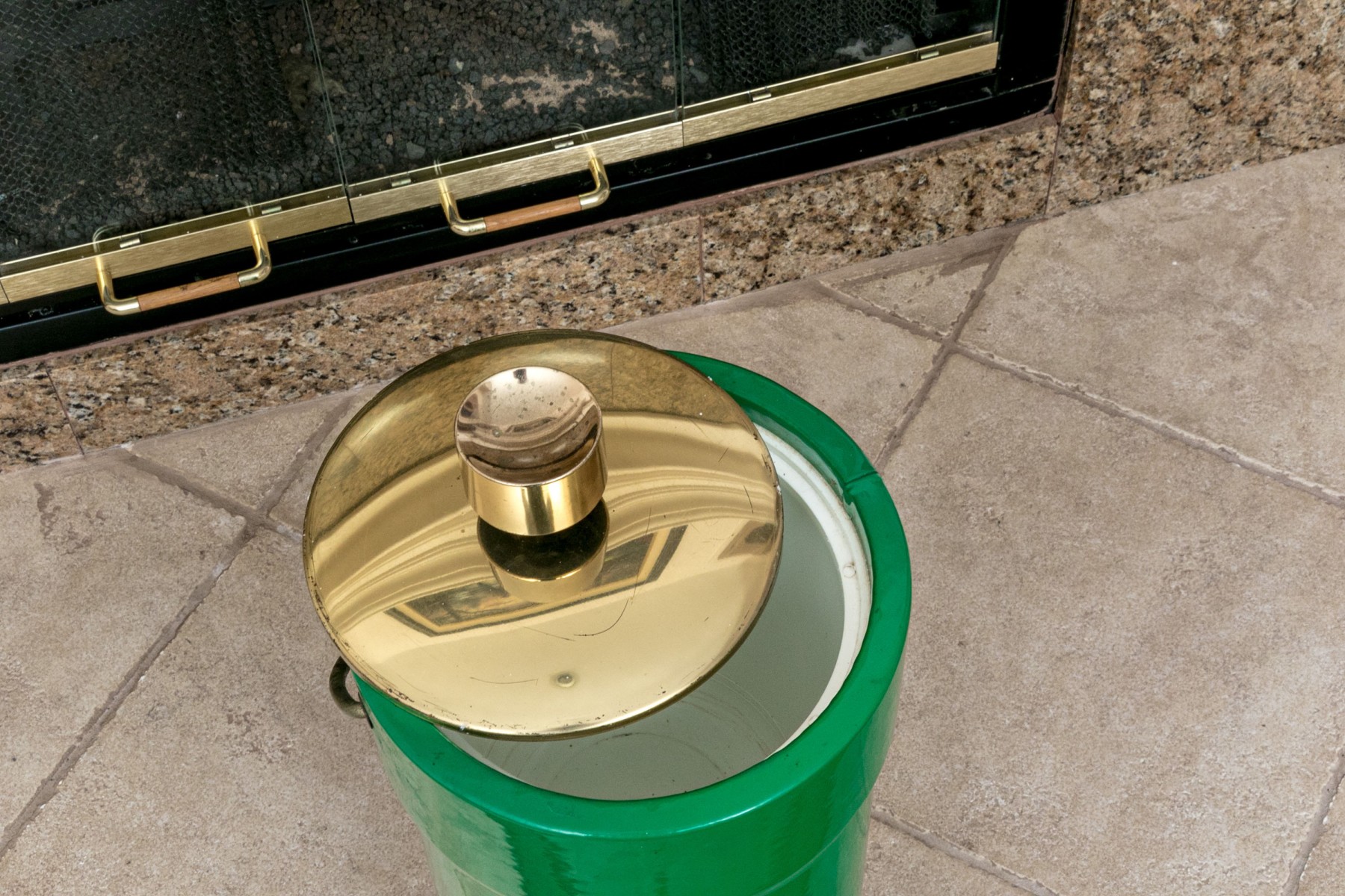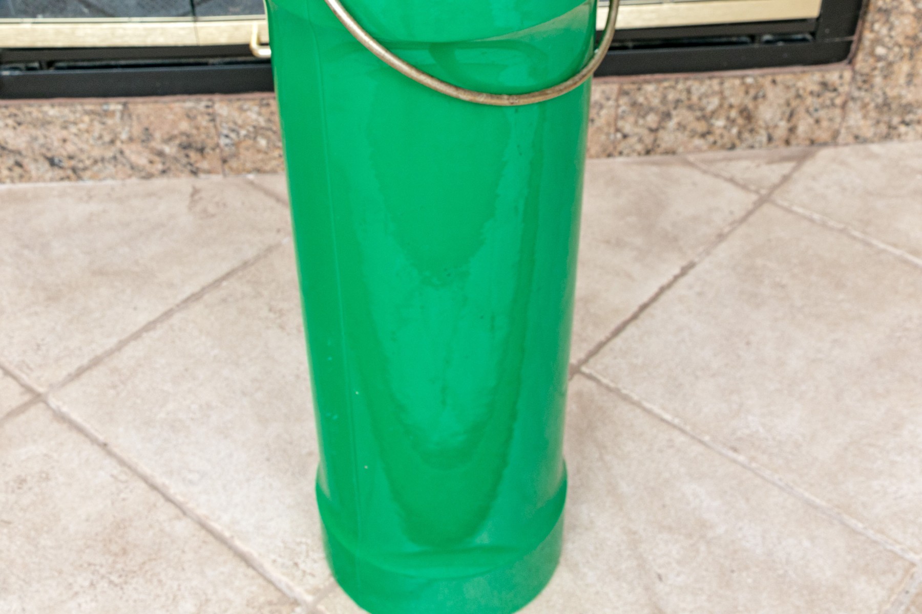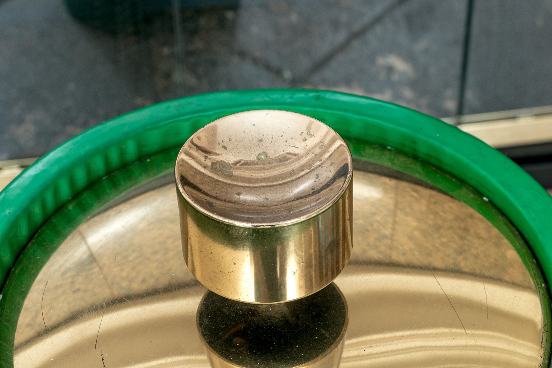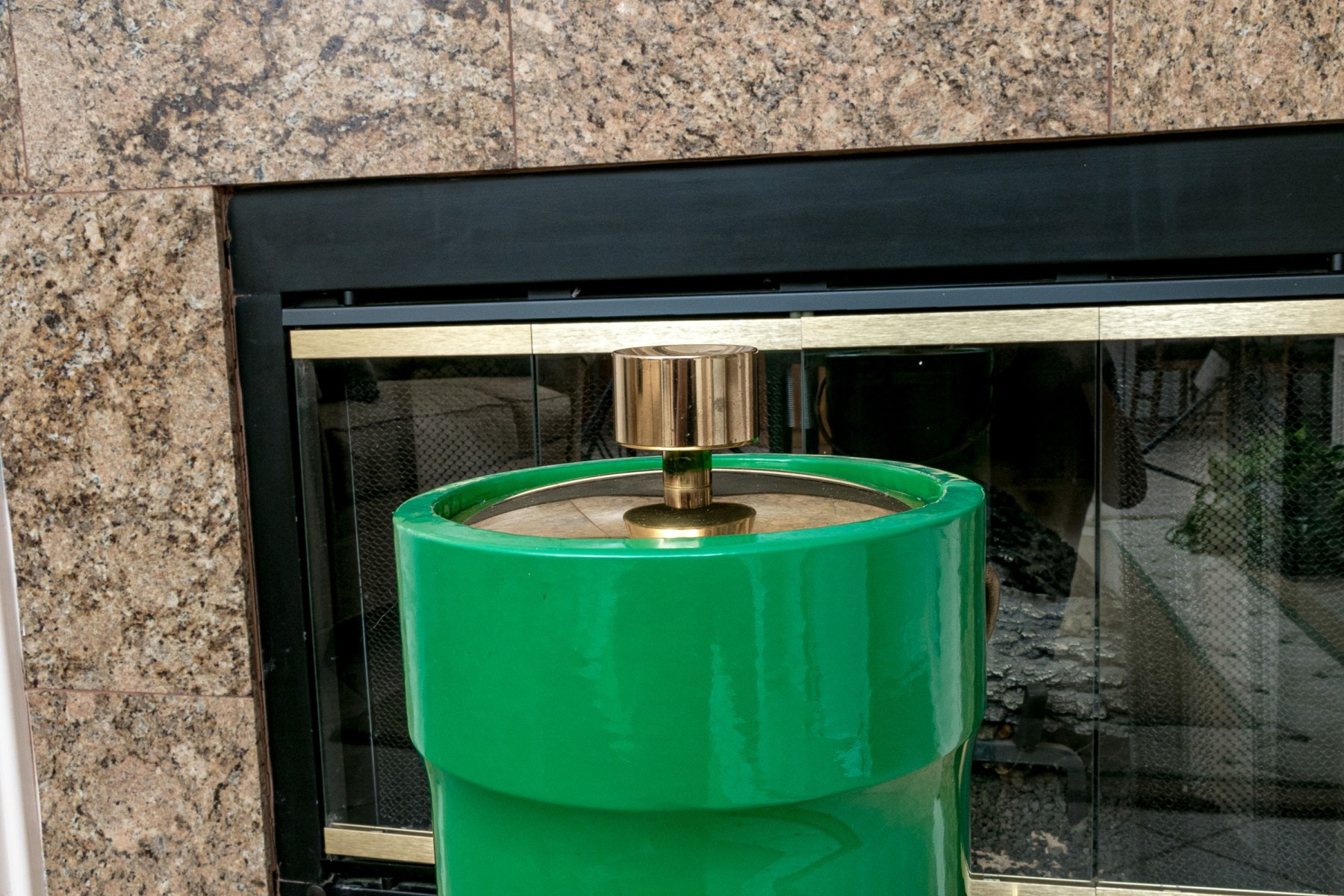 A fabulous, vintage Morgan Designs Bucket Brigade wine cooler in tall, cylindrical form with a striking, vibrant green exterior and a white interior. Topped with a brasstone handle and lid, lending a stylish mid-century modern and Hollywood Regency charm.