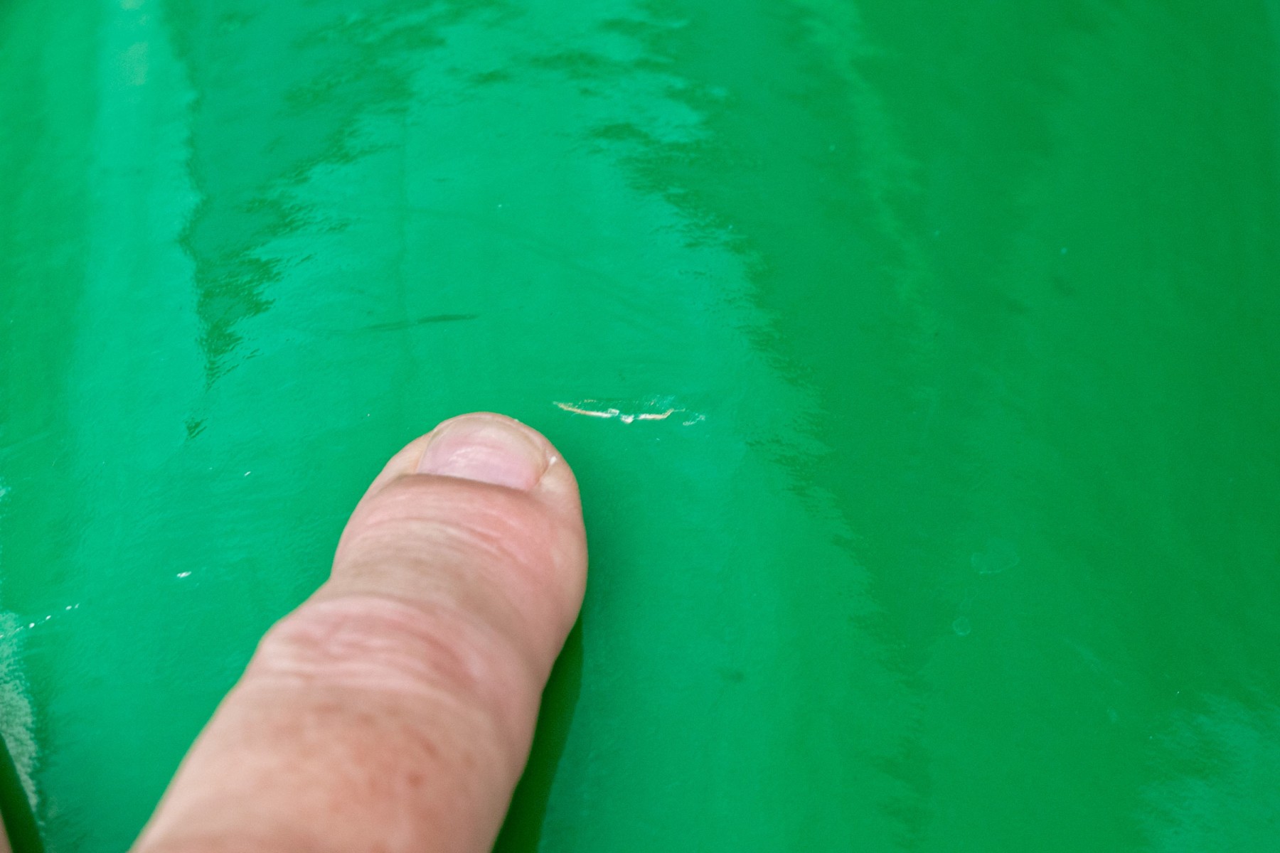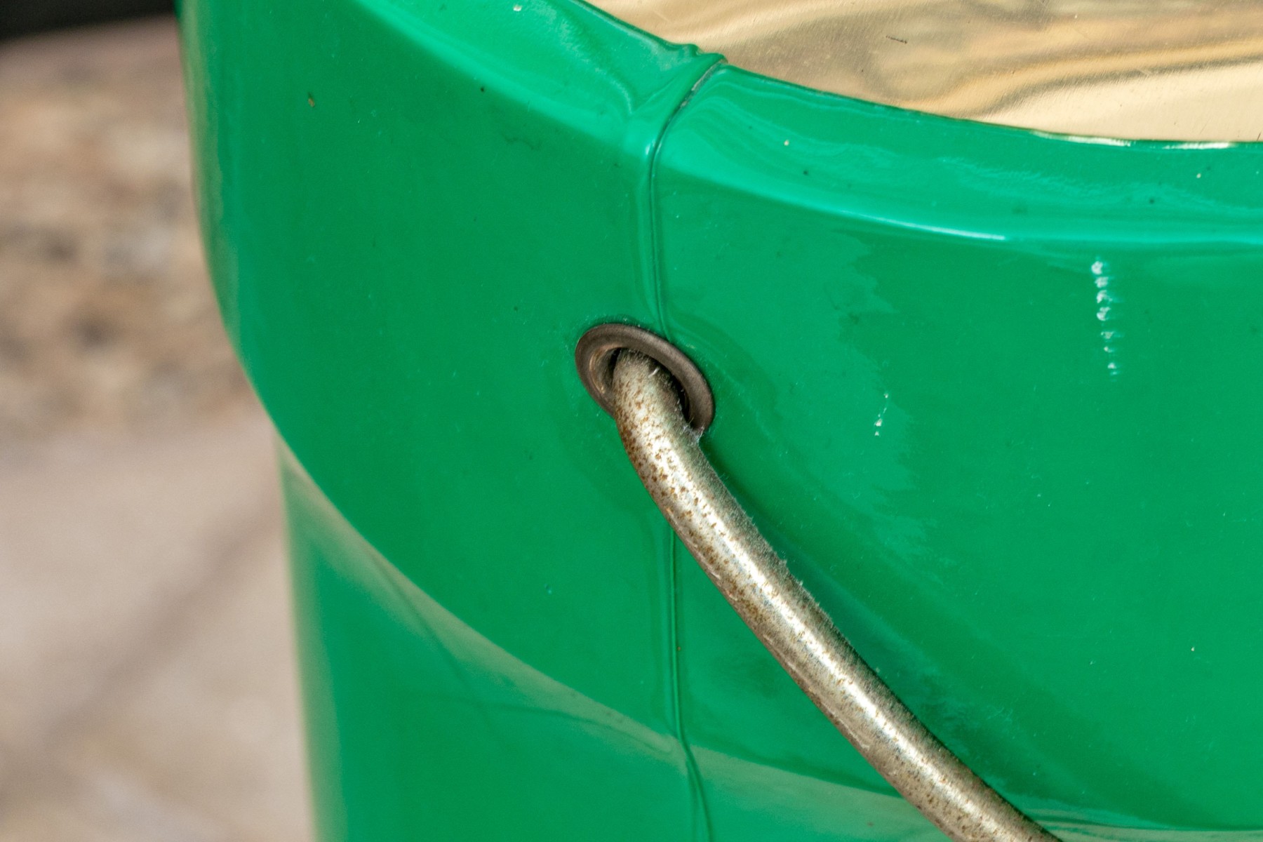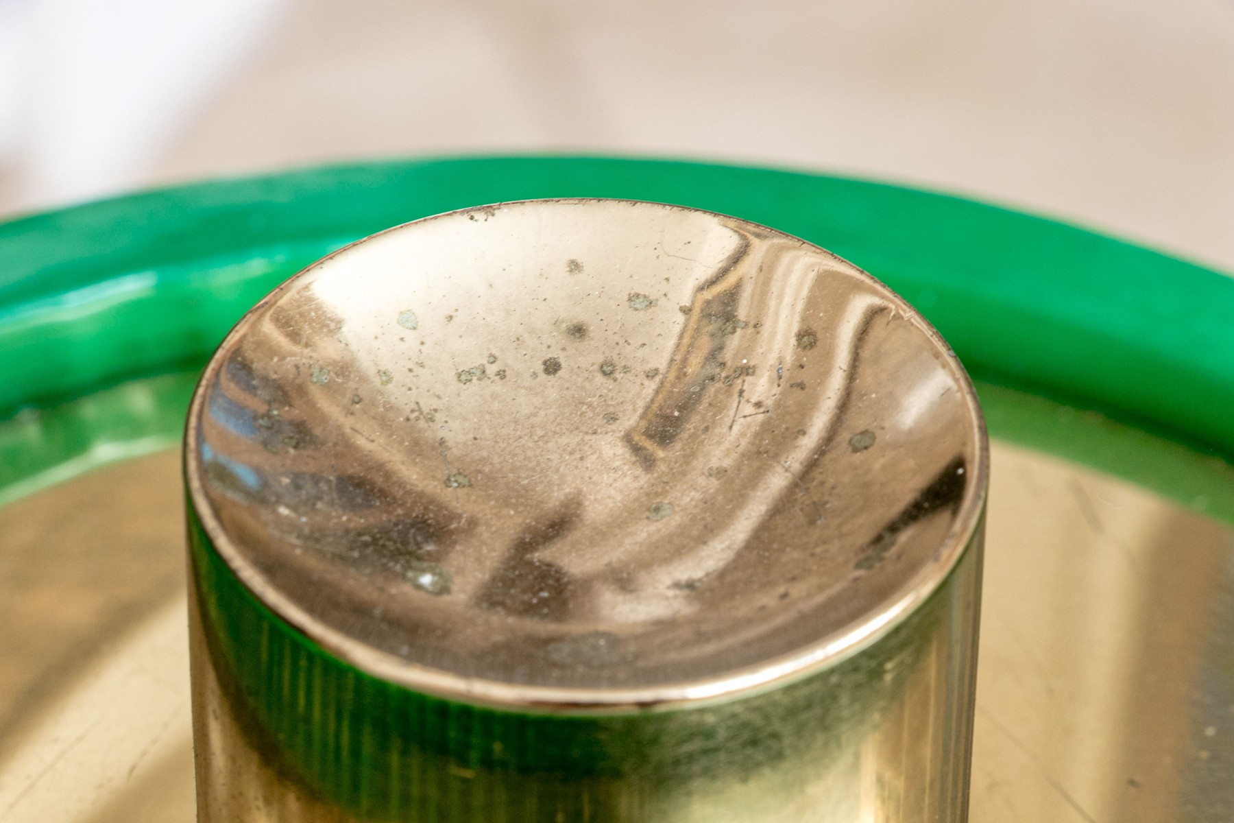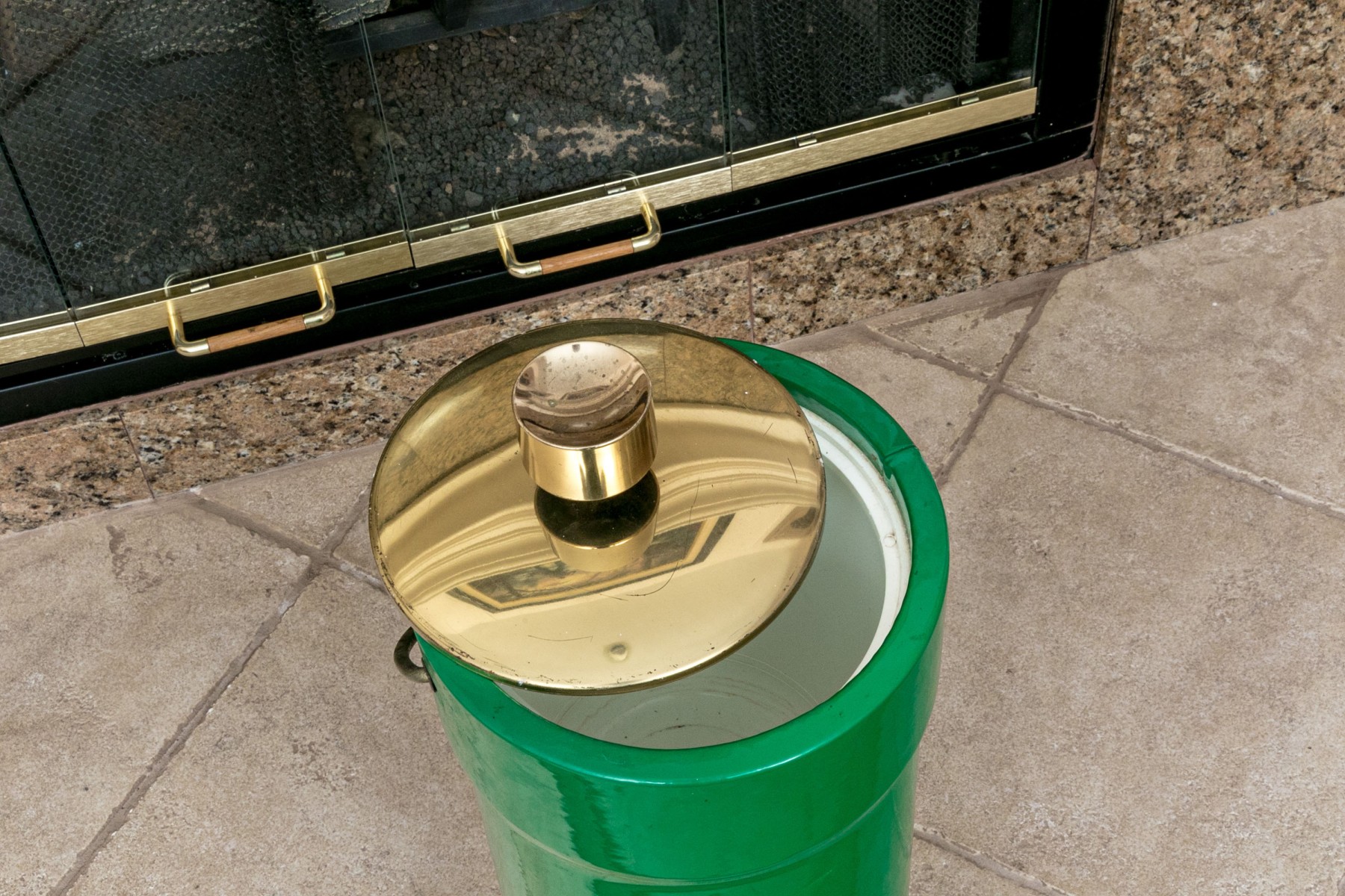 A fabulous, vintage Morgan Designs Bucket Brigade wine cooler in tall, cylindrical form with a striking, vibrant green exterior and a white interior. Topped with a brasstone handle and lid, lending a stylish mid-century modern and Hollywood Regency charm.