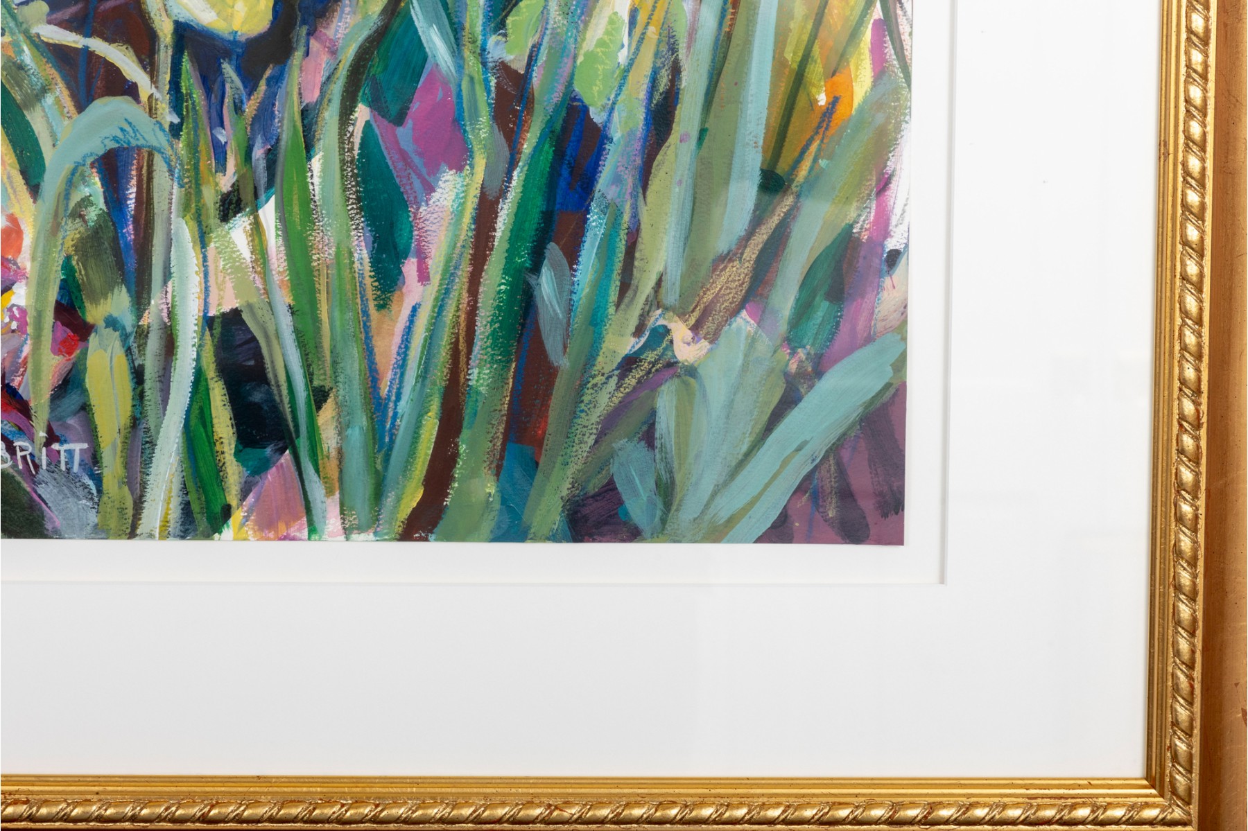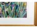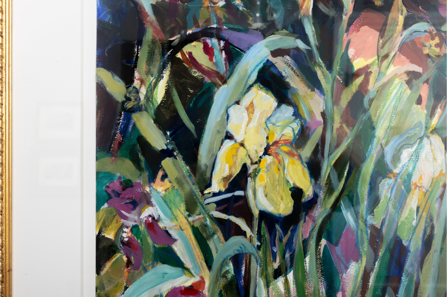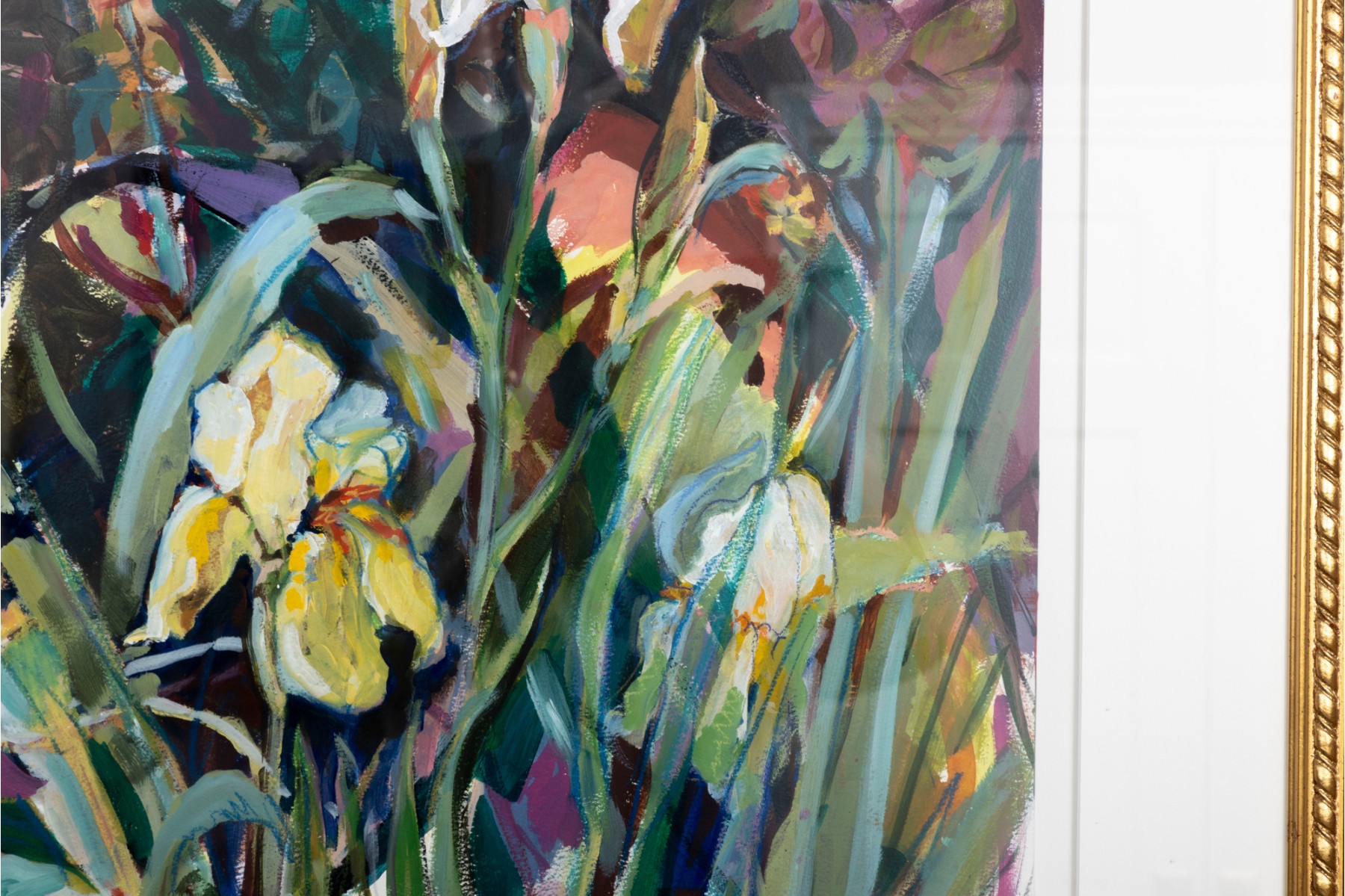An original oil on illustration board painting entitled "Morning Irises in March" by Elizabeth Moretz-Britt. The painting is presented in an ornate gilt-wood frame, protected behind glass and displayed with an overhead light fixture in brass.