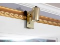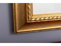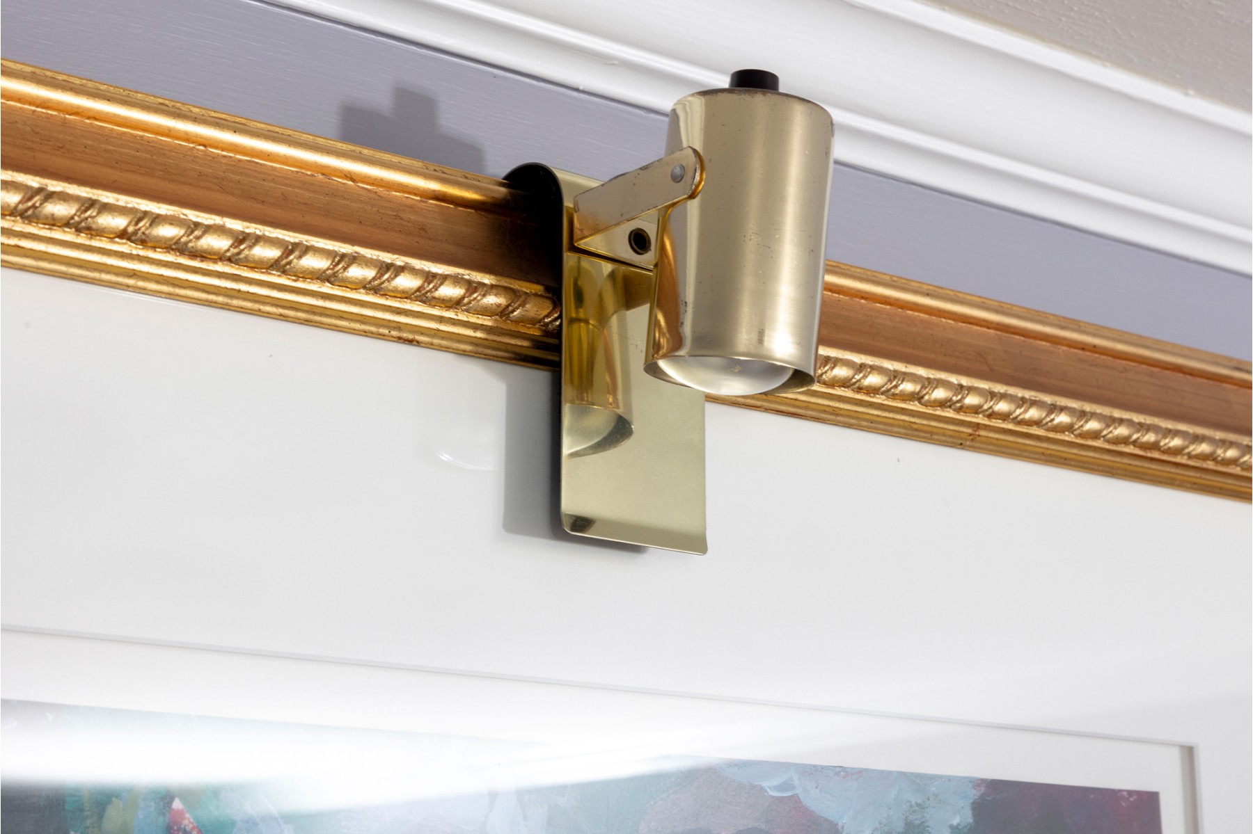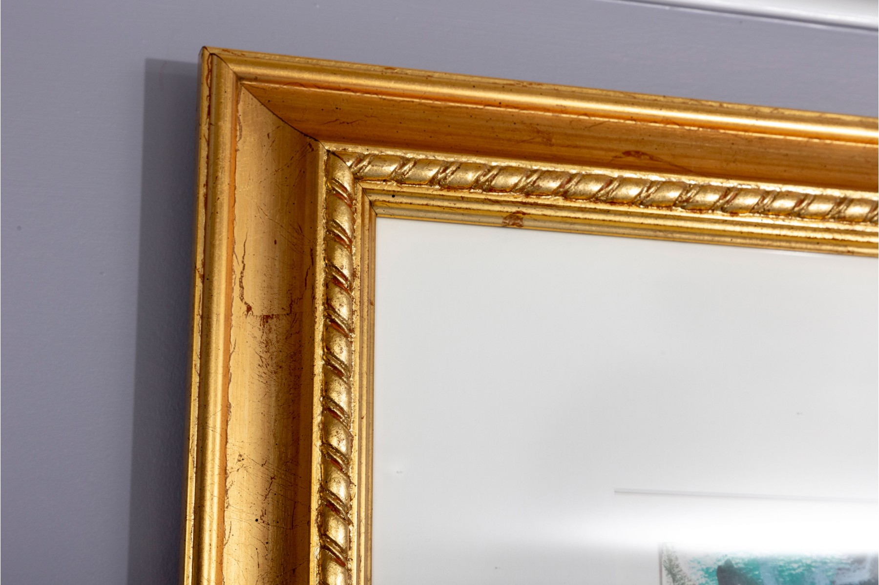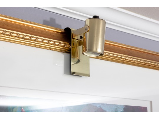 An original oil on illustration board painting entitled "Morning Irises in March" by Elizabeth Moretz-Britt. The painting is presented in an ornate gilt-wood frame, protected behind glass and displayed with an overhead light fixture in brass.