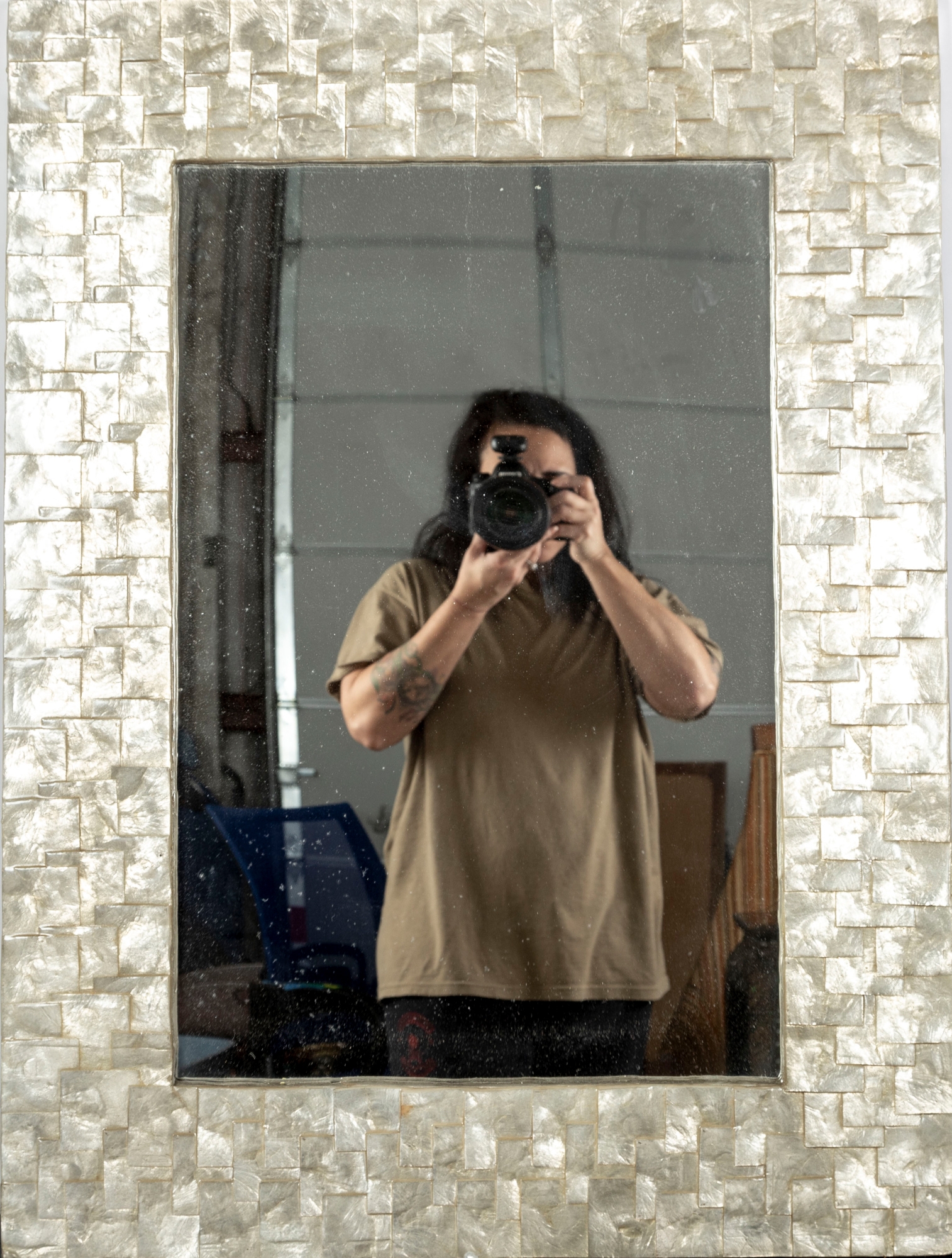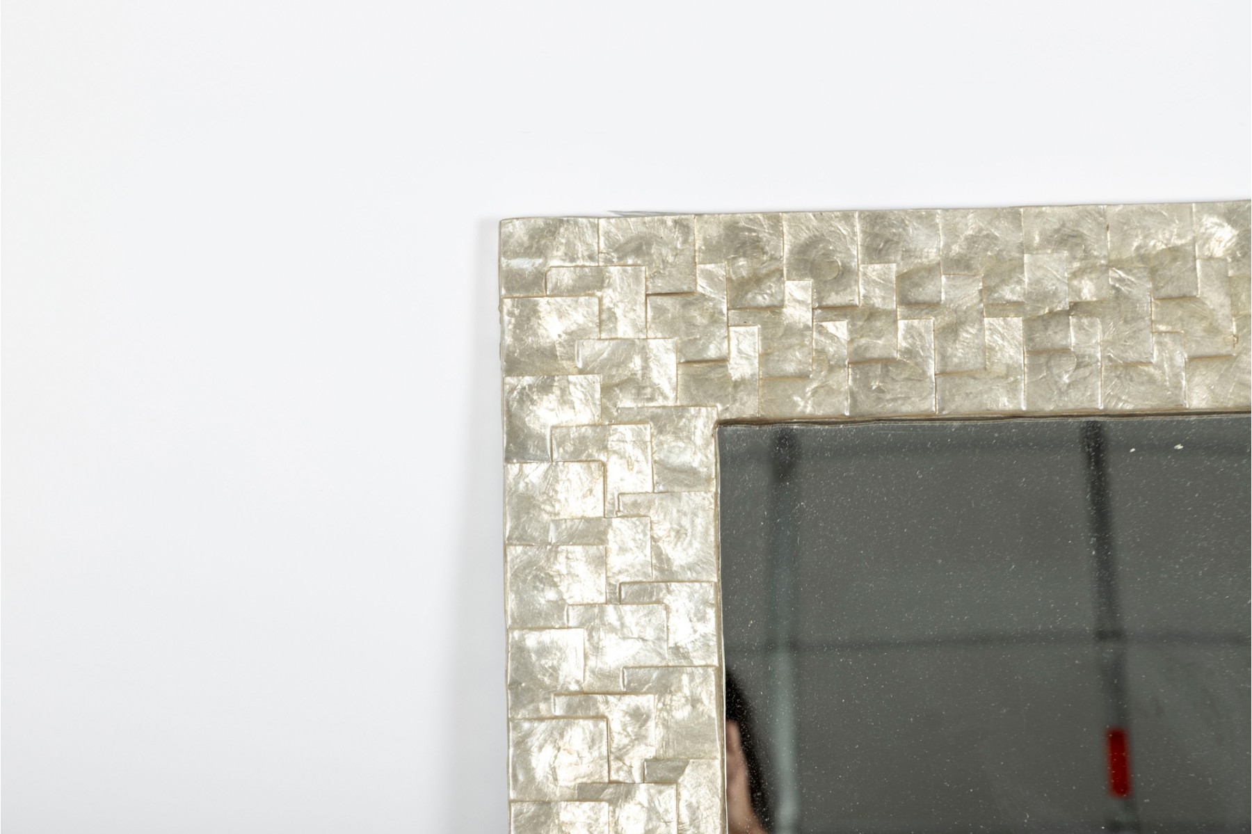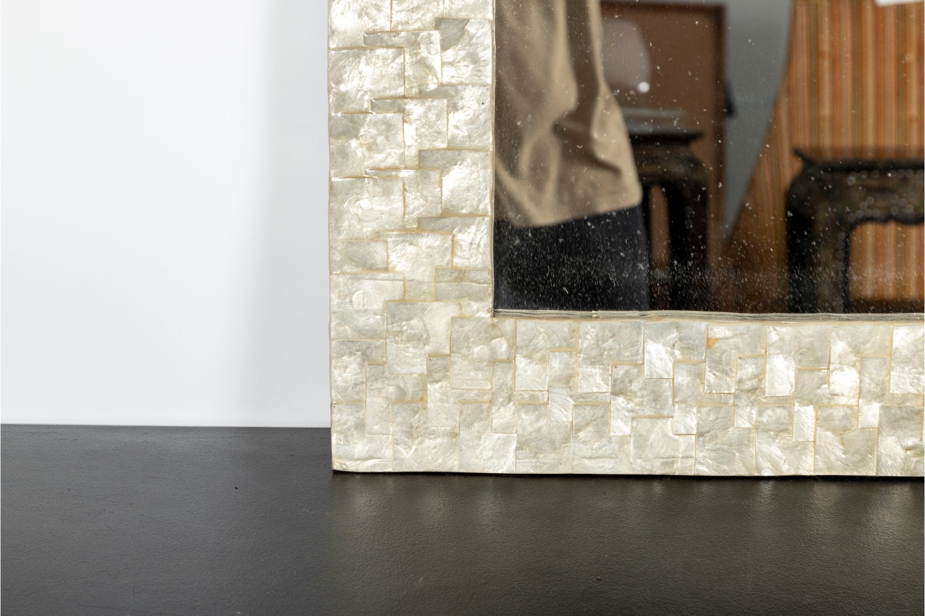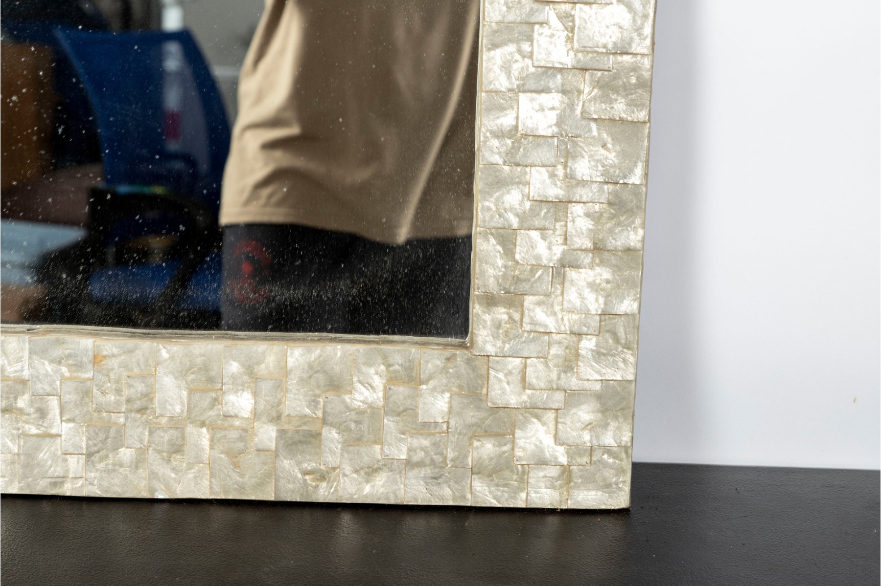 A mother-of-pearl mosaic mirror featuring a frame intricately crafted from iridescent shell pieces arranged in a delicate, shimmering pattern.