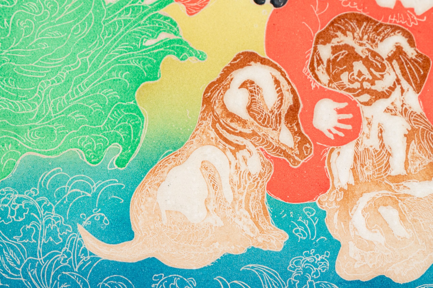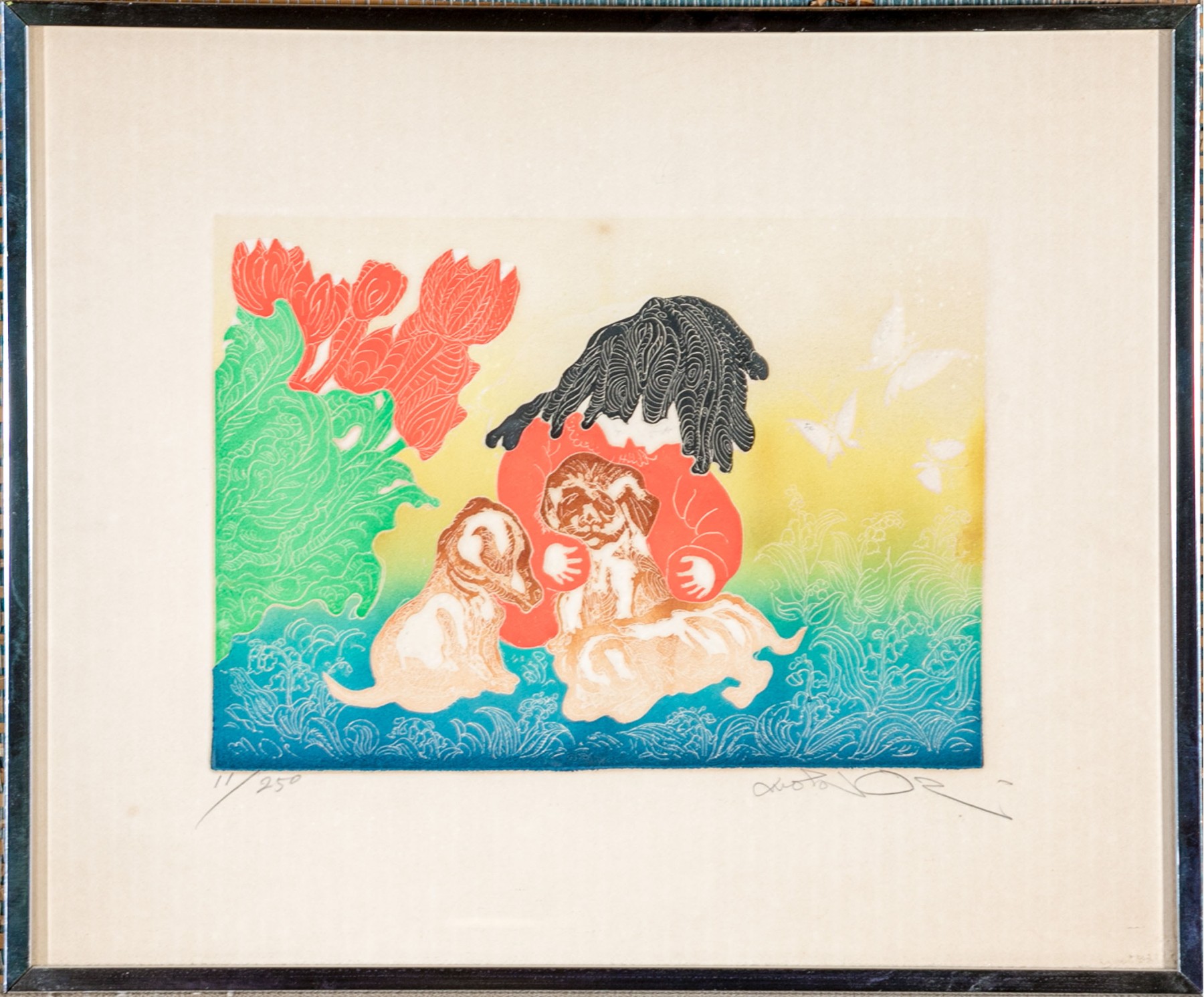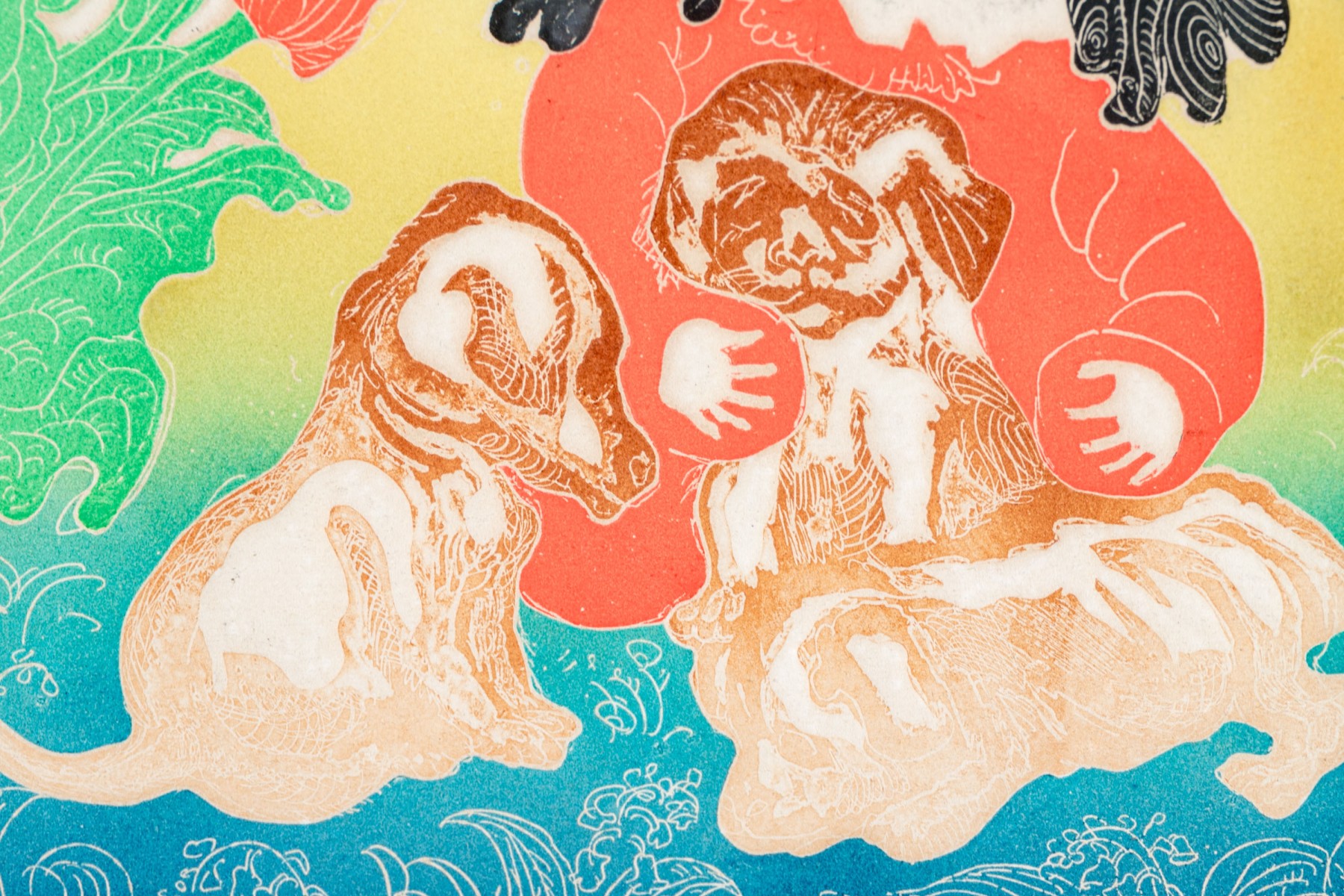 Woodblock print depicting a woodblock print with a seated little girl playing with puppies.