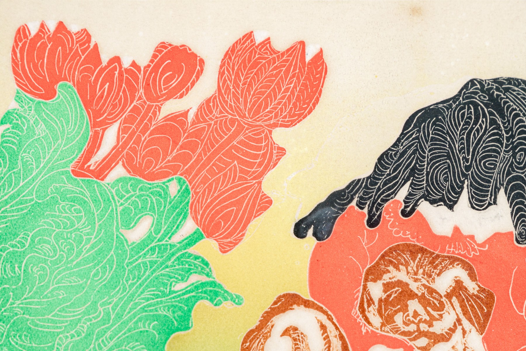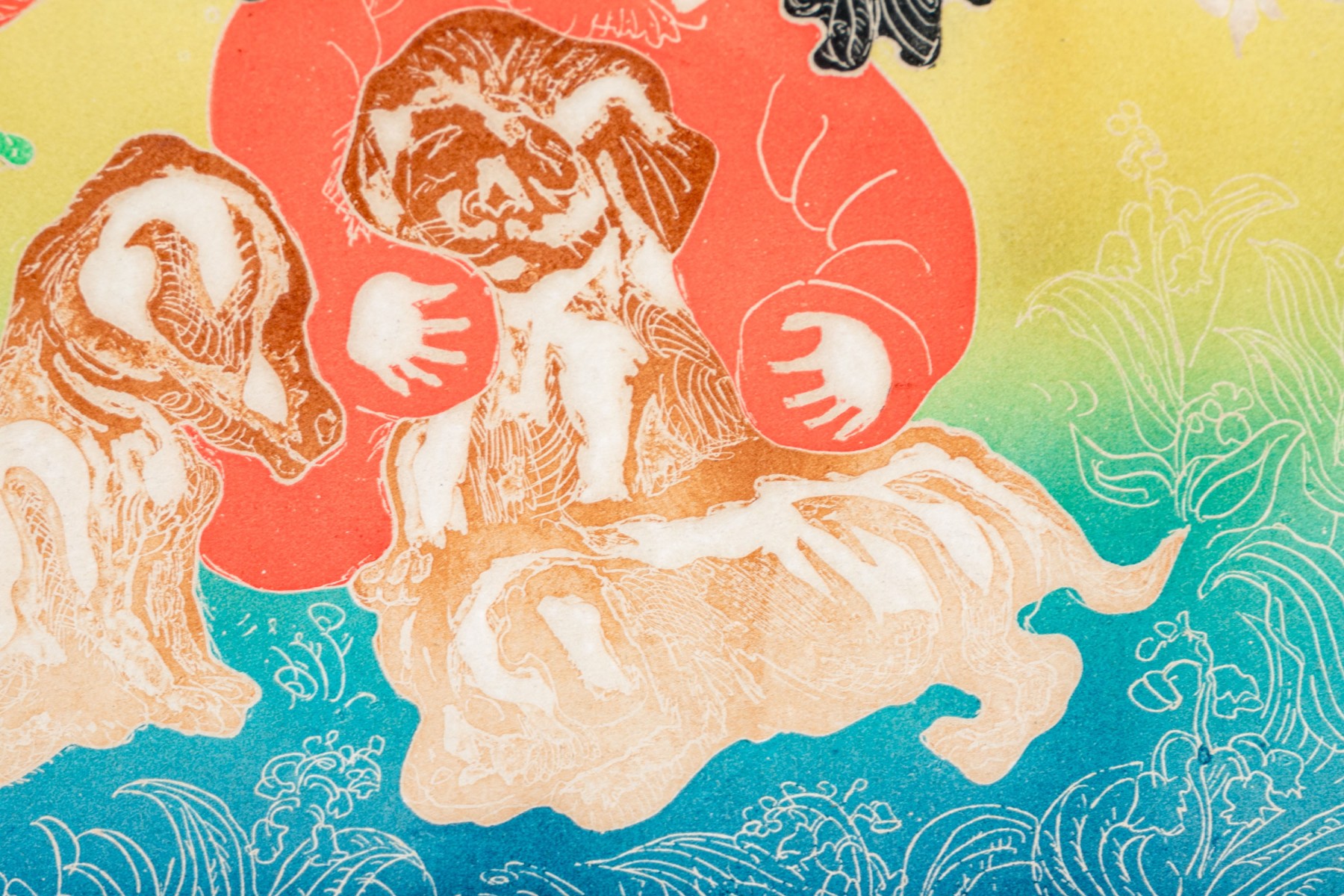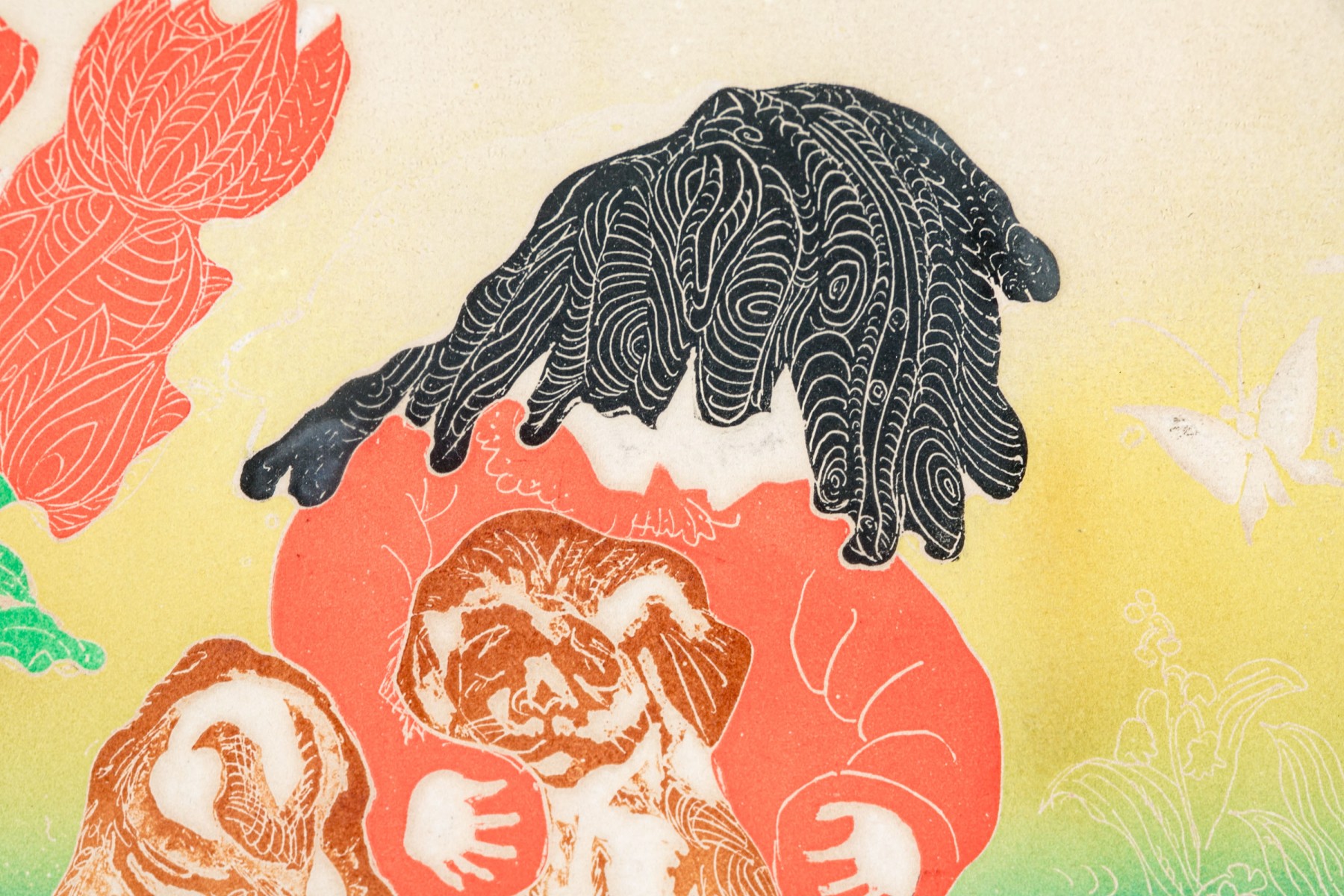 Woodblock print depicting a woodblock print with a seated little girl playing with puppies.