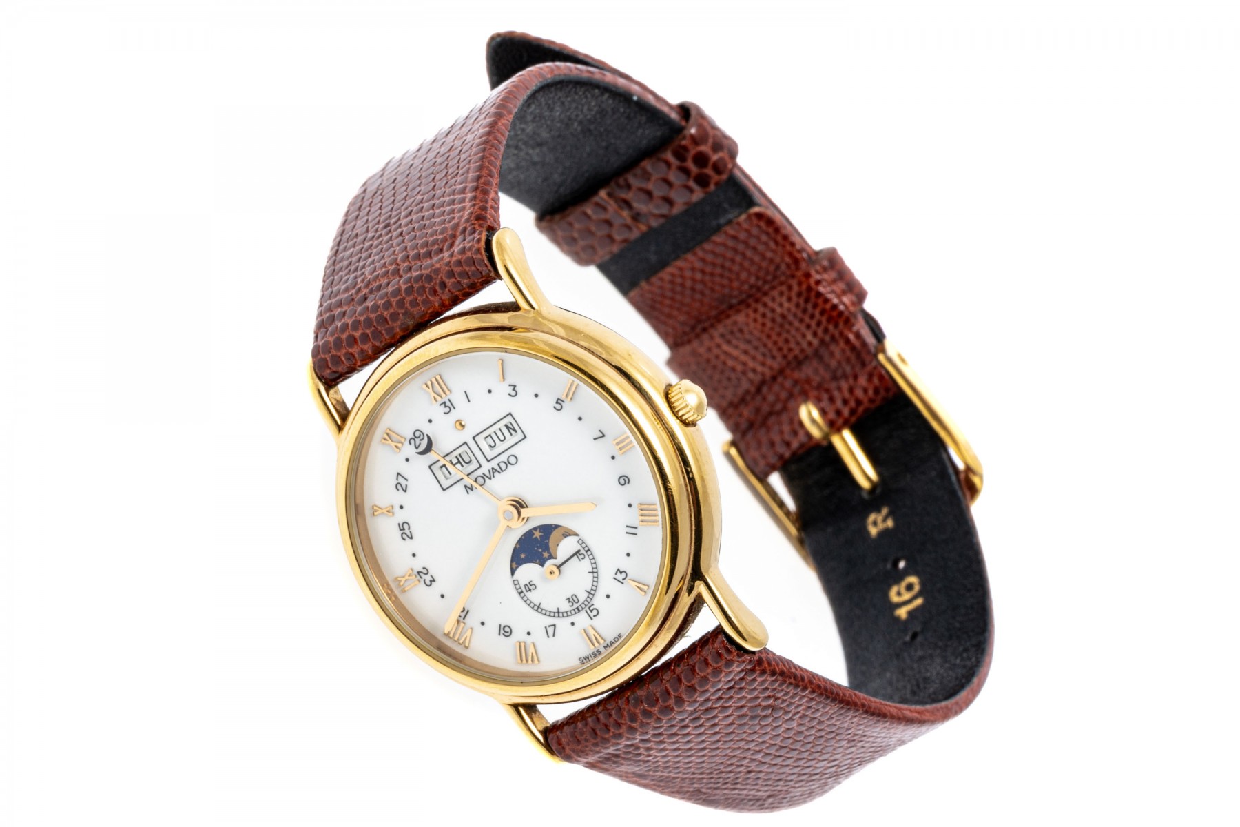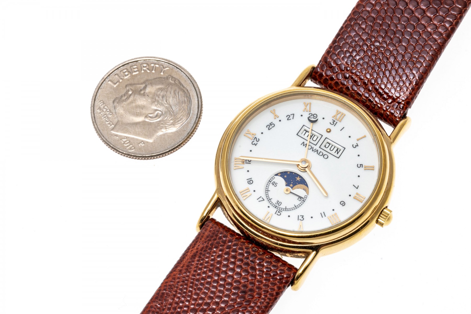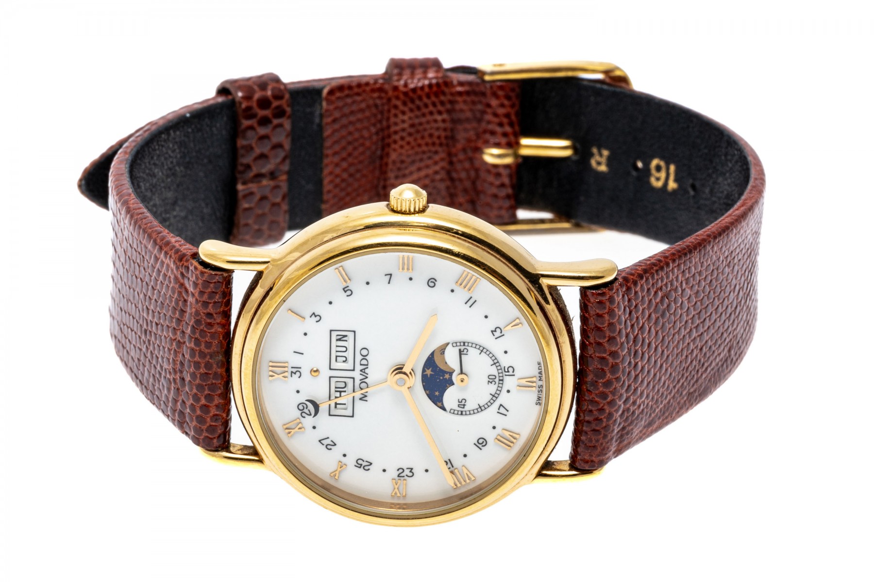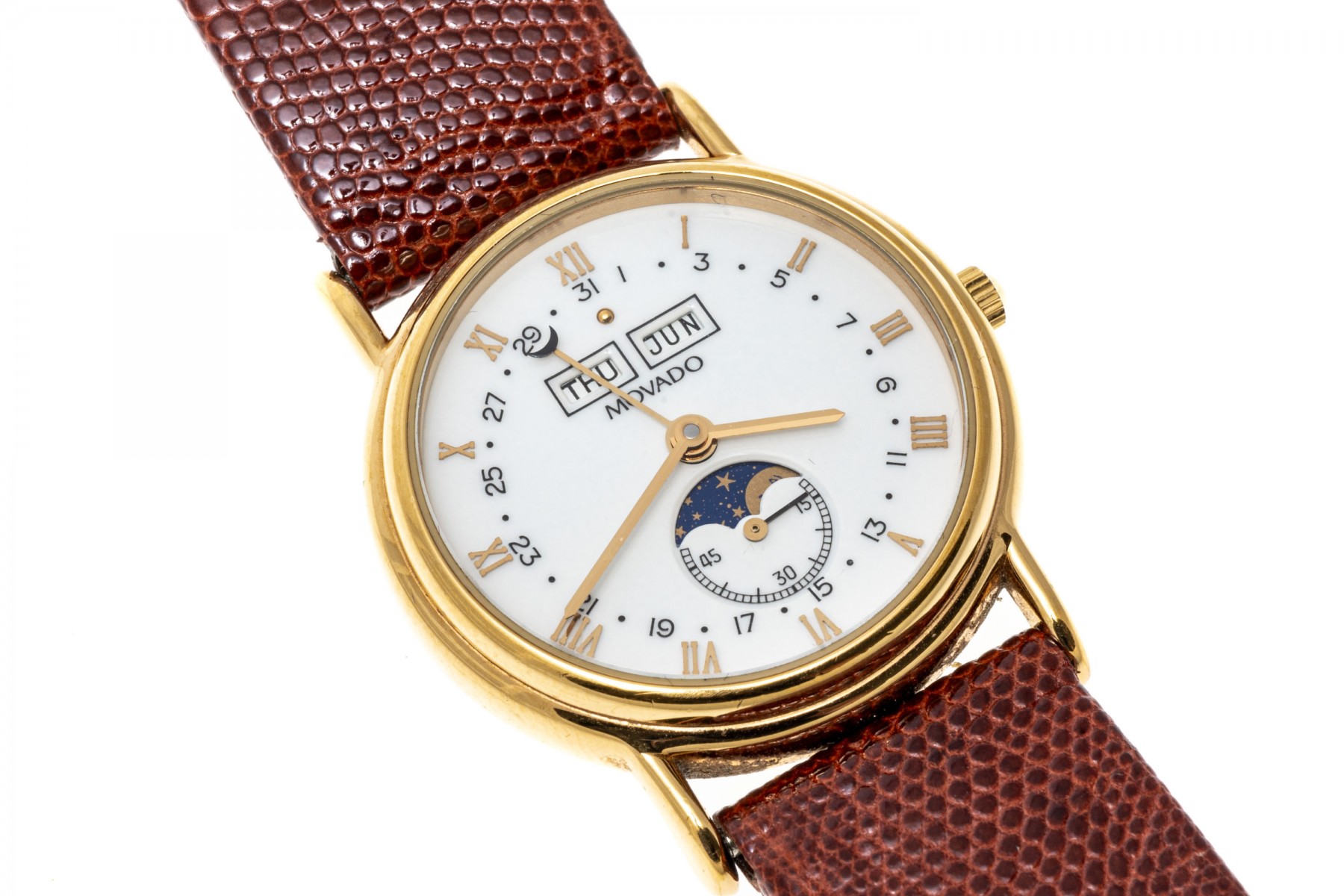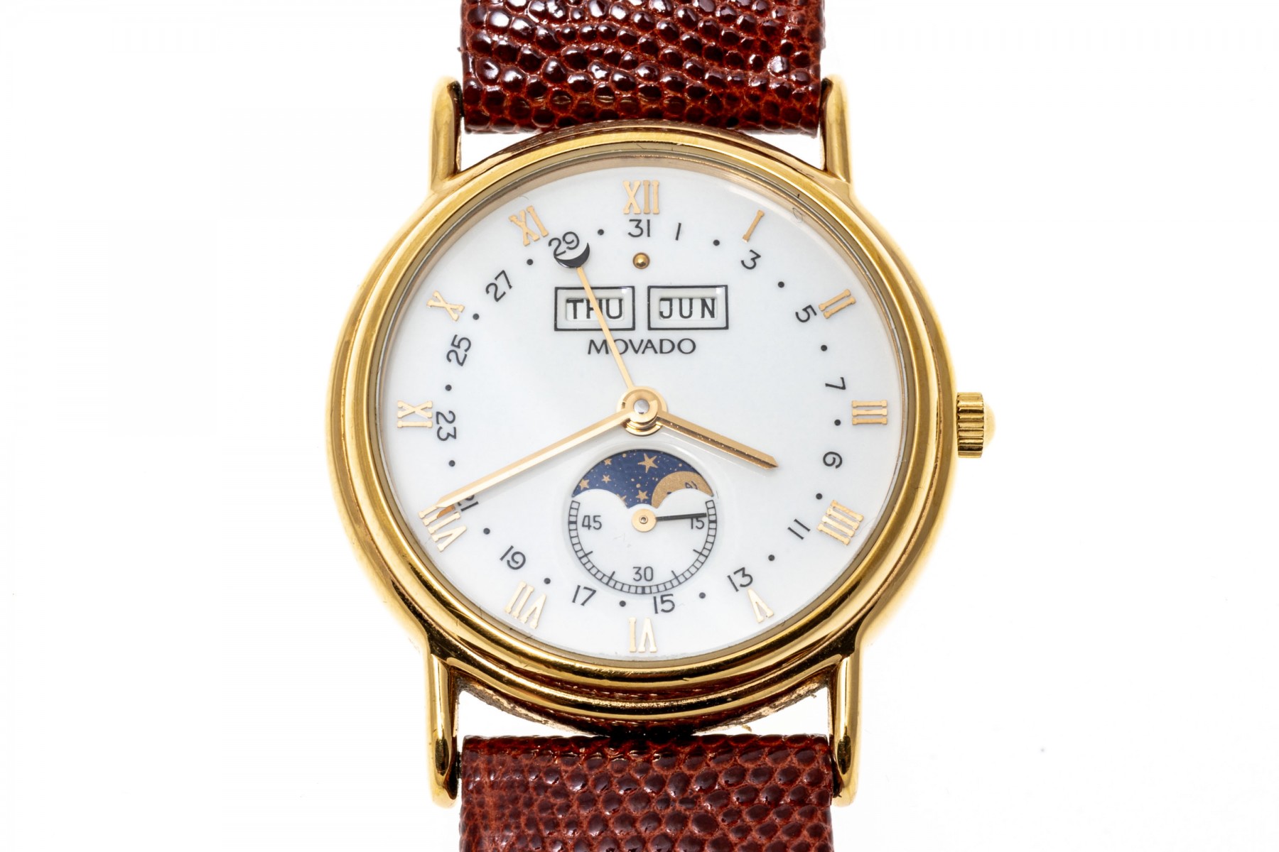 A Movado quartz watch. This watch features day, date, month and moon complications. Roman numeral indices with centered hour and minute hands. Finished with a strap with generic gold plated ardillon buckle