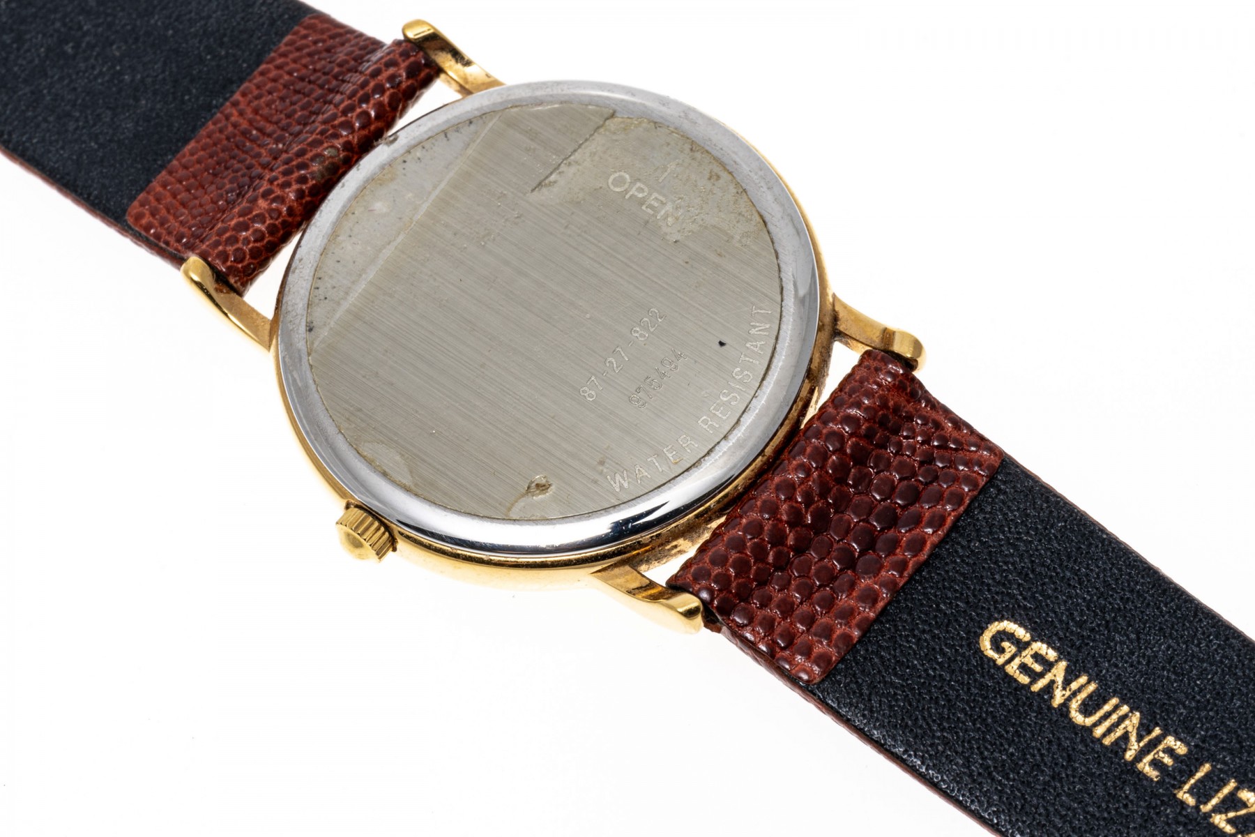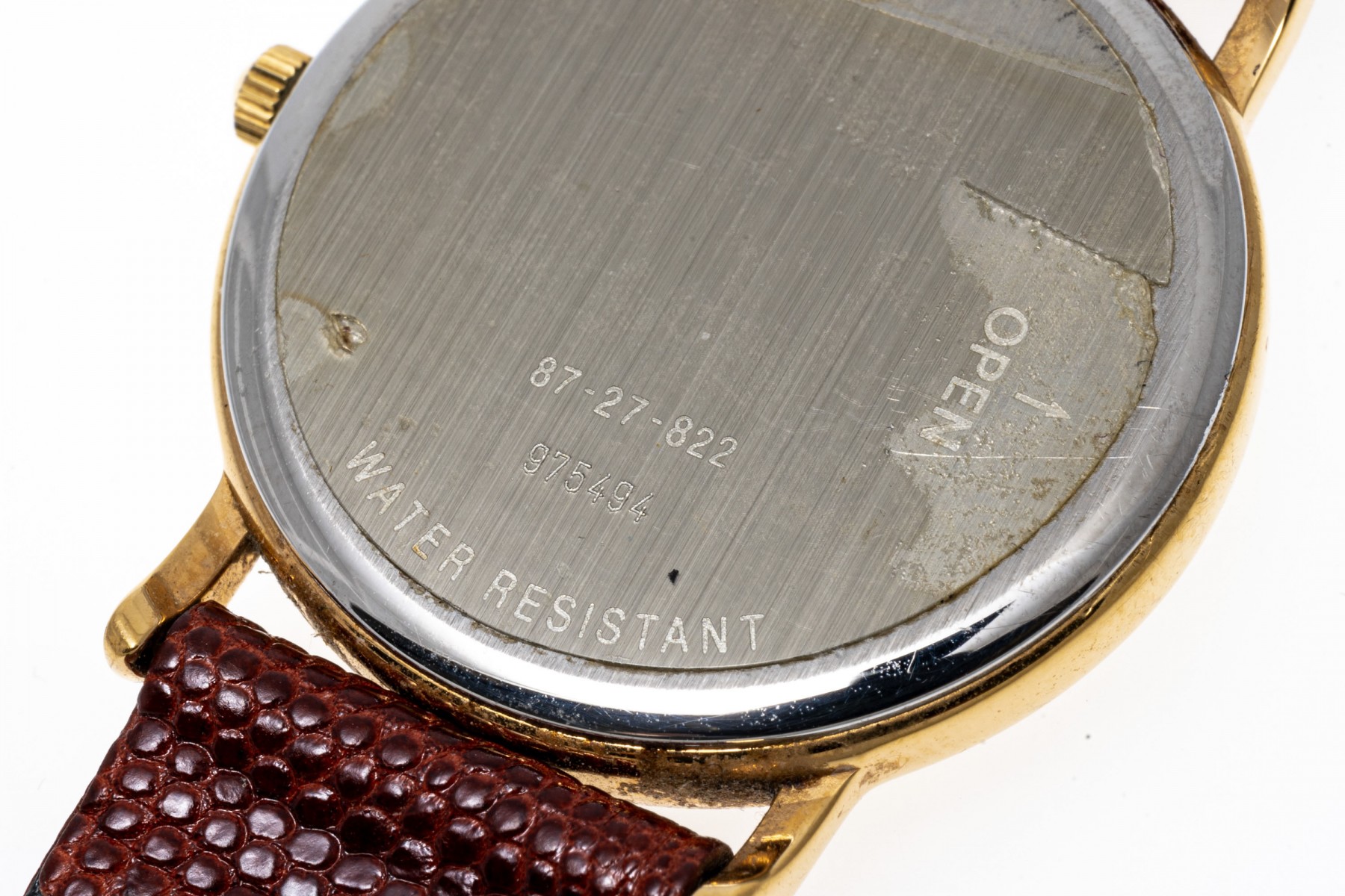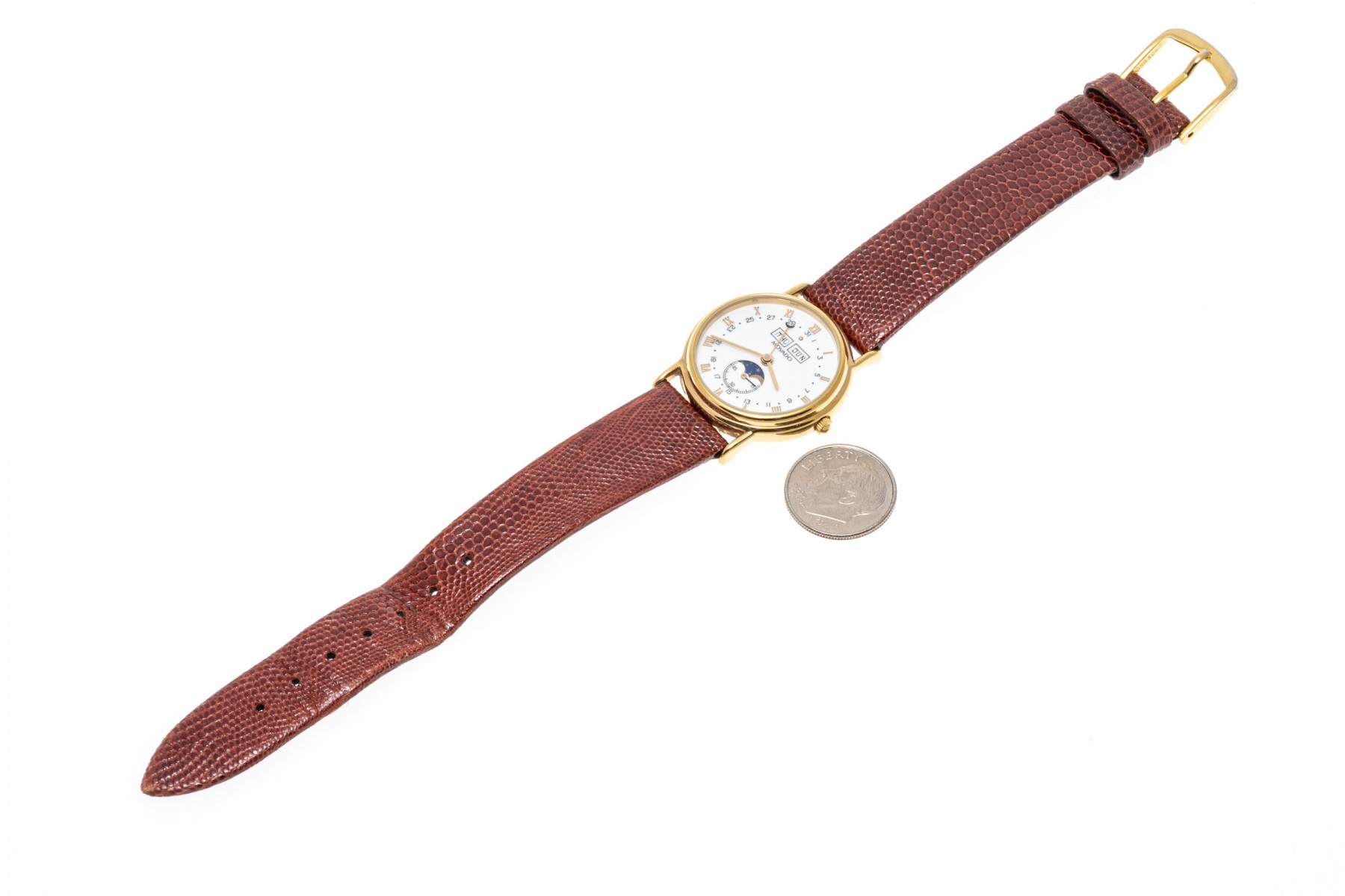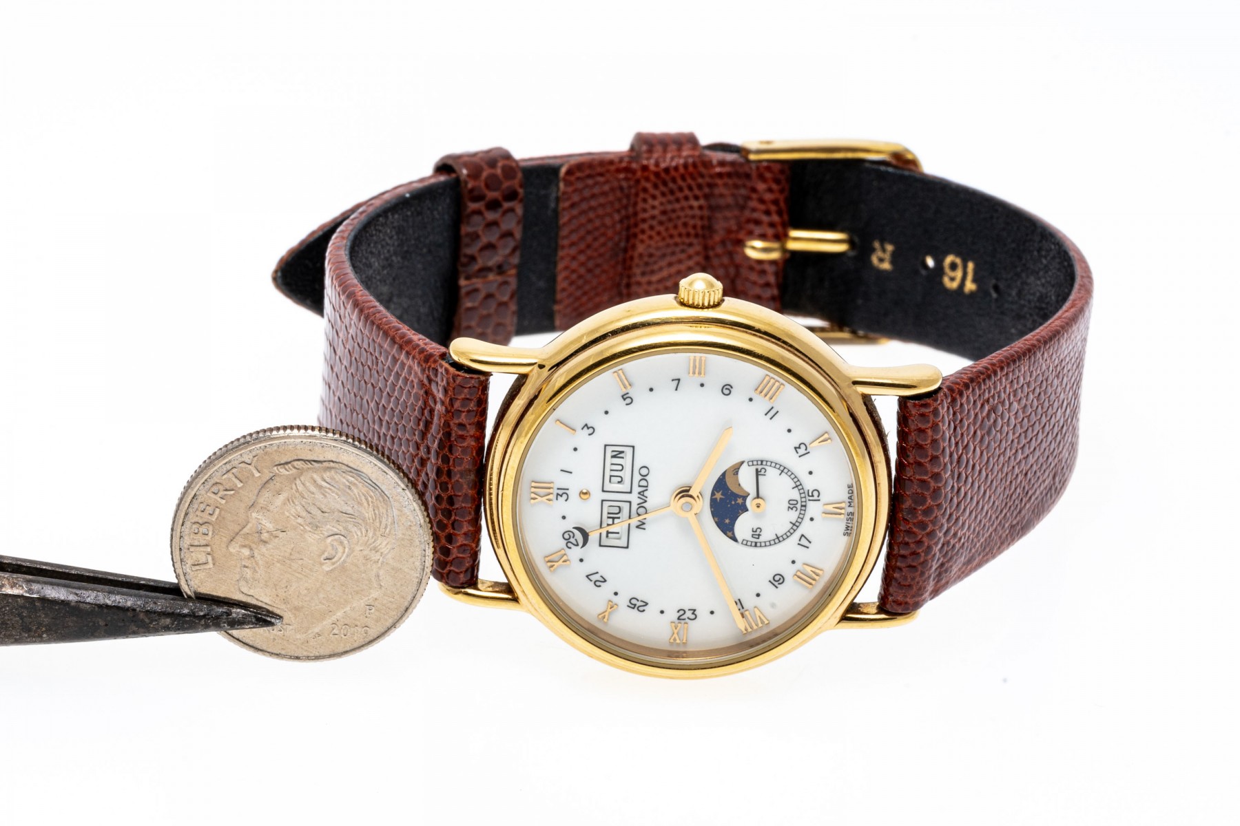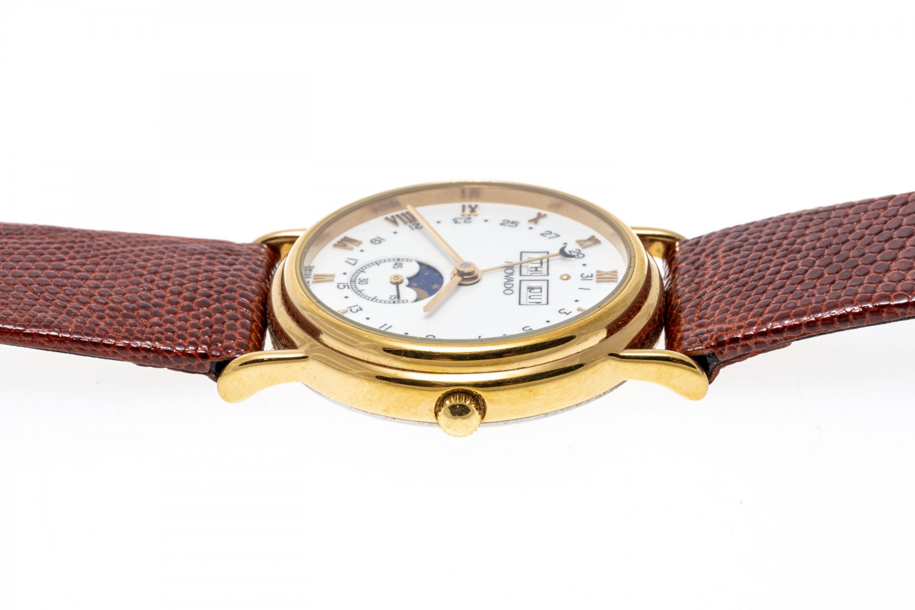 A Movado quartz watch. This watch features day, date, month and moon complications. Roman numeral indices with centered hour and minute hands. Finished with a strap with generic gold plated ardillon buckle