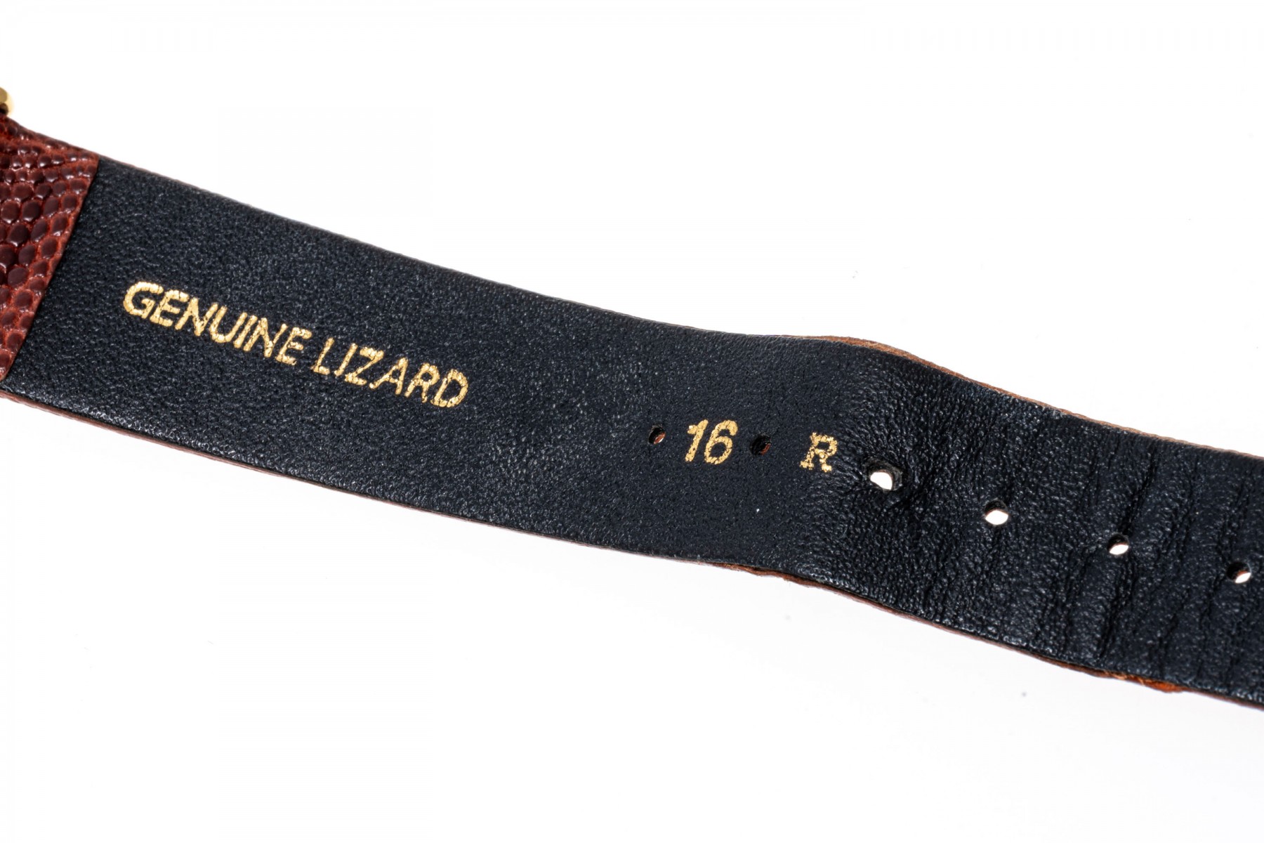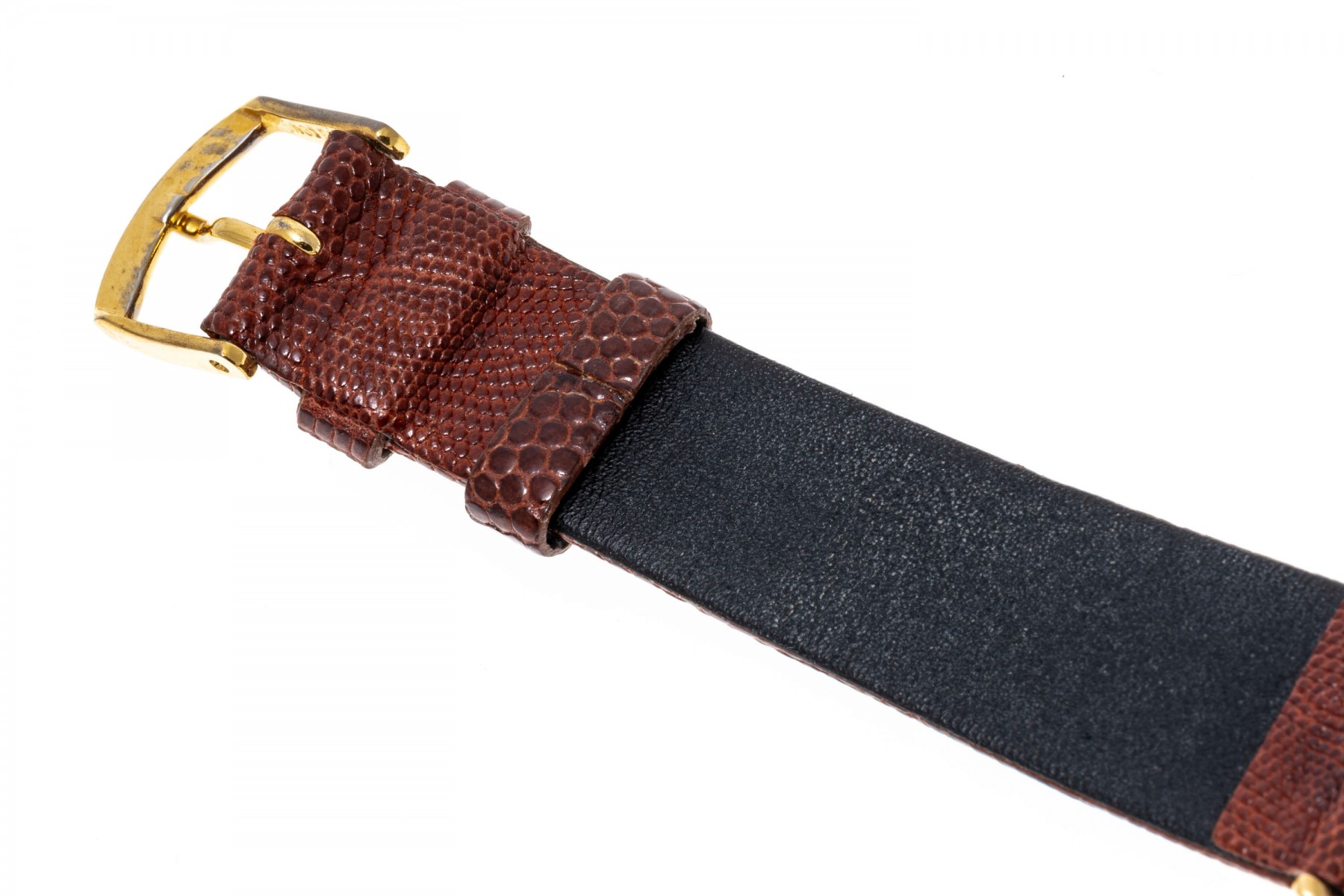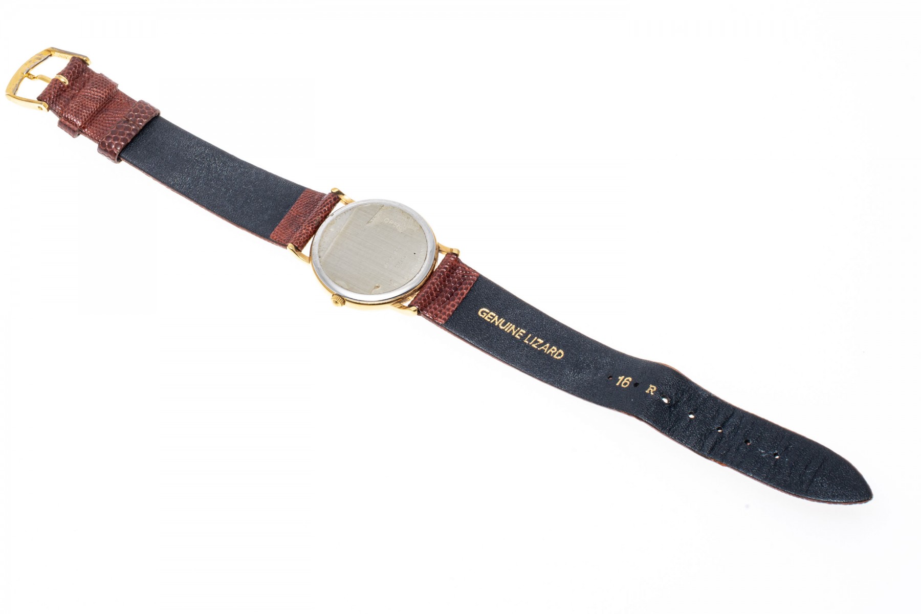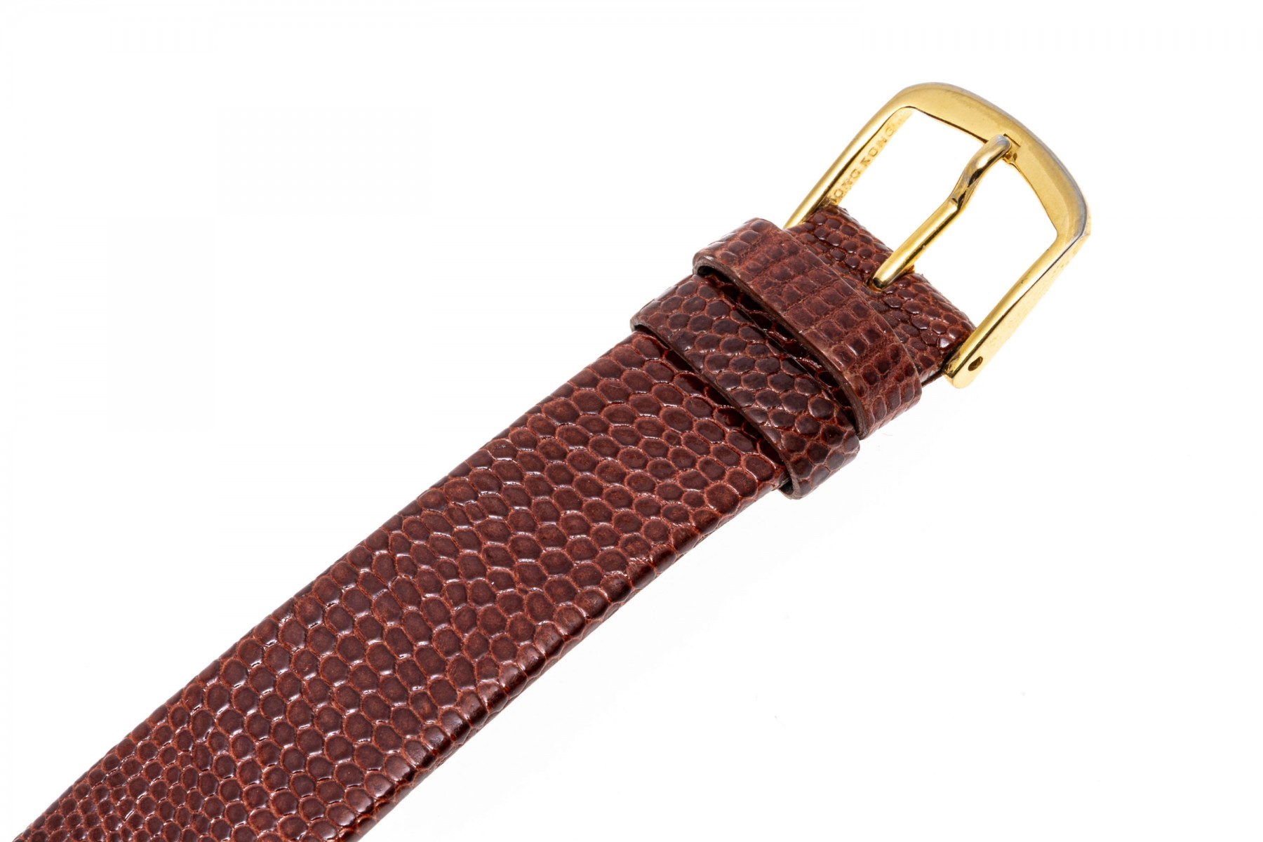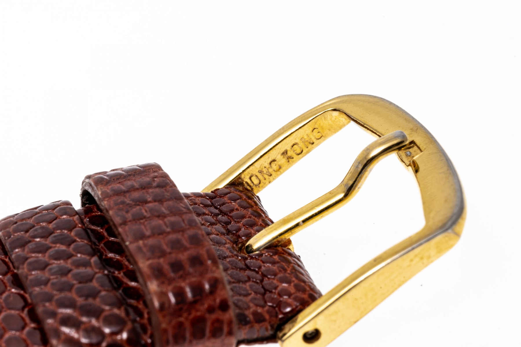 A Movado quartz watch. This watch features day, date, month and moon complications. Roman numeral indices with centered hour and minute hands. Finished with a strap with generic gold plated ardillon buckle